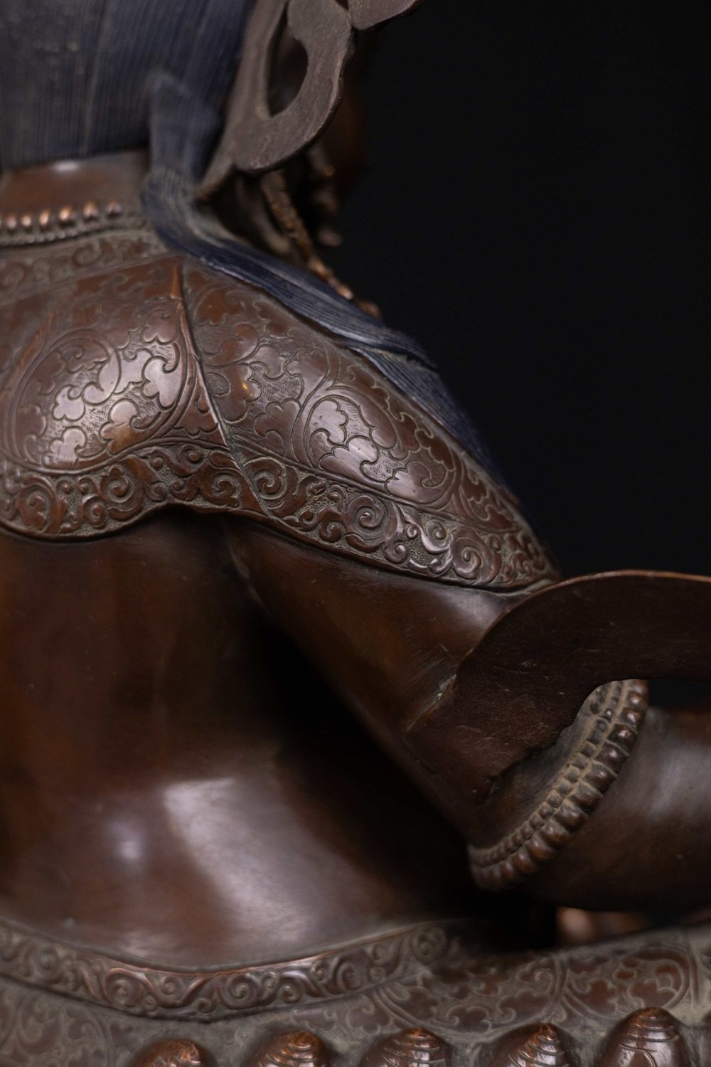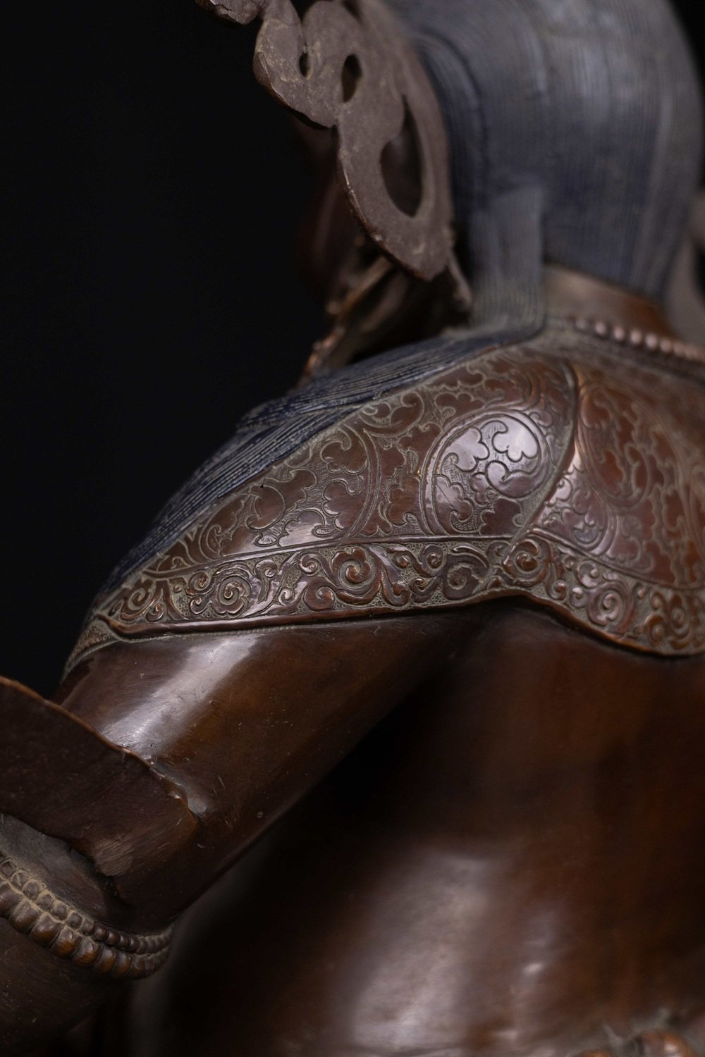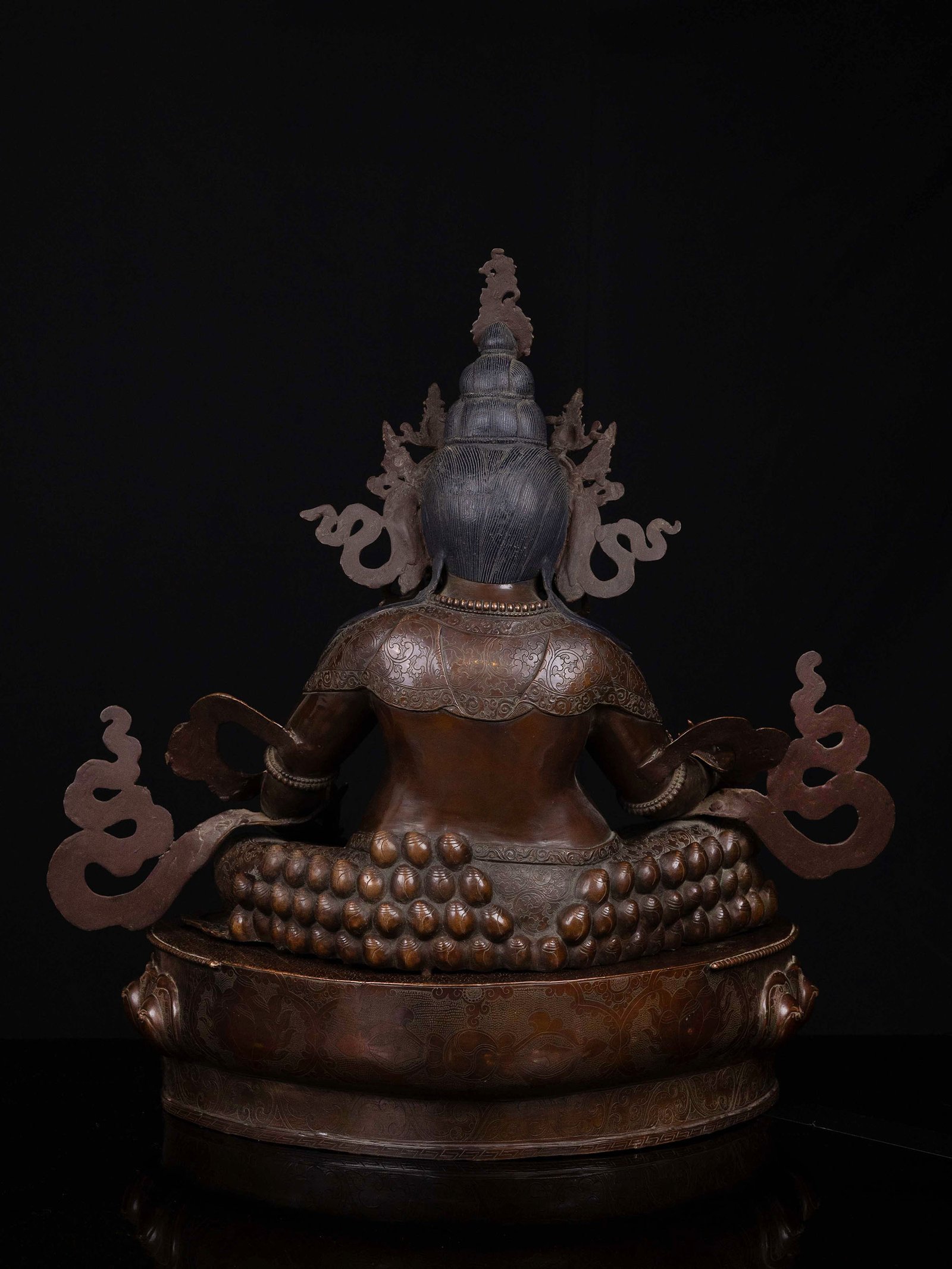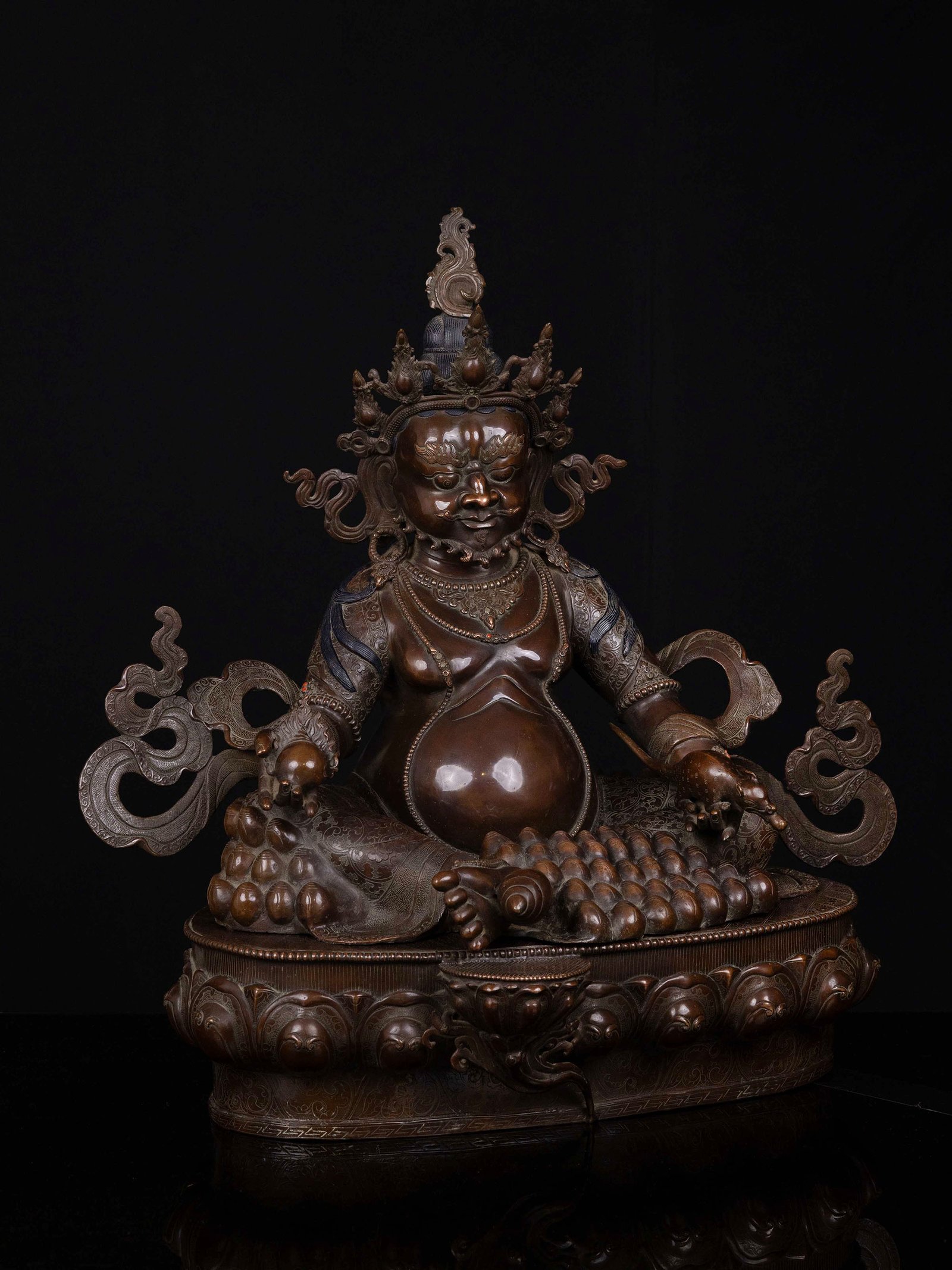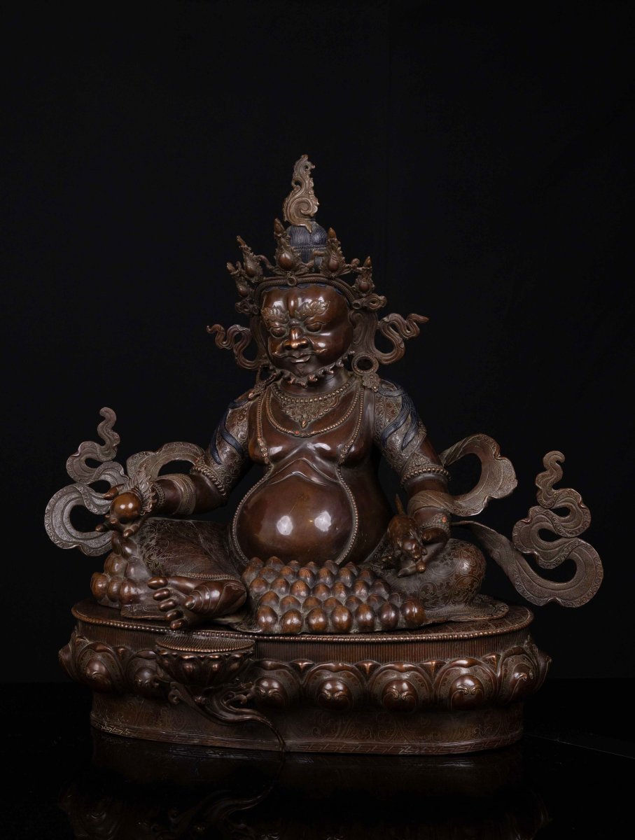 This Yellow Jambhala has been meticulously treated with a chocolate color antique patina. The intention behind this patina is to replicate the appearance of a copper statue that has gracefully aged over a century. Unlike a simple coat of paint, this patina is not applied superficially and is designed to endure. It undergoes an artificial oxidation process that adds depth and character, while also serving as a protective layer against natural oxidation.