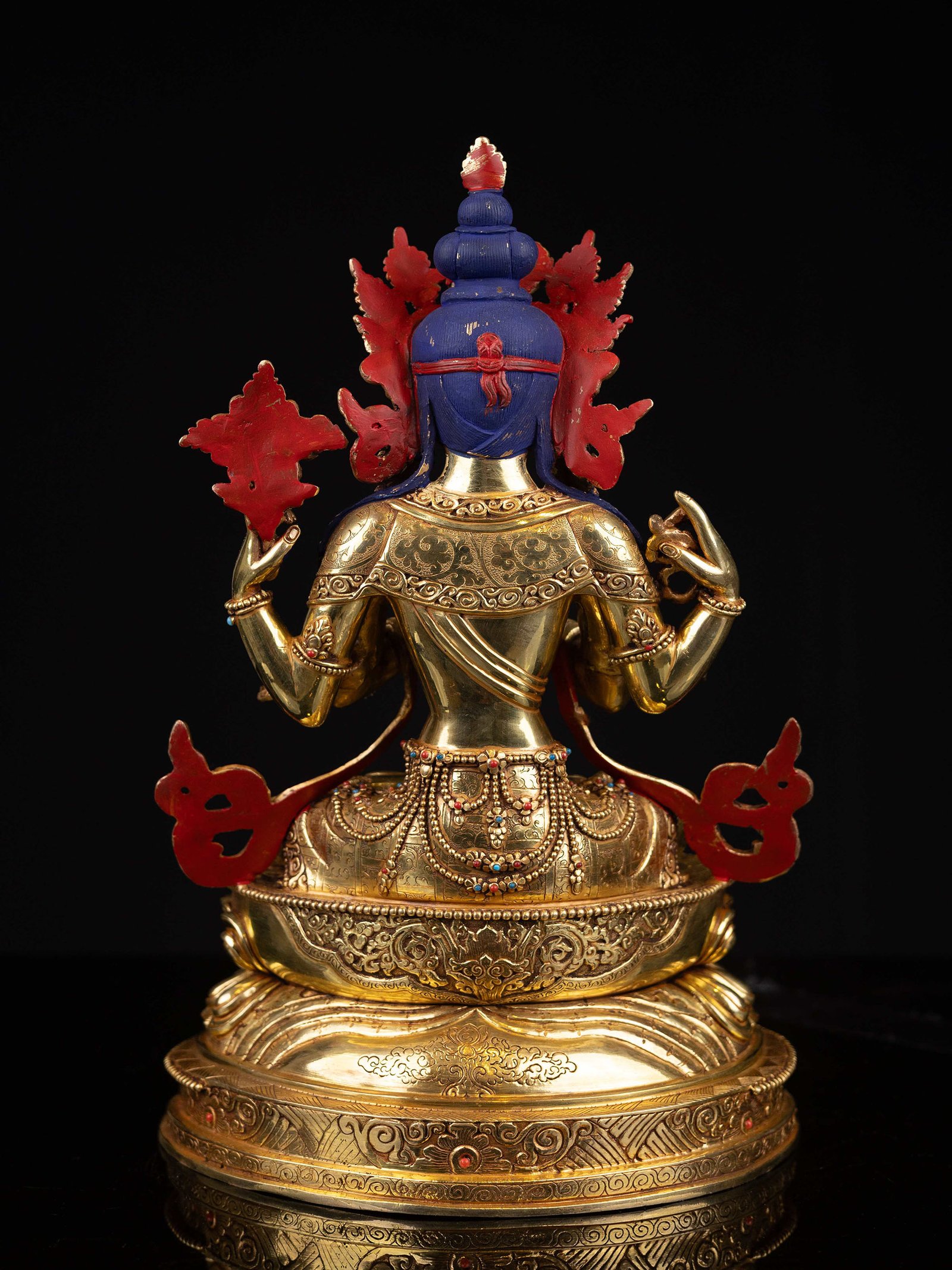 The face of Chenrezig is painted with gold to enhance its significant features, particularly the eyes, and lips. This detailed painting is essential as it brings forth the crucial attributes of the expression of eyes and lips that metal carving alone cannot capture.