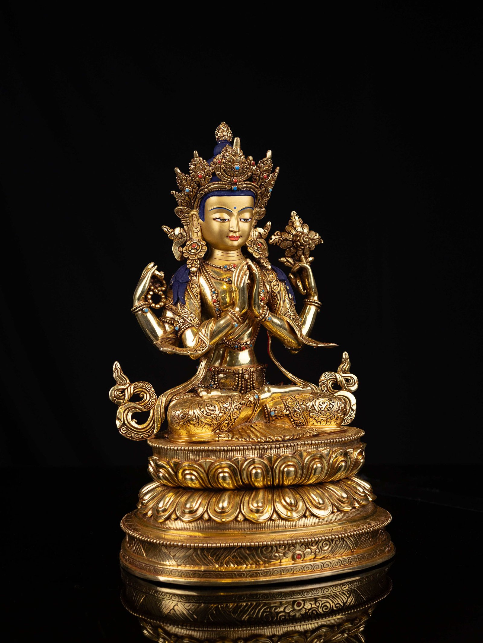 This Chenrezig is finished with full gold plating. also known as mercury gold plating or fire gold plating. This traditional technique involves the application of a genuine layer of gold onto the Chenrezig. Referred to as mercury gold plating, it is considered the correct and authentic form of gold plating in Nepal. Despite being more expensive than electroplating, this traditional mercury gold plating is gaining popularity again in Nepal. People are drawn to its authenticity, longevity, and the unmatched beauty it brings to the Chenrezig. The resurgence of interest in this traditional form of gold plating reflects a growing appreciation for the craftsmanship and cultural heritage of Nepal Read More