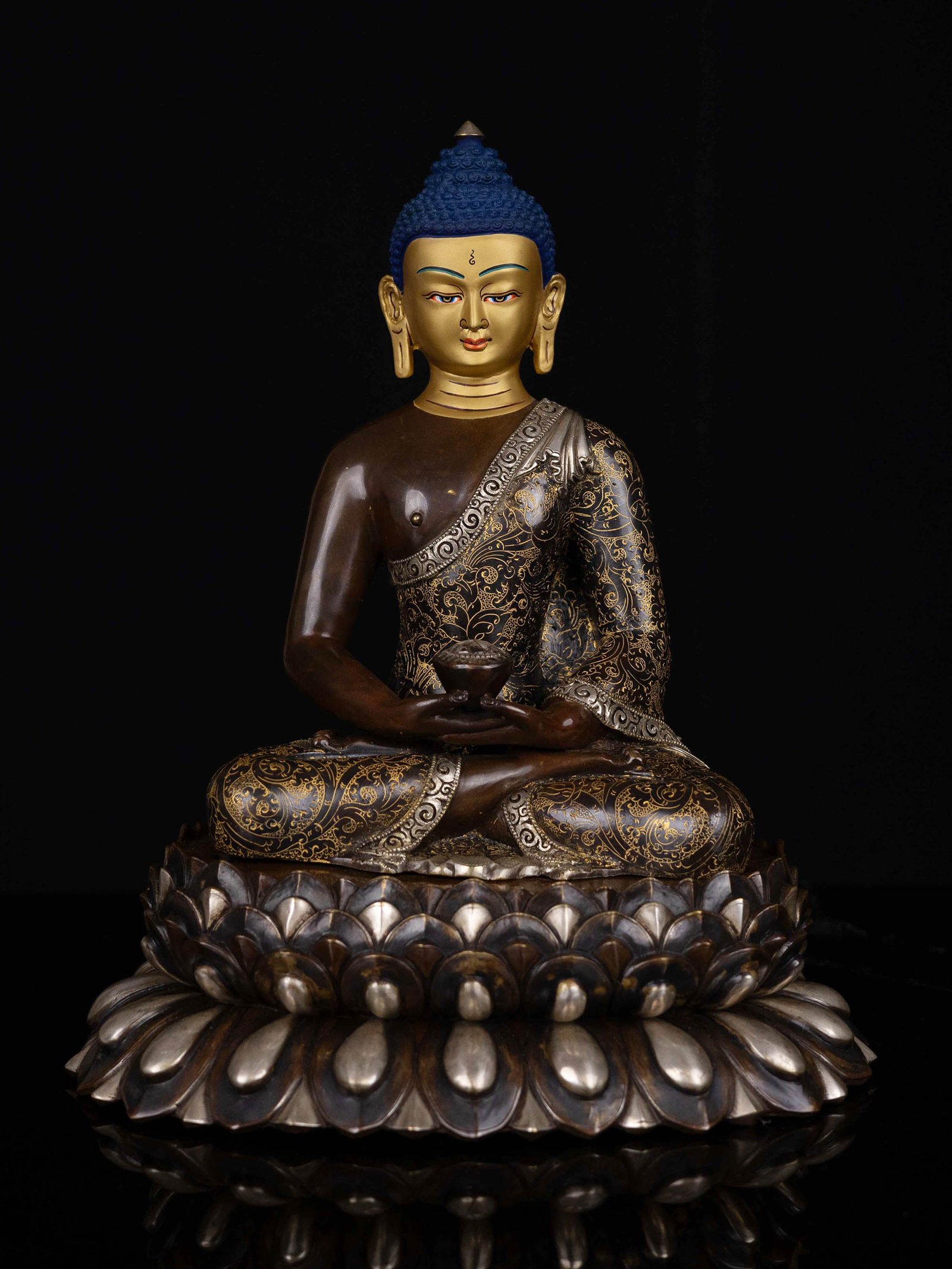 The Amitabha Buddha features a captivating combination of partly silver plating and dark oxidation. This unique finishing technique combines the lustrous shine of silver with the rich, deep tones achieved through oxidation. In the process of creating this finish, selected areas of the Amitabha Buddha are expertly silver-plated, creating a radiant and reflective surface that catches the light. The remaining areas are intentionally oxidized, resulting in a darkened patina that adds depth and character to the piece. Read More