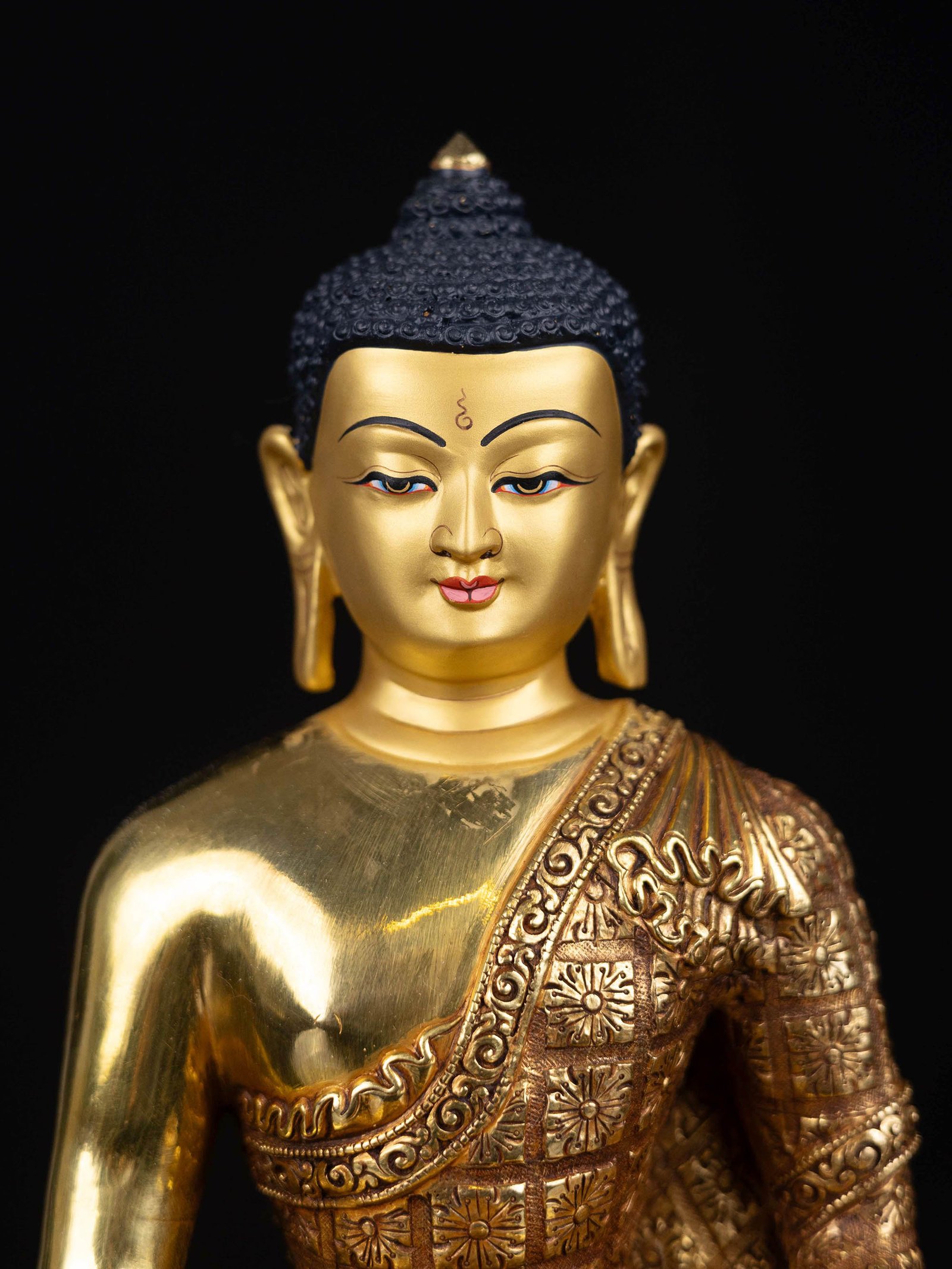 The face of Amitabha Buddha is painted with gold to enhance its significant features, particularly the eyes, and lips. This detailed painting is essential as it brings forth the crucial attributes of the expression of eyes and lips that metal carving alone cannot capture.