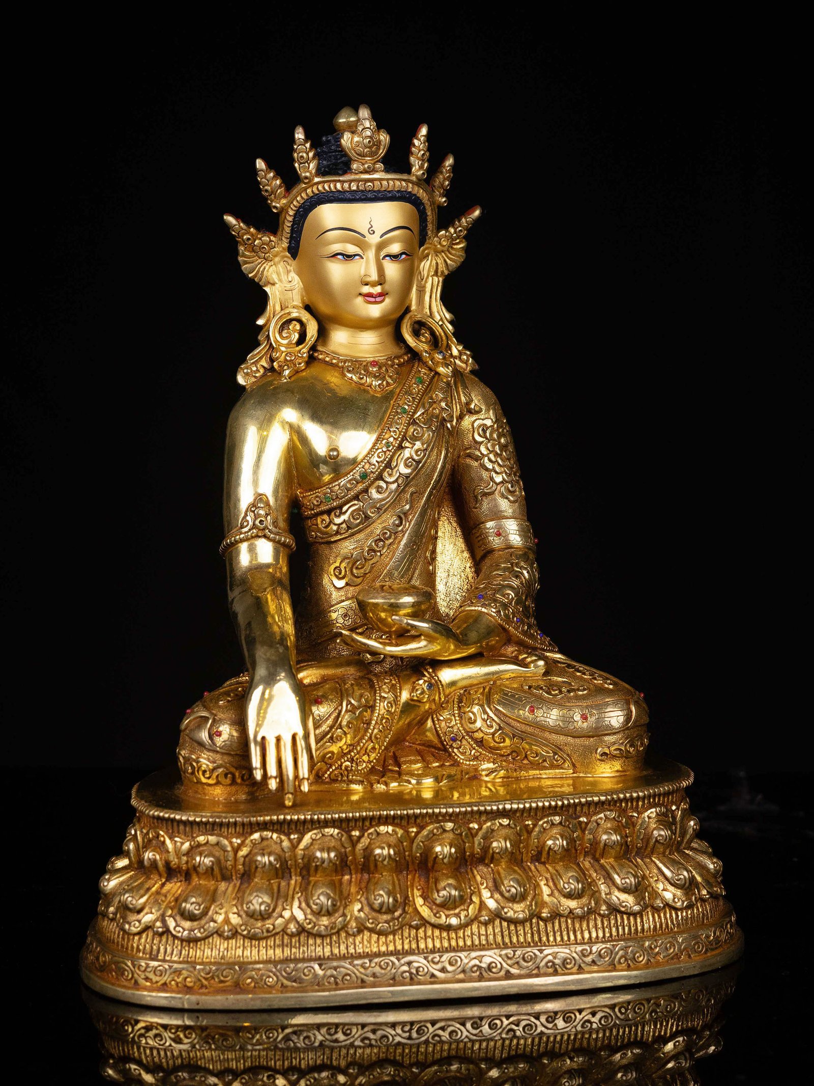 The face of Shakyamuni Buddha is painted with gold to enhance its significant features, particularly the eyes, and lips. This detailed painting is essential as it brings forth the crucial attributes of the expression of eyes and lips that metal carving alone cannot capture.