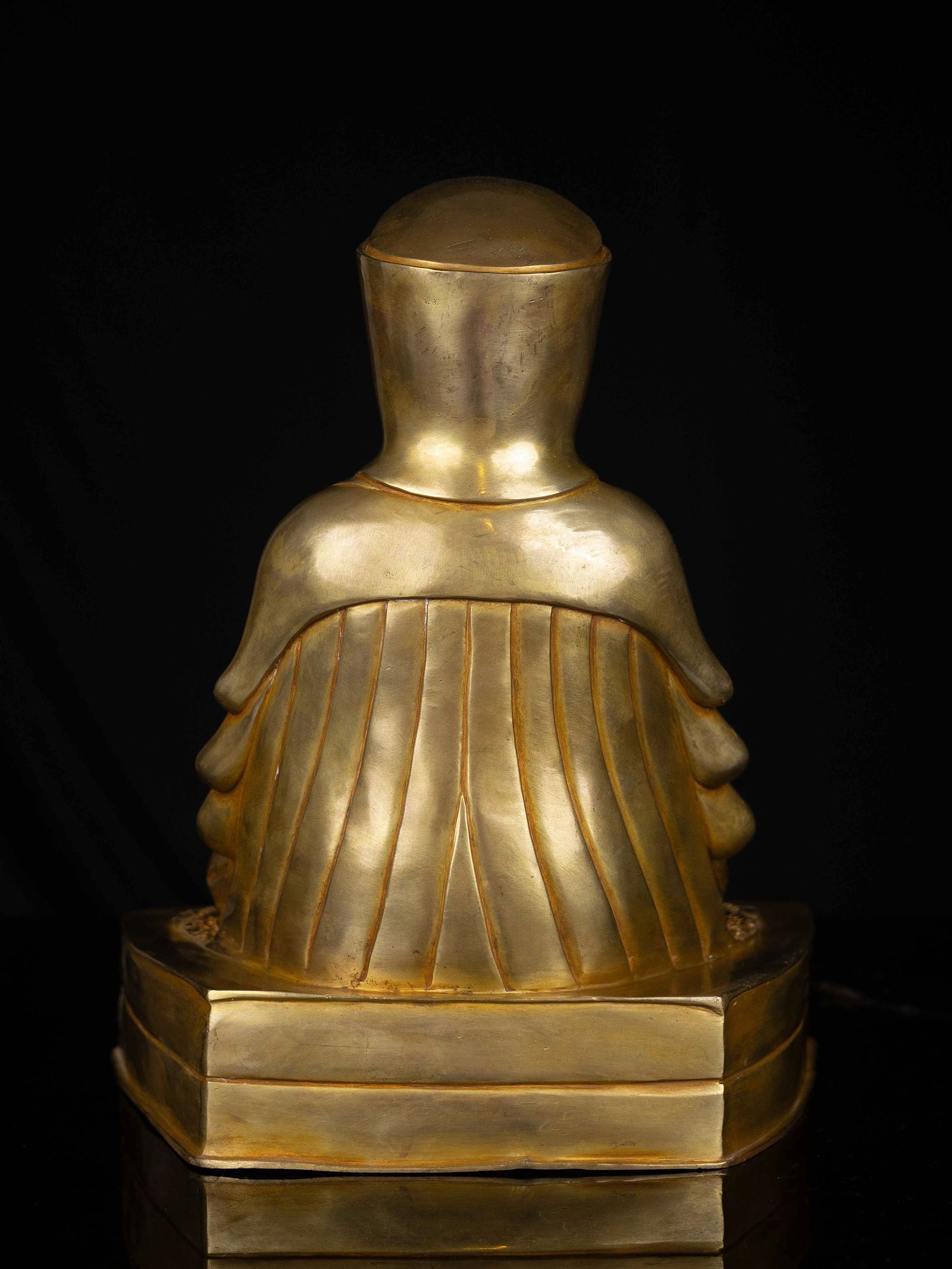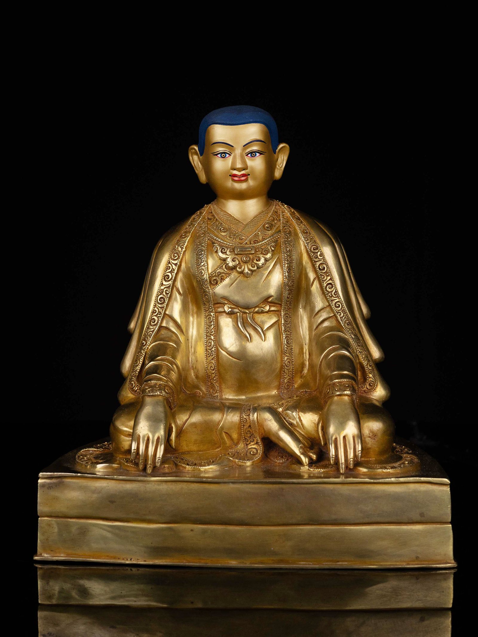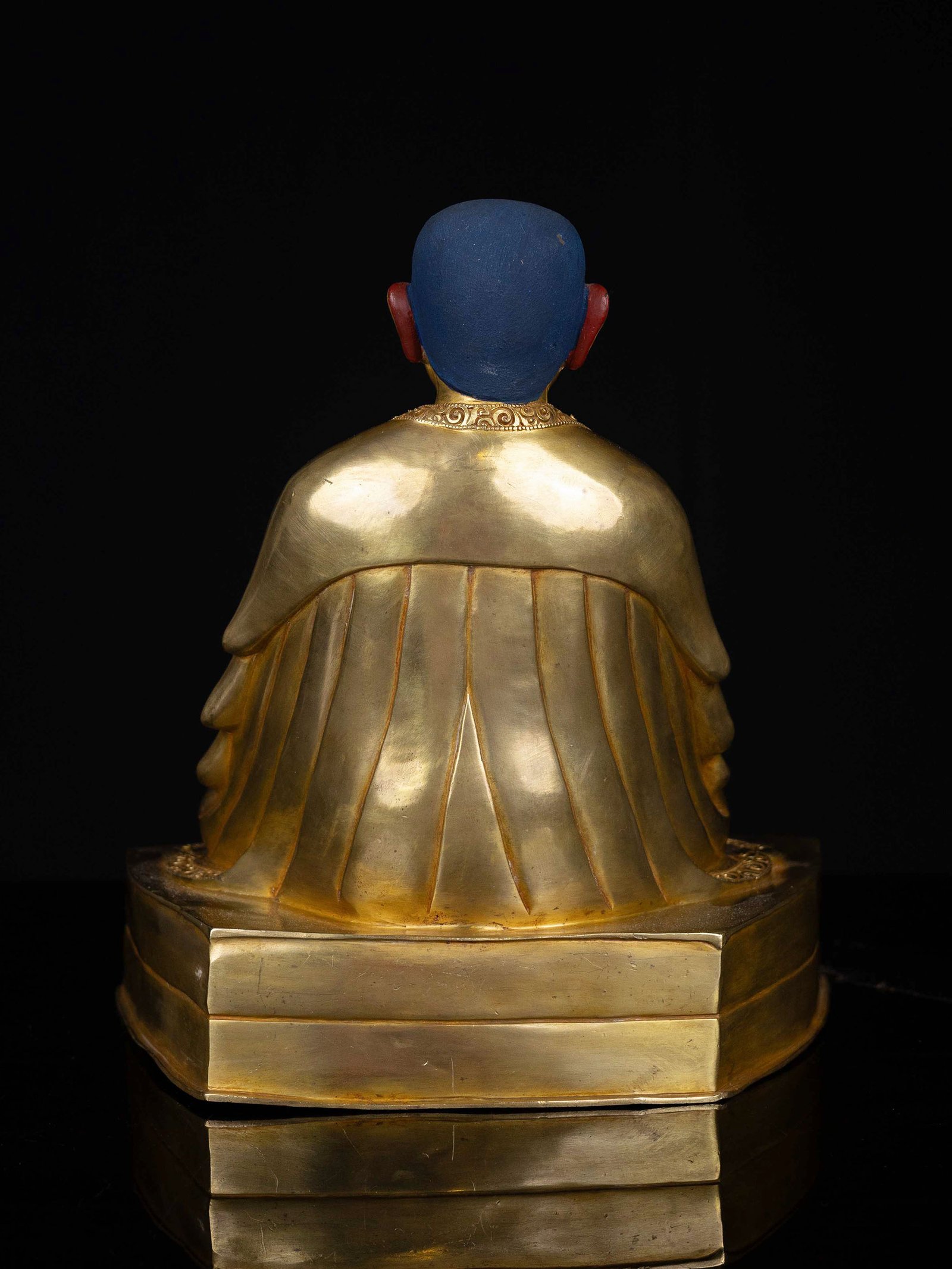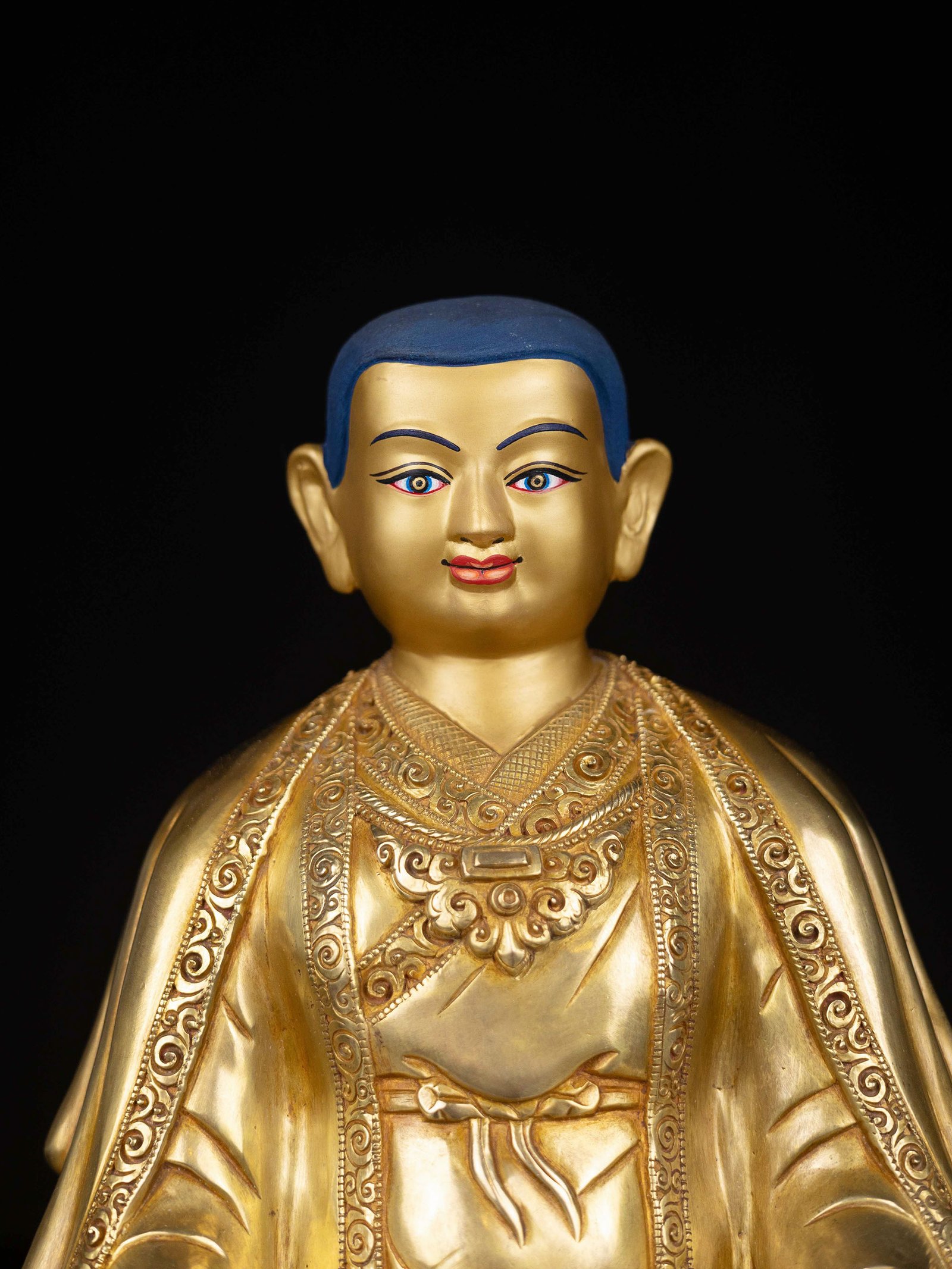 The face of Three Kayug Masters is painted with gold to enhance its significant features, particularly the eyes, and lips. This detailed painting is essential as it brings forth the crucial attributes of the expression of eyes and lips that metal carving alone cannot capture.