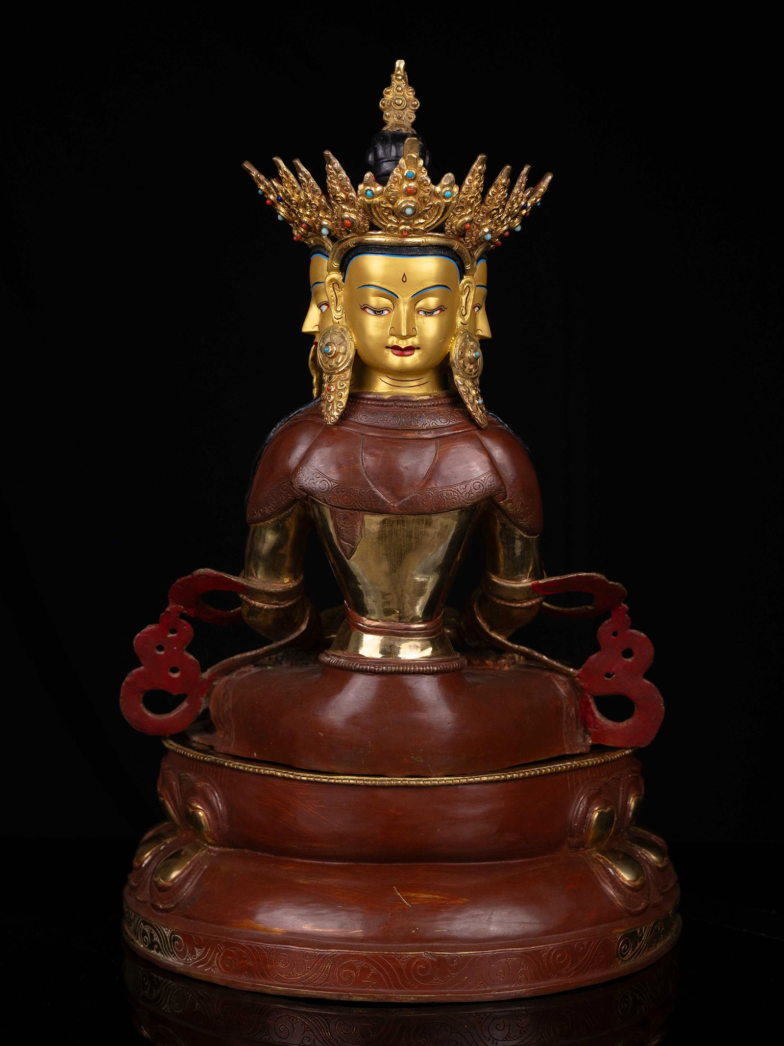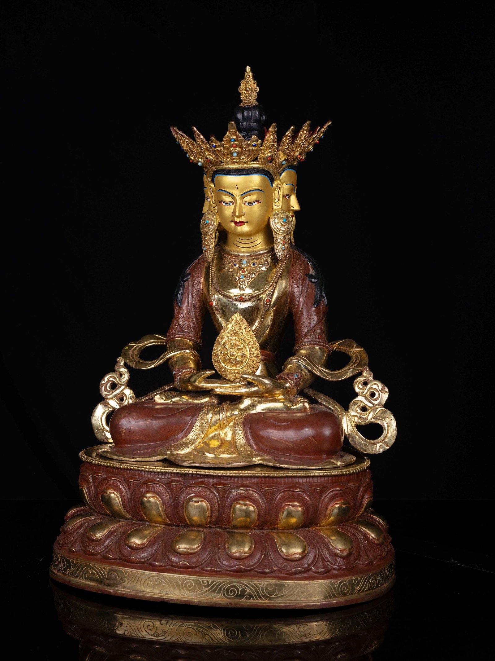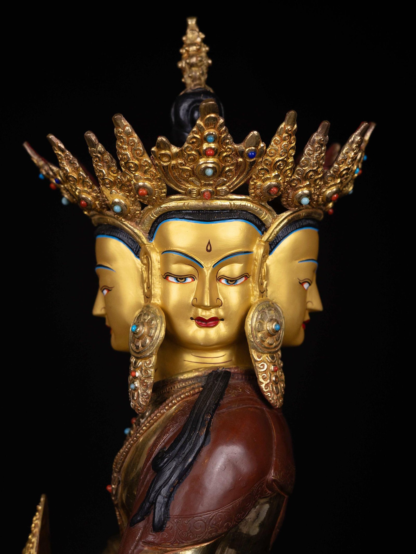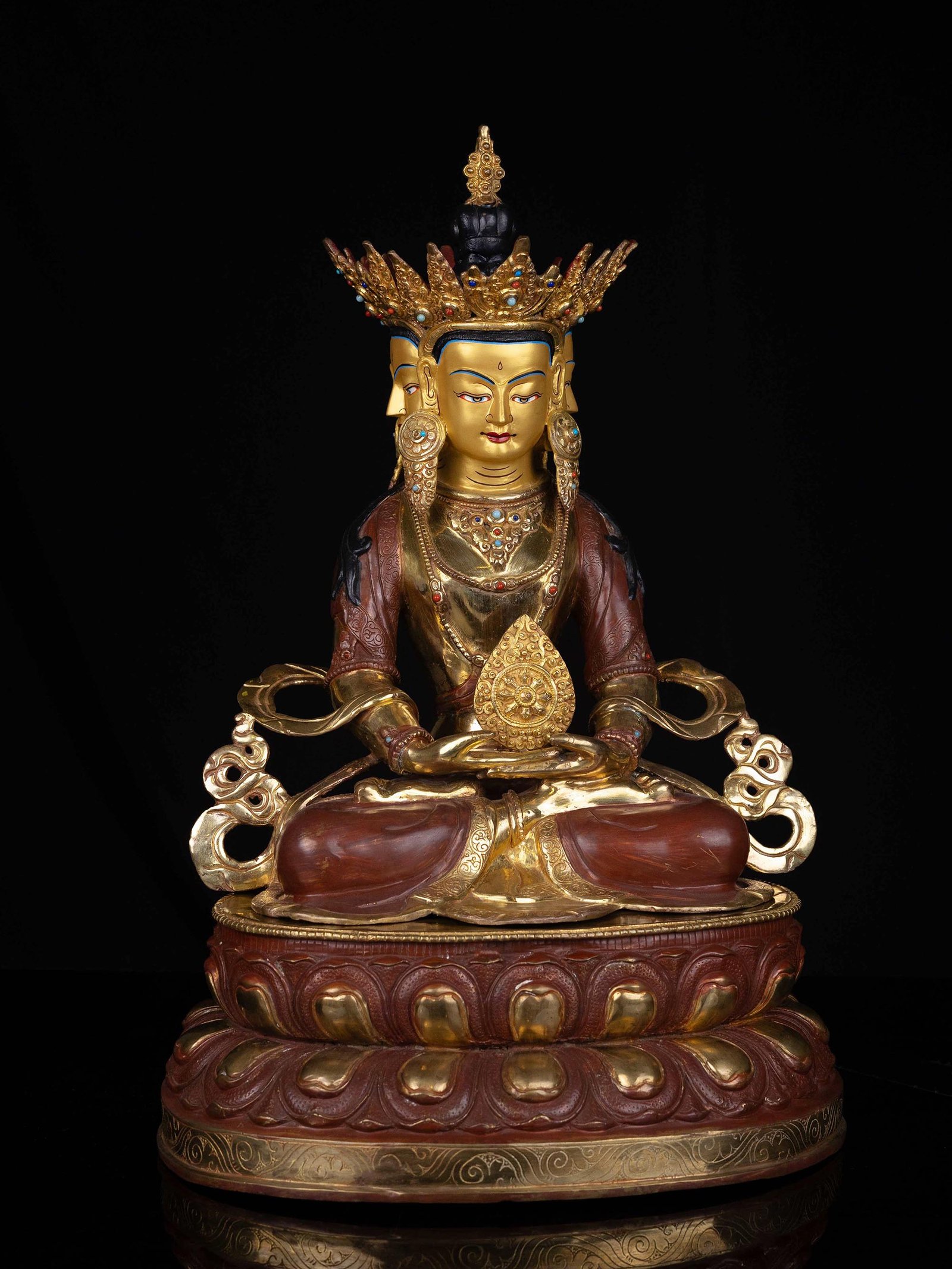 The face of Vairochana Buddha is painted with gold to enhance its significant features, particularly the eyes, and lips. This detailed painting is essential as it brings forth the crucial attributes of the expression of eyes and lips that metal carving alone cannot capture.
