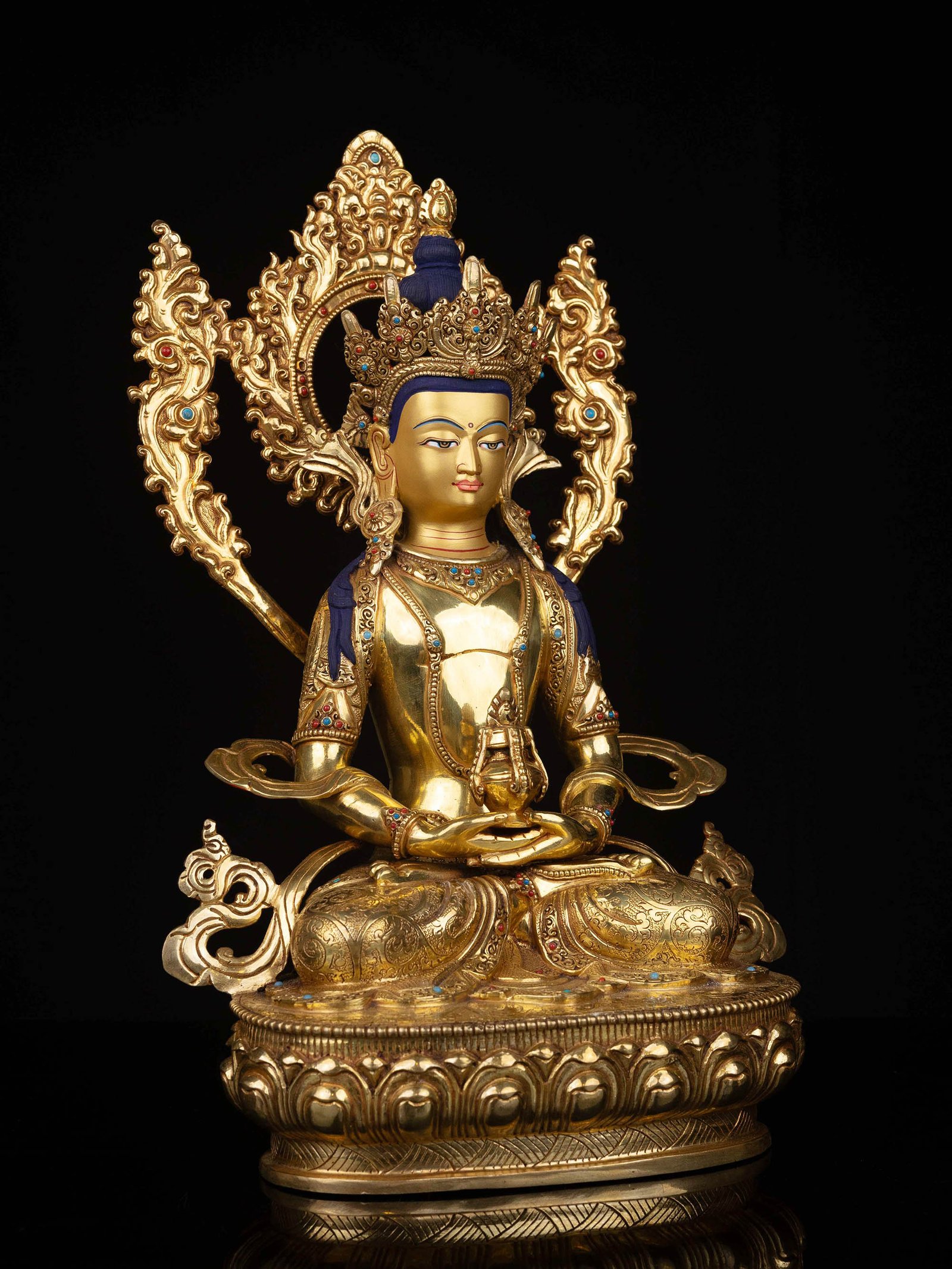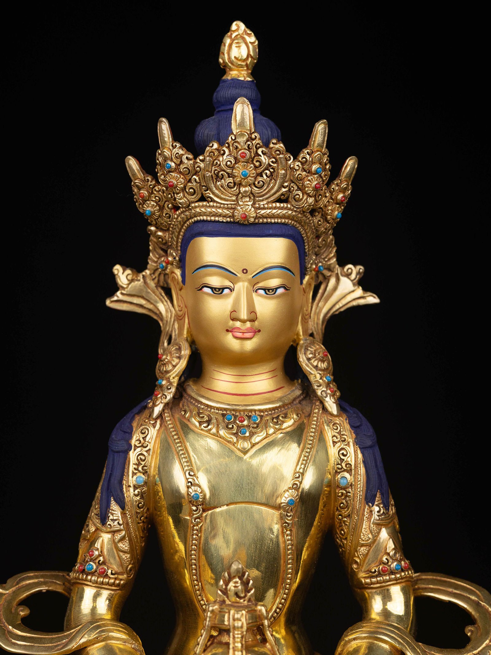 Aparimita Buddhist Handmade Statue, Full Gold Plated, Stone Setting, Face Painted , Buddha of Long Life, Wisdom, and Spiritual Vitality