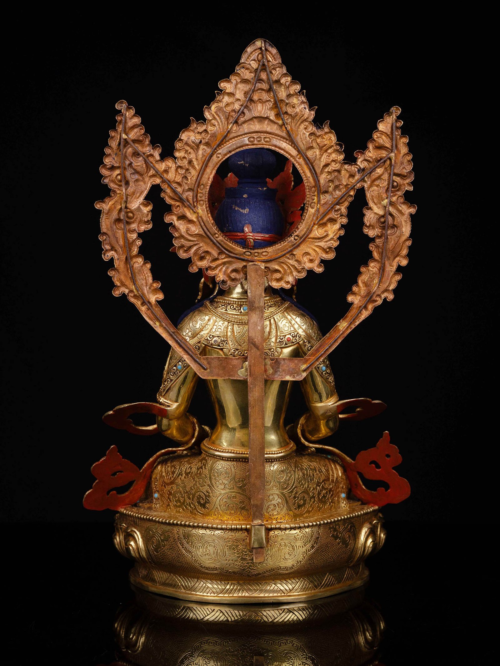 The face of Aparimita is painted with gold to enhance its significant features, particularly the eyes, and lips. This detailed painting is essential as it brings forth the crucial attributes of the expression of eyes and lips that metal carving alone cannot capture.