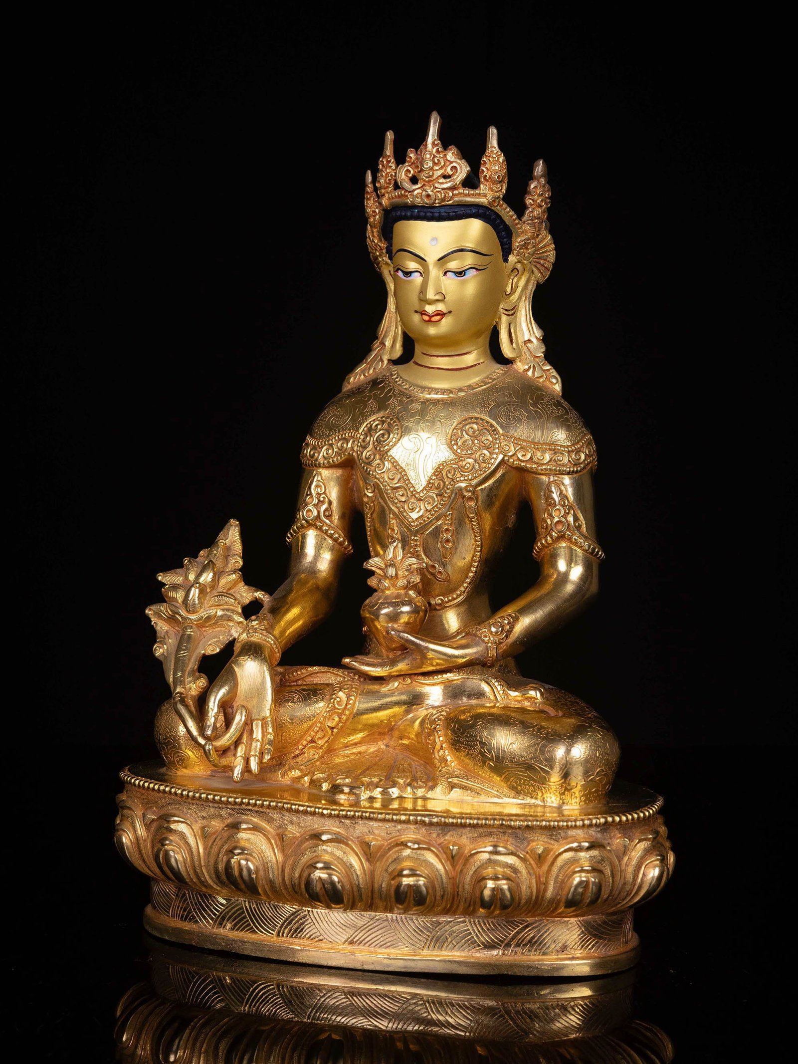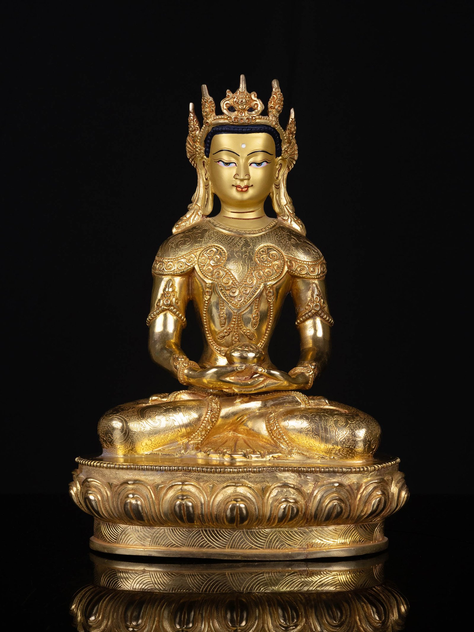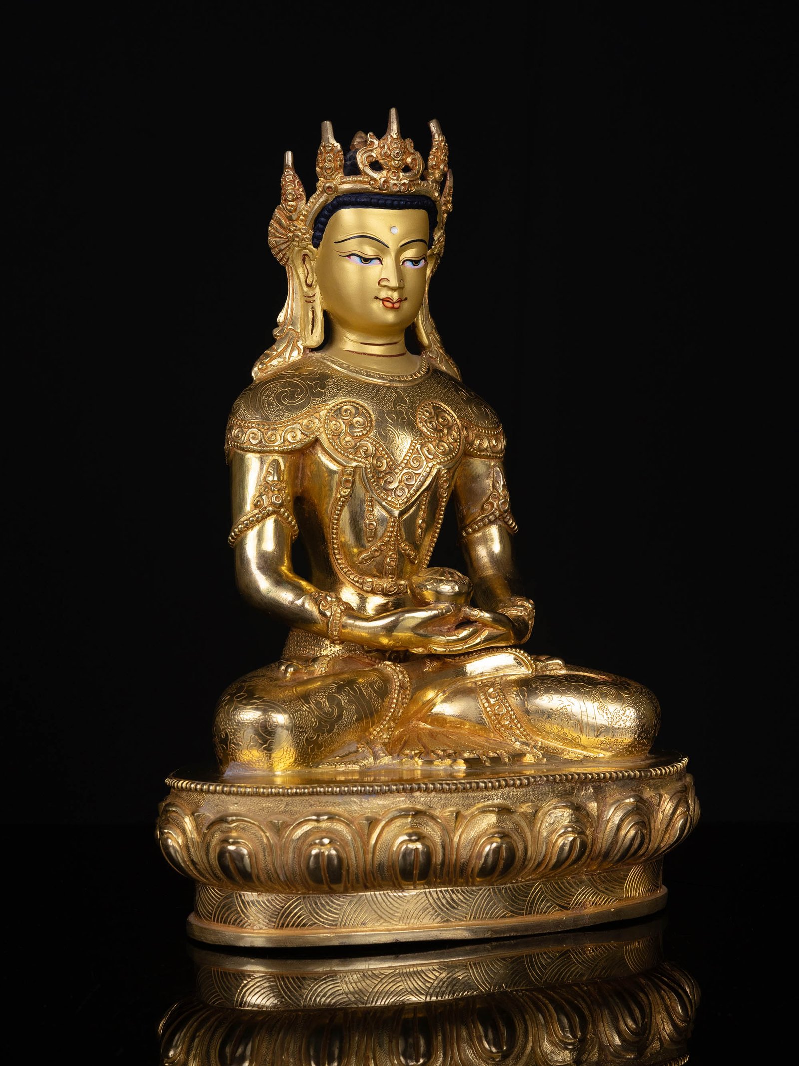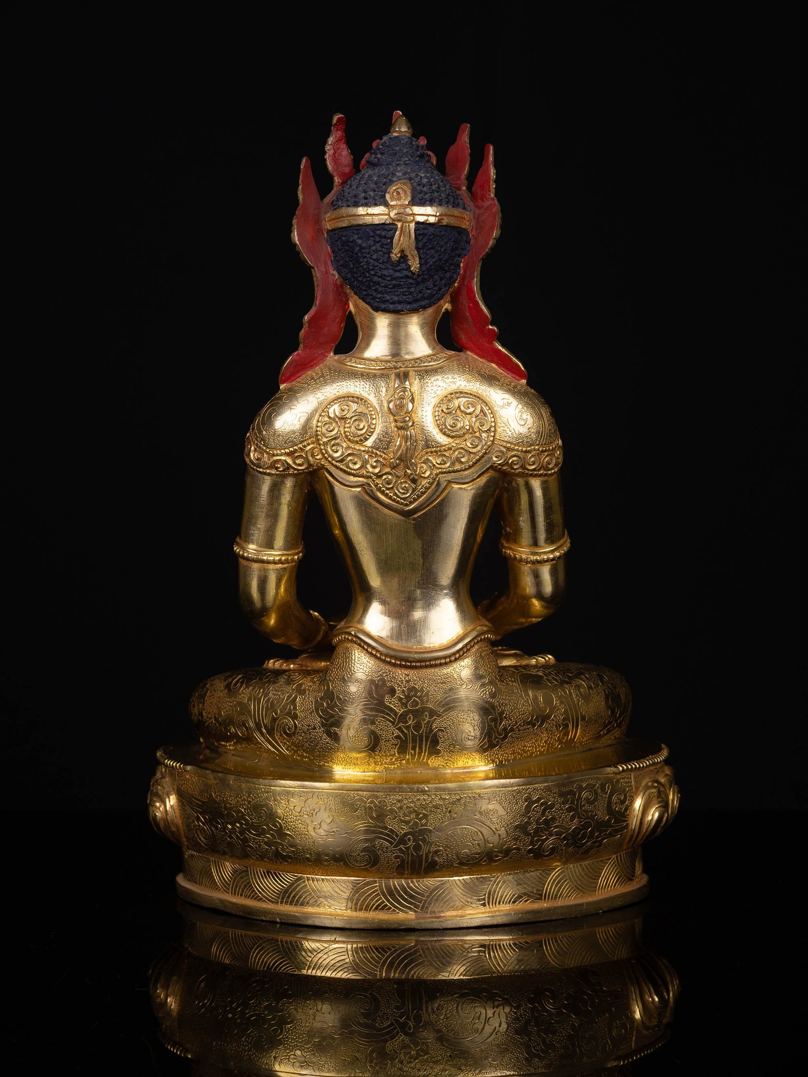 This Buddha is finished with full gold plating. also known as mercury gold plating or fire gold plating. This traditional technique involves the application of a genuine layer of gold onto the Buddha. Referred to as mercury gold plating, it is considered the correct and authentic form of gold plating in Nepal. Despite being more expensive than electroplating, this traditional mercury gold plating is gaining popularity again in Nepal. People are drawn to its authenticity, longevity, and the unmatched beauty it brings to the Buddha. The resurgence of interest in this traditional form of gold plating reflects a growing appreciation for the craftsmanship and cultural heritage of Nepal Read More