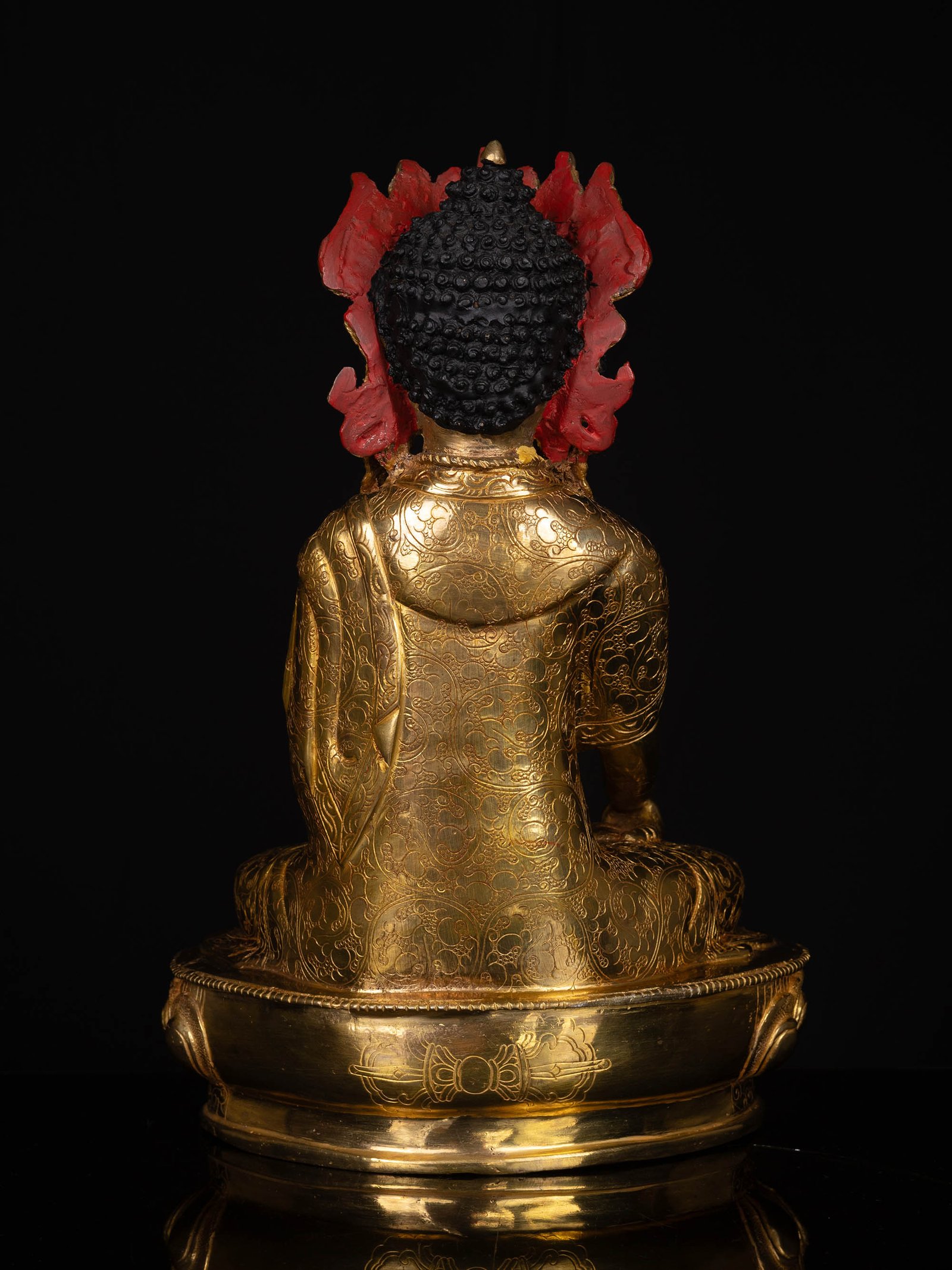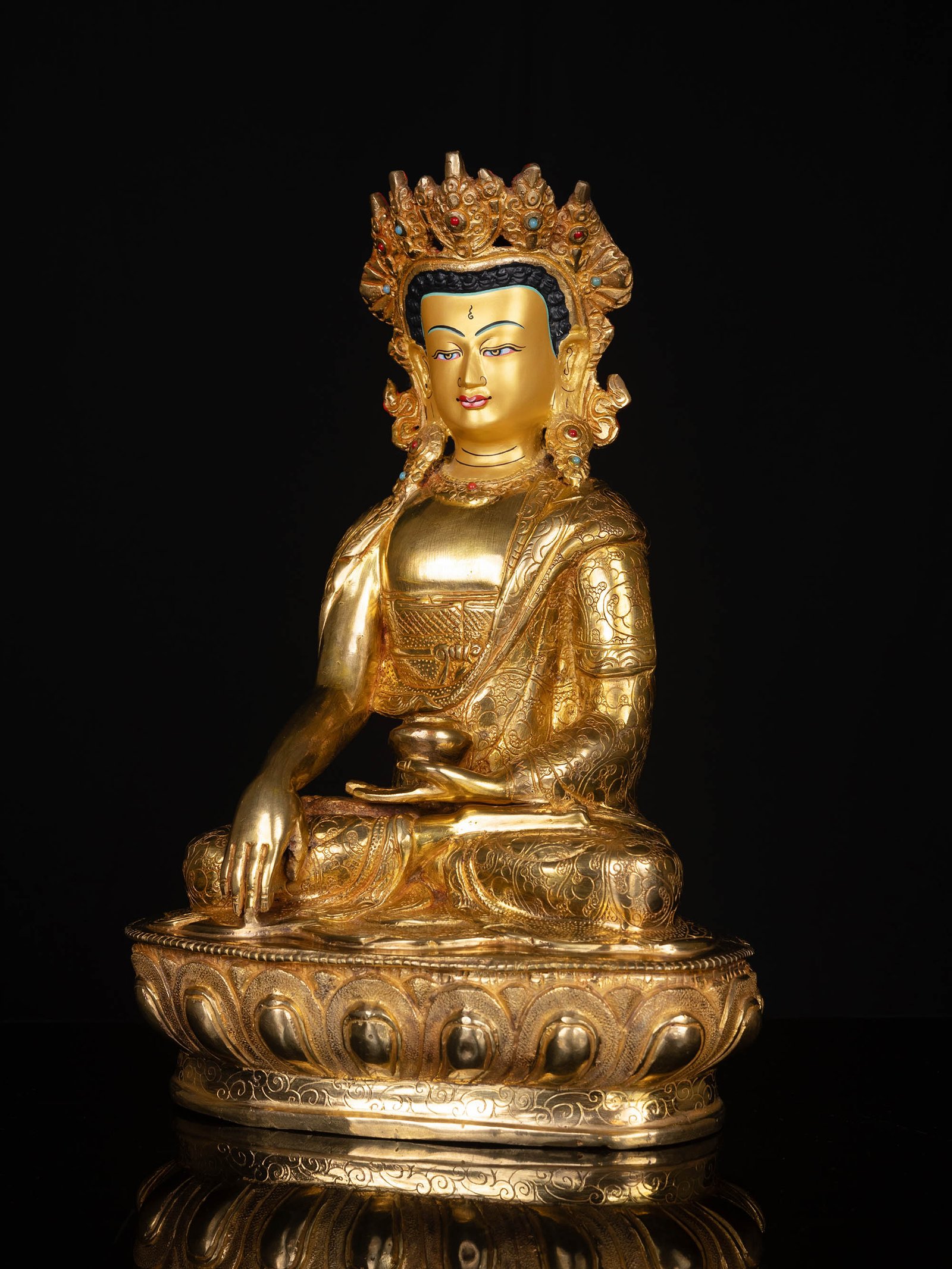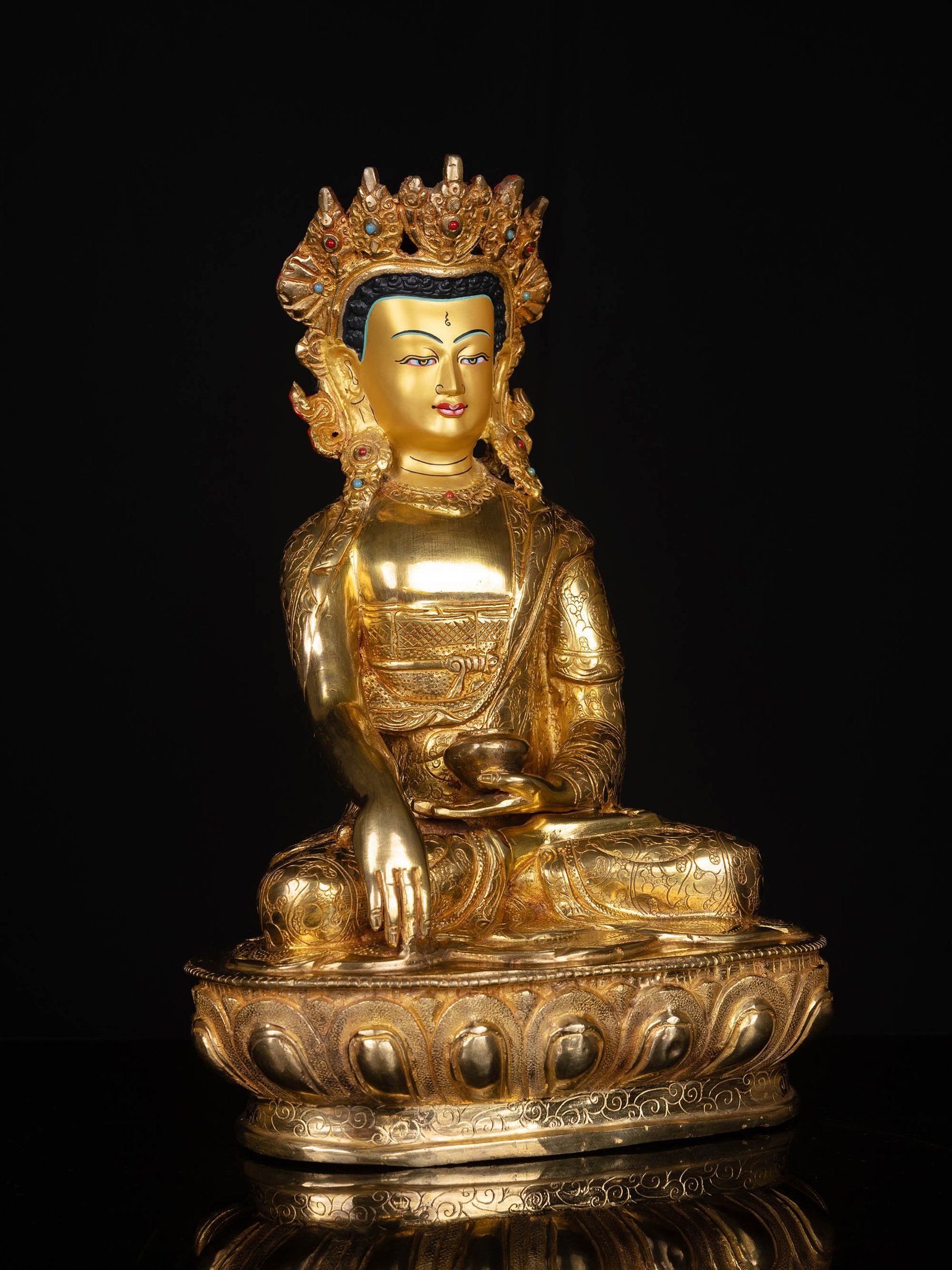 This Shakyamuni Buddha is finished with full gold plating. also known as mercury gold plating or fire gold plating. This traditional technique involves the application of a genuine layer of gold onto the Shakyamuni Buddha. Referred to as mercury gold plating, it is considered the correct and authentic form of gold plating in Nepal. Despite being more expensive than electroplating, this traditional mercury gold plating is gaining popularity again in Nepal. People are drawn to its authenticity, longevity, and the unmatched beauty it brings to the Shakyamuni Buddha. The resurgence of interest in this traditional form of gold plating reflects a growing appreciation for the craftsmanship and cultural heritage of Nepal Read More