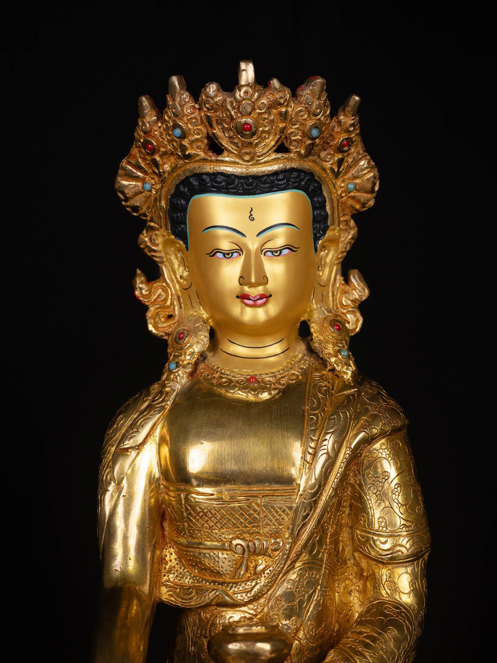 The face of Shakyamuni Buddha is painted with gold to enhance its significant features, particularly the eyes, and lips. This detailed painting is essential as it brings forth the crucial attributes of the expression of eyes and lips that metal carving alone cannot capture.