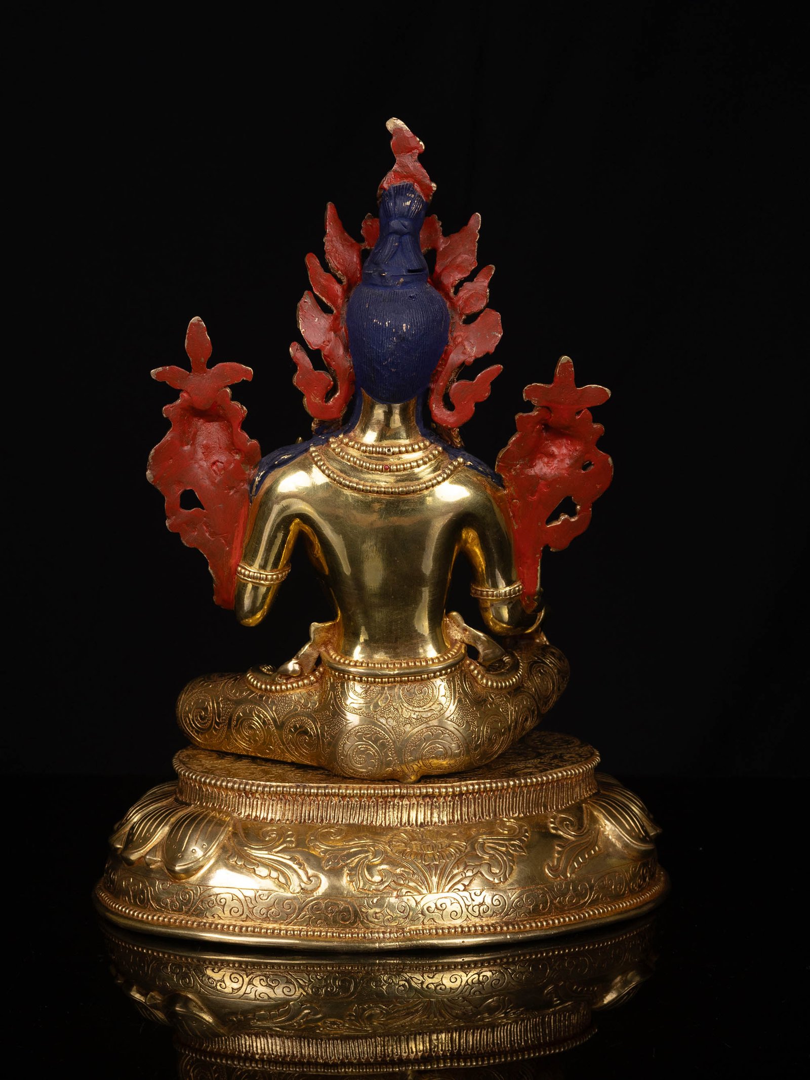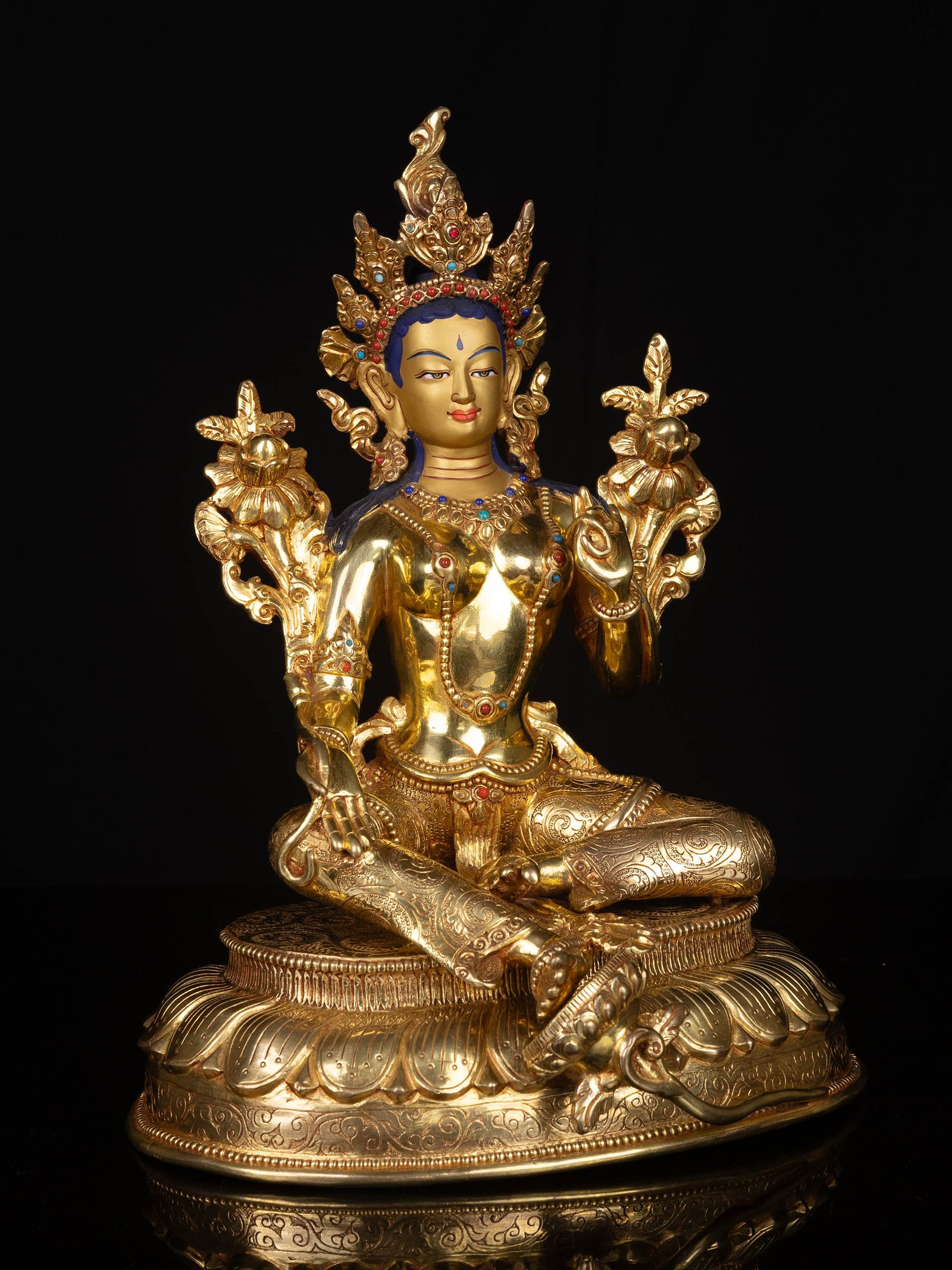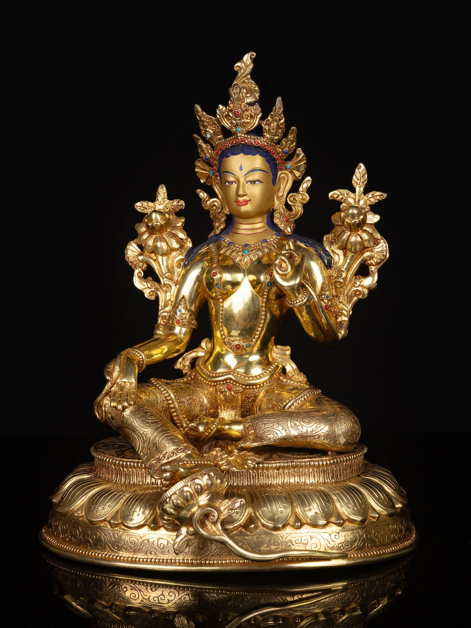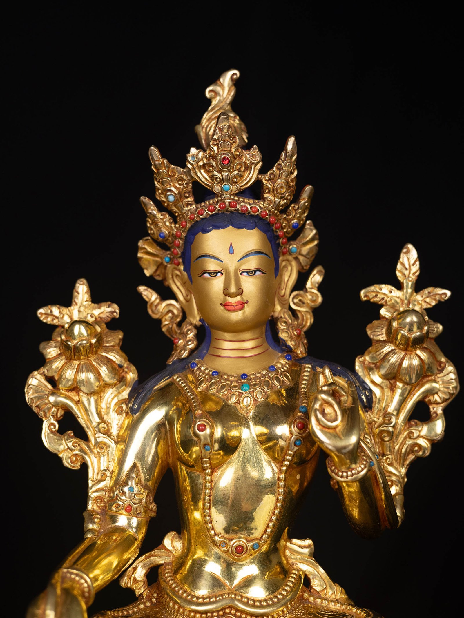 The face of Green Tara is painted with gold to enhance its significant features, particularly the eyes, and lips. This detailed painting is essential as it brings forth the crucial attributes of the expression of eyes and lips that metal carving alone cannot capture.