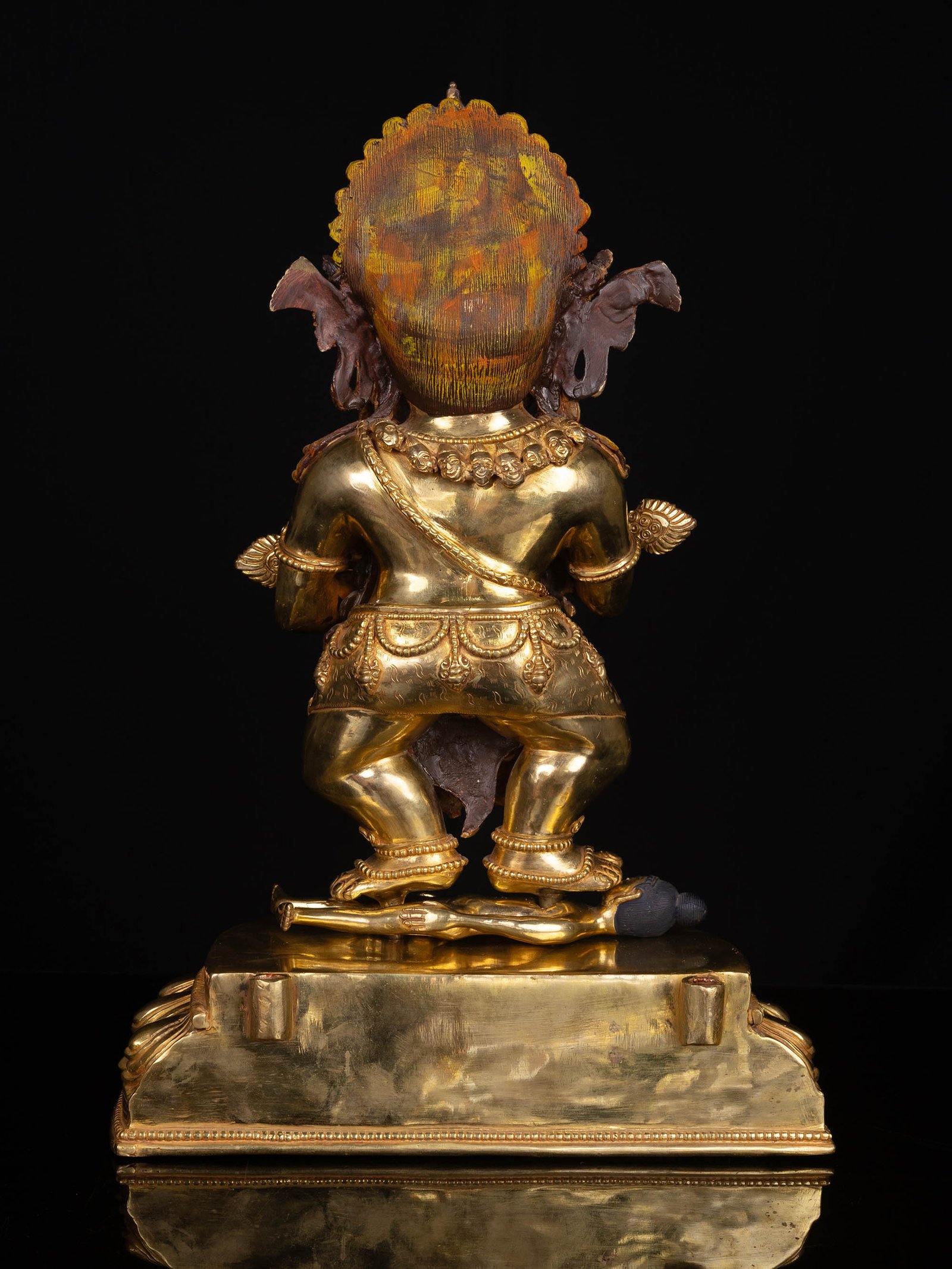 The face of Mahakala Two Arms is painted with gold to enhance its significant features, particularly the eyes, and lips. This detailed painting is essential as it brings forth the crucial attributes of the expression of eyes and lips that metal carving alone cannot capture.
