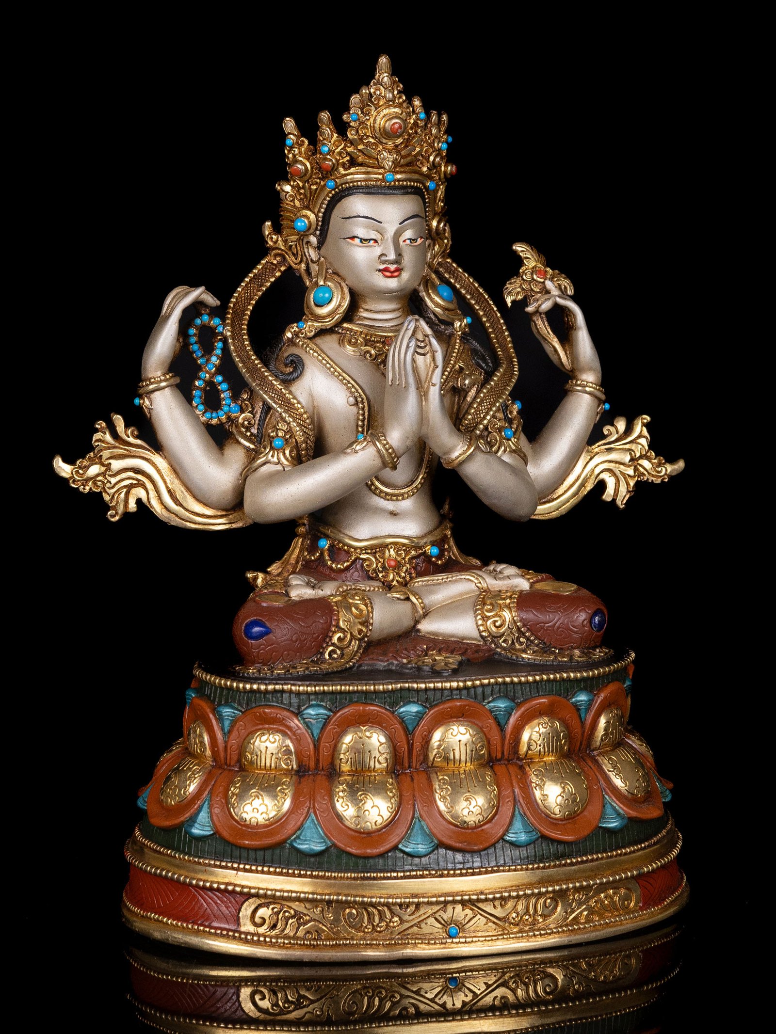 Of all the deities in Mahayana Buddhism, the bodhisattva Avalokiteshvara, Chenrezig, is one of the most celebrated. He is the lord gifted with complete enlightenment, who refrains from entering the blissful state of nirvana to remain here below and save the living being of the earth. This devotion to the salvation of others emphasizes profound compassion.
