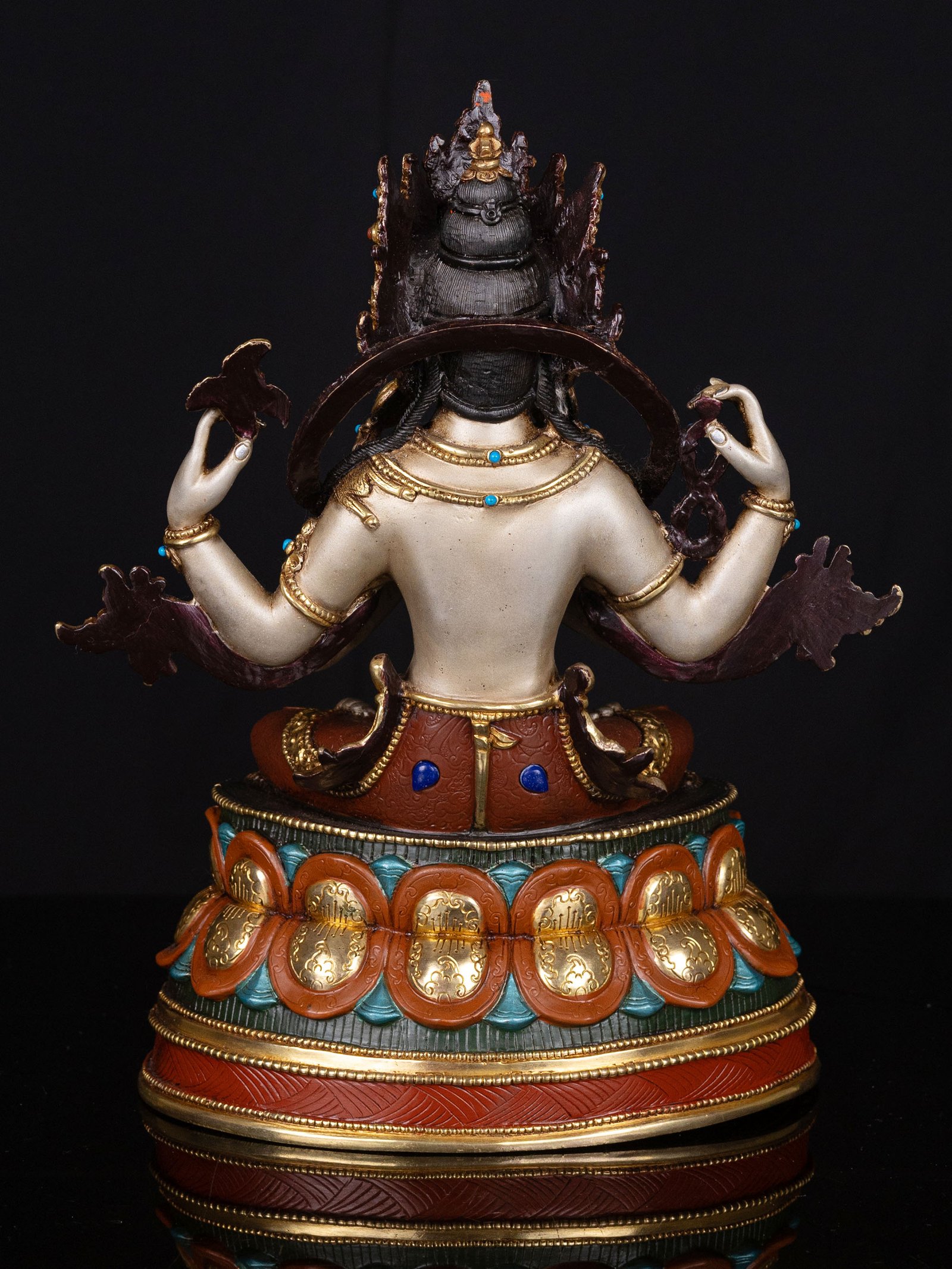 The Chenrezig is adorned with an exquisite array of semi-precious stones, including turquoise, coral, and lapis lazuli. These stones are carefully selected and meticulously placed on the Chenrezig's surface, adding a touch of opulence and enhancing its overall beauty. Each stone is thoughtfully positioned using a high-quality adhesive, ensuring secure and long-lasting attachment. The vibrant colors and unique patterns of the stones create a captivating contrast against the backdrop of the Chenrezig, elevating its visual appeal and making it truly eye-catching. Read More