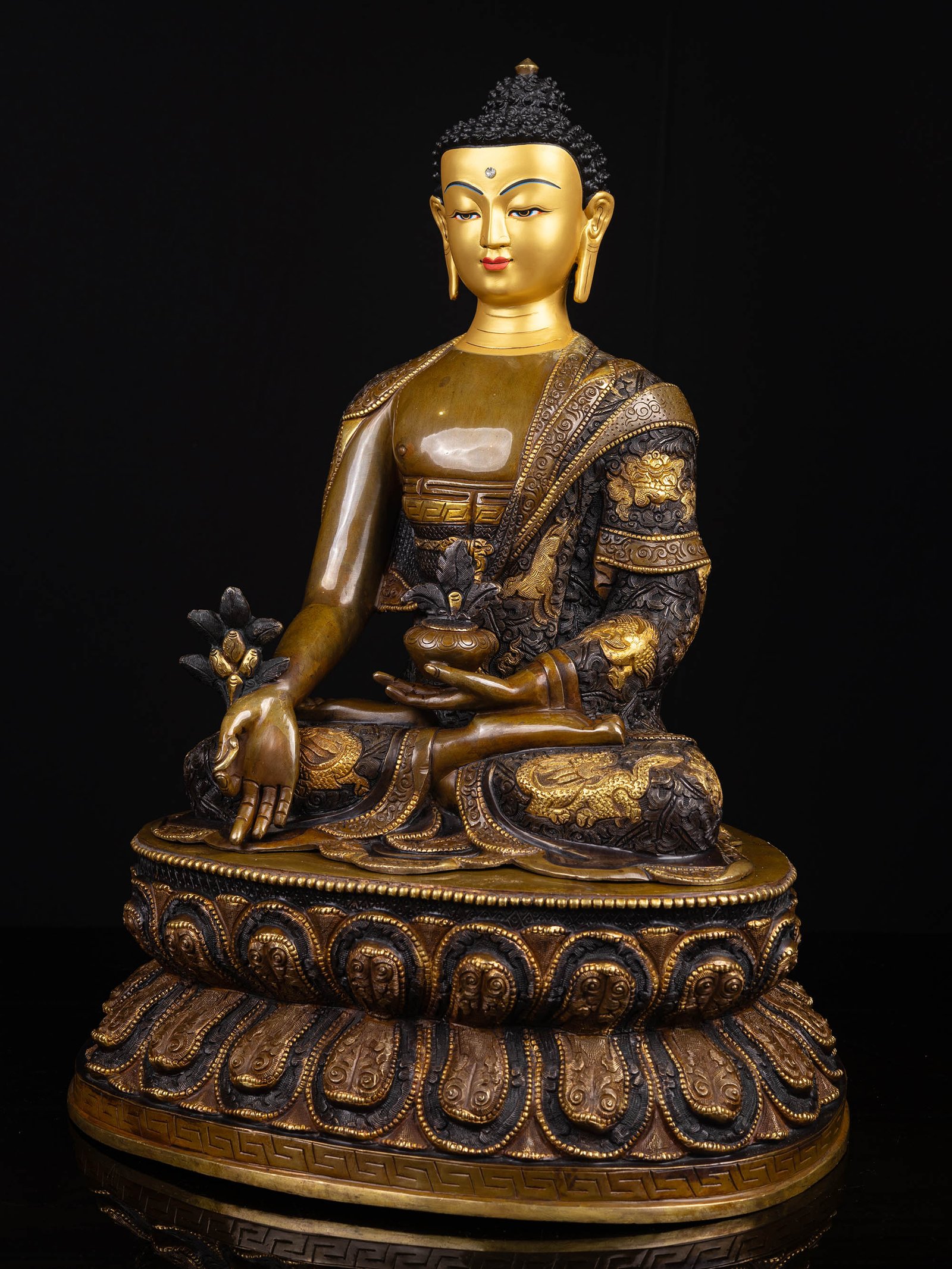 The face of Medicine Buddha is painted with gold to enhance its significant features, particularly the eyes, and lips. This detailed painting is essential as it brings forth the crucial attributes of the expression of eyes and lips that metal carving alone cannot capture.