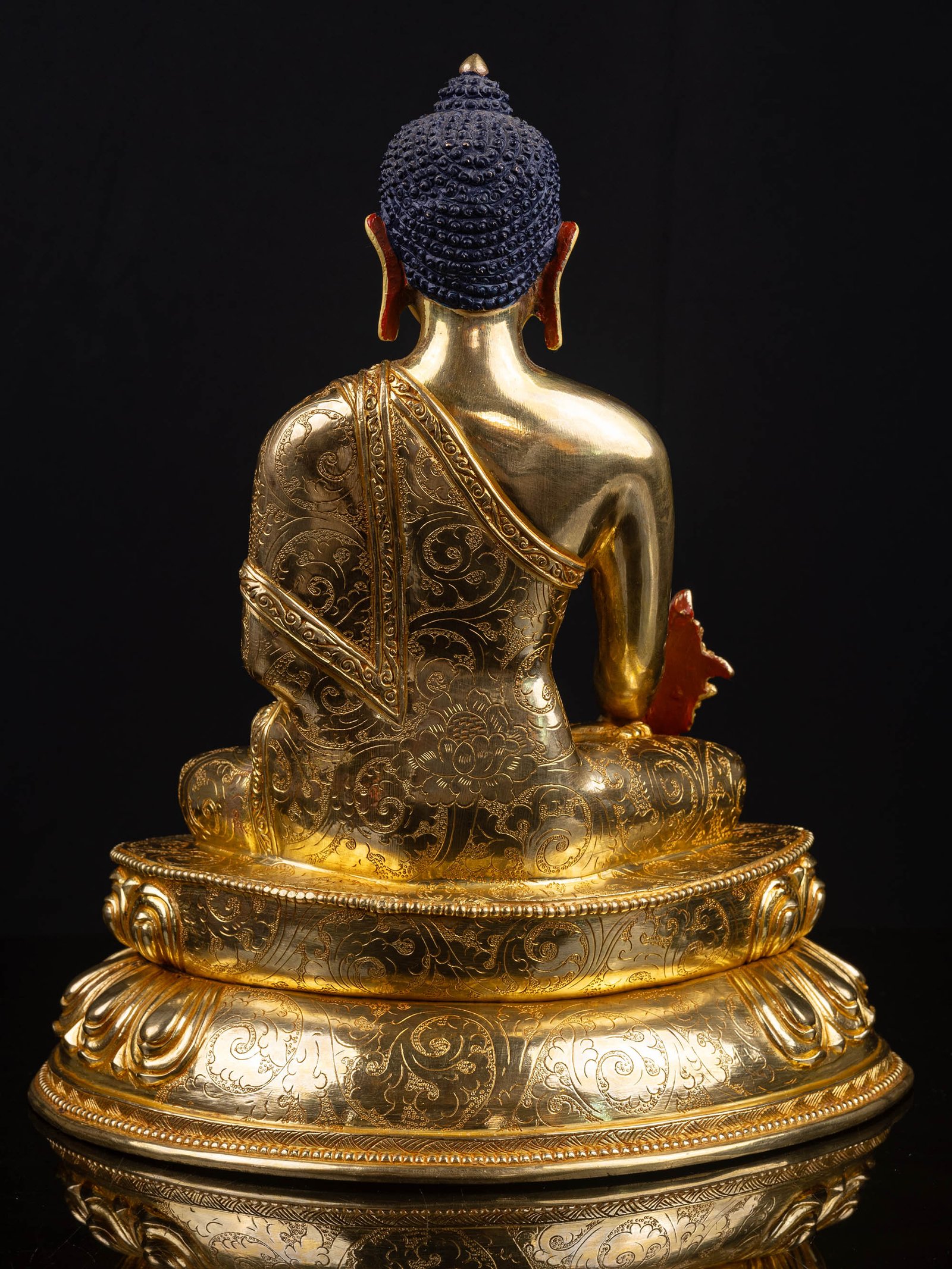 This Medicine Buddha is finished with full gold plating. also known as mercury gold plating or fire gold plating. This traditional technique involves the application of a genuine layer of gold onto the Medicine Buddha. Referred to as mercury gold plating, it is considered the correct and authentic form of gold plating in Nepal. Despite being more expensive than electroplating, this traditional mercury gold plating is gaining popularity again in Nepal. People are drawn to its authenticity, longevity, and the unmatched beauty it brings to the Medicine Buddha. The resurgence of interest in this traditional form of gold plating reflects a growing appreciation for the craftsmanship and cultural heritage of Nepal Read More
