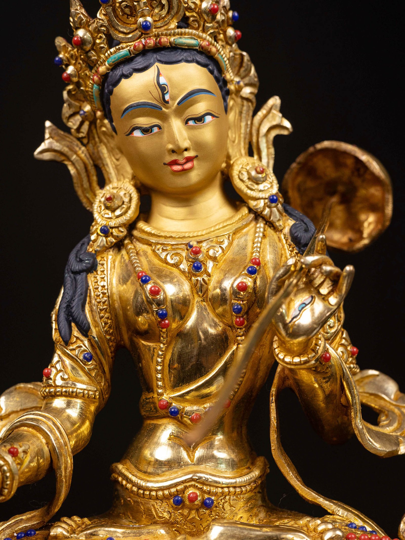 The face of Sitatapatra is painted with gold to enhance its significant features, particularly the eyes, and lips. This detailed painting is essential as it brings forth the crucial attributes of the expression of eyes and lips that metal carving alone cannot capture.