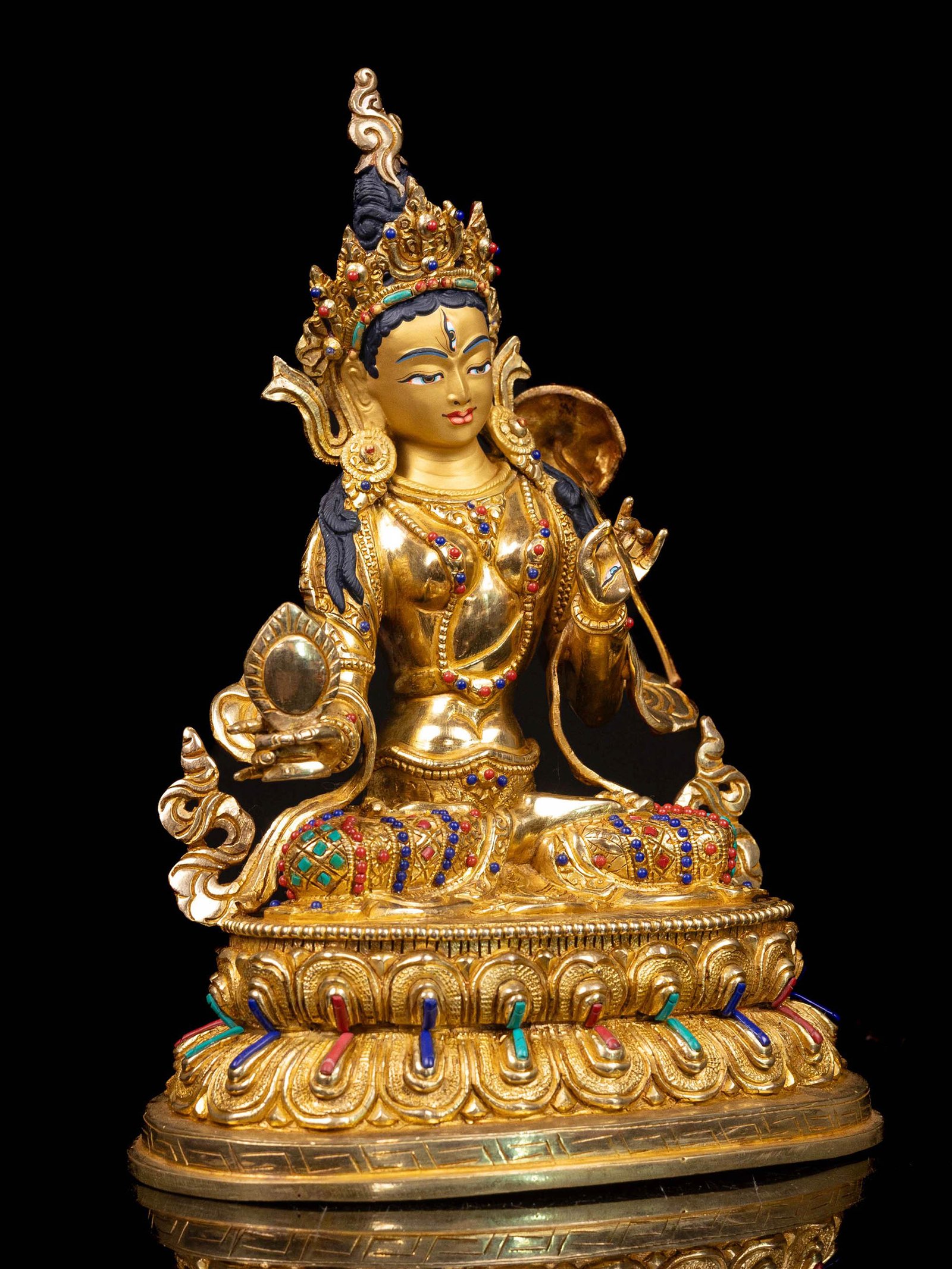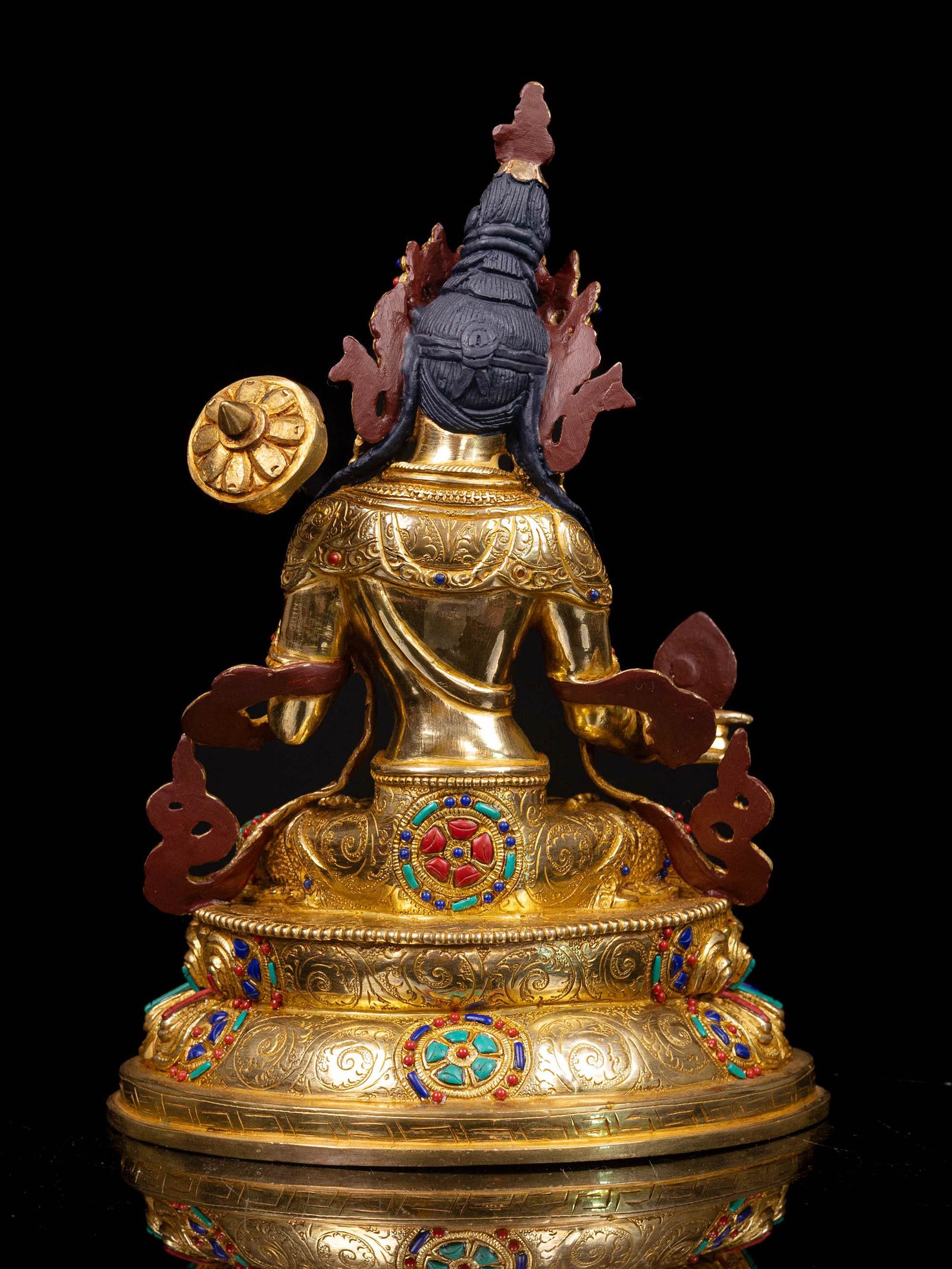 The Sitatapatra is adorned with an exquisite array of semi-precious stones, including turquoise, coral, and lapis lazuli. These stones are carefully selected and meticulously placed on the Sitatapatra's surface, adding a touch of opulence and enhancing its overall beauty. Each stone is thoughtfully positioned using a high-quality adhesive, ensuring secure and long-lasting attachment. The vibrant colors and unique patterns of the stones create a captivating contrast against the backdrop of the Sitatapatra, elevating its visual appeal and making it truly eye-catching. Read More