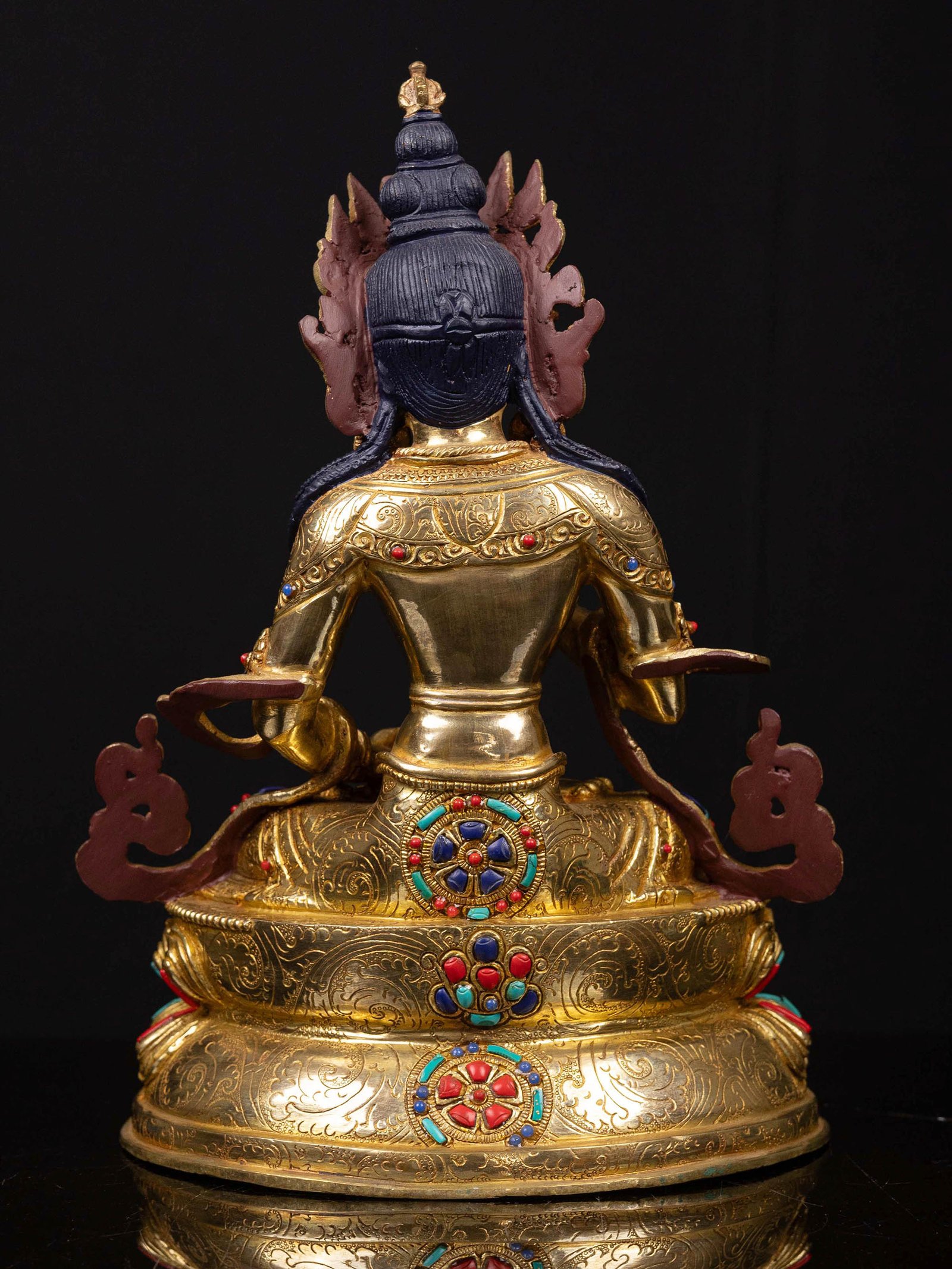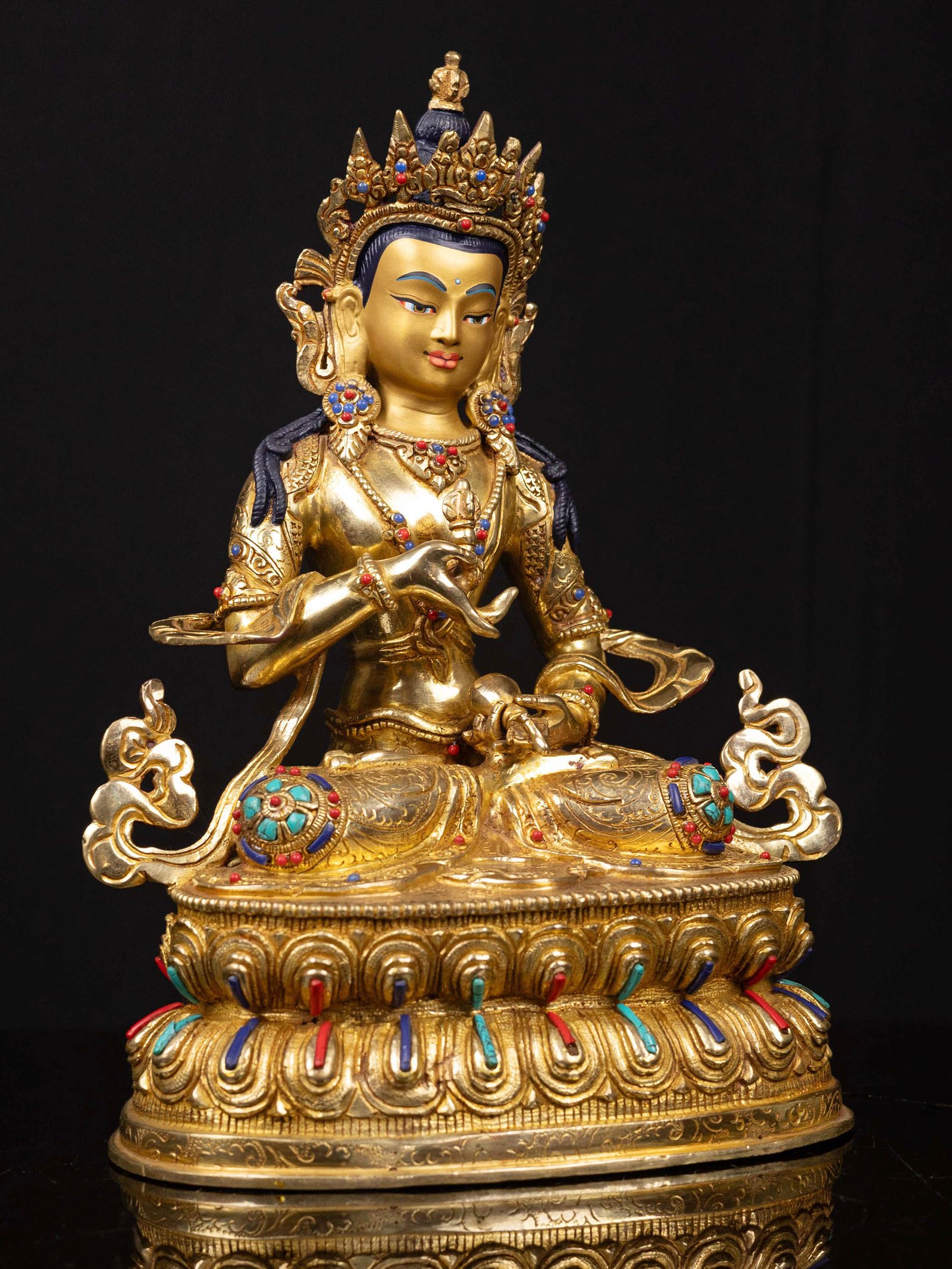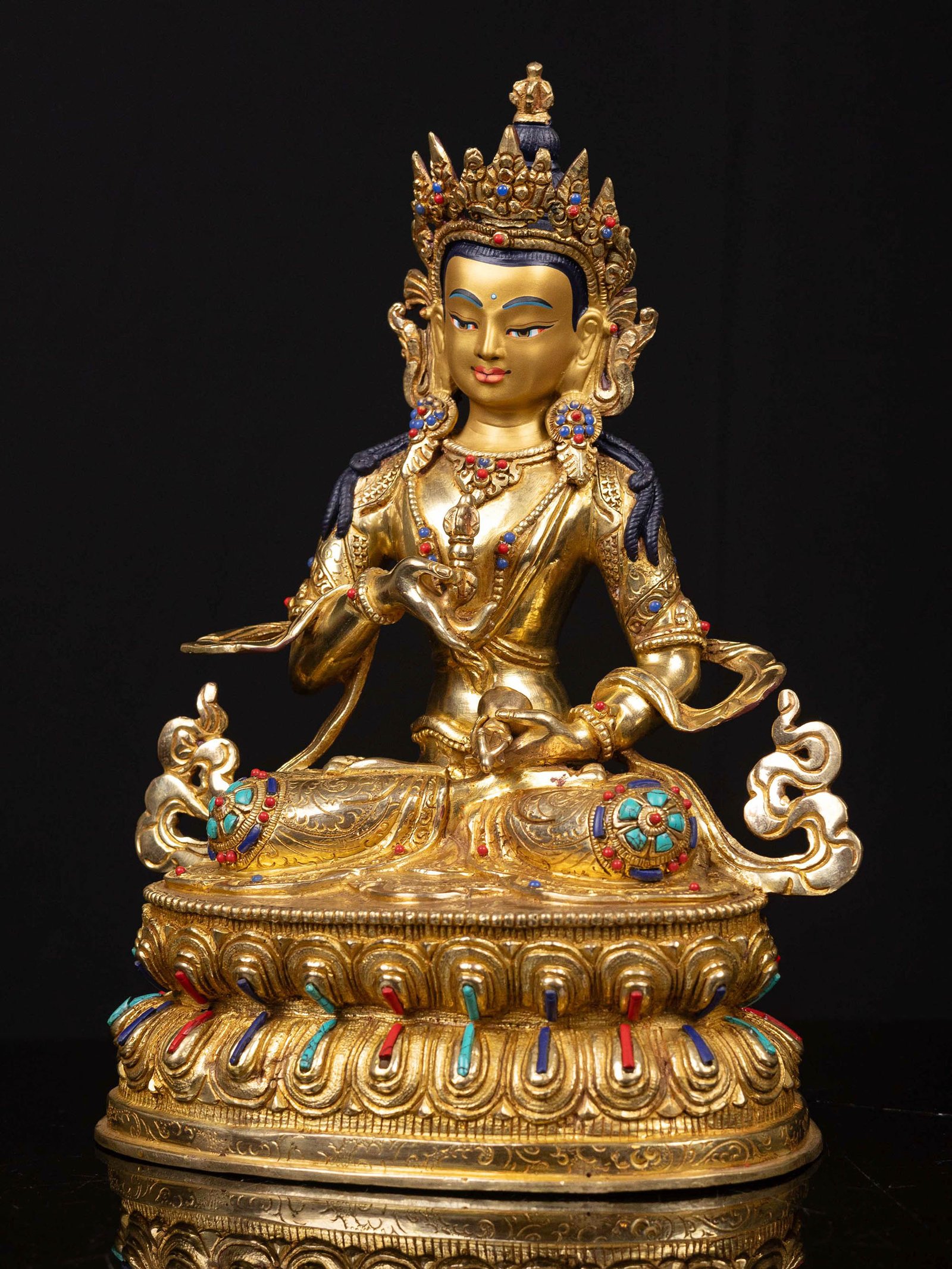 The Vajrasattva is adorned with an exquisite array of semi-precious stones, including turquoise, coral, and lapis lazuli. These stones are carefully selected and meticulously placed on the Vajrasattva's surface, adding a touch of opulence and enhancing its overall beauty. Each stone is thoughtfully positioned using a high-quality adhesive, ensuring secure and long-lasting attachment. The vibrant colors and unique patterns of the stones create a captivating contrast against the backdrop of the Vajrasattva, elevating its visual appeal and making it truly eye-catching. Read More