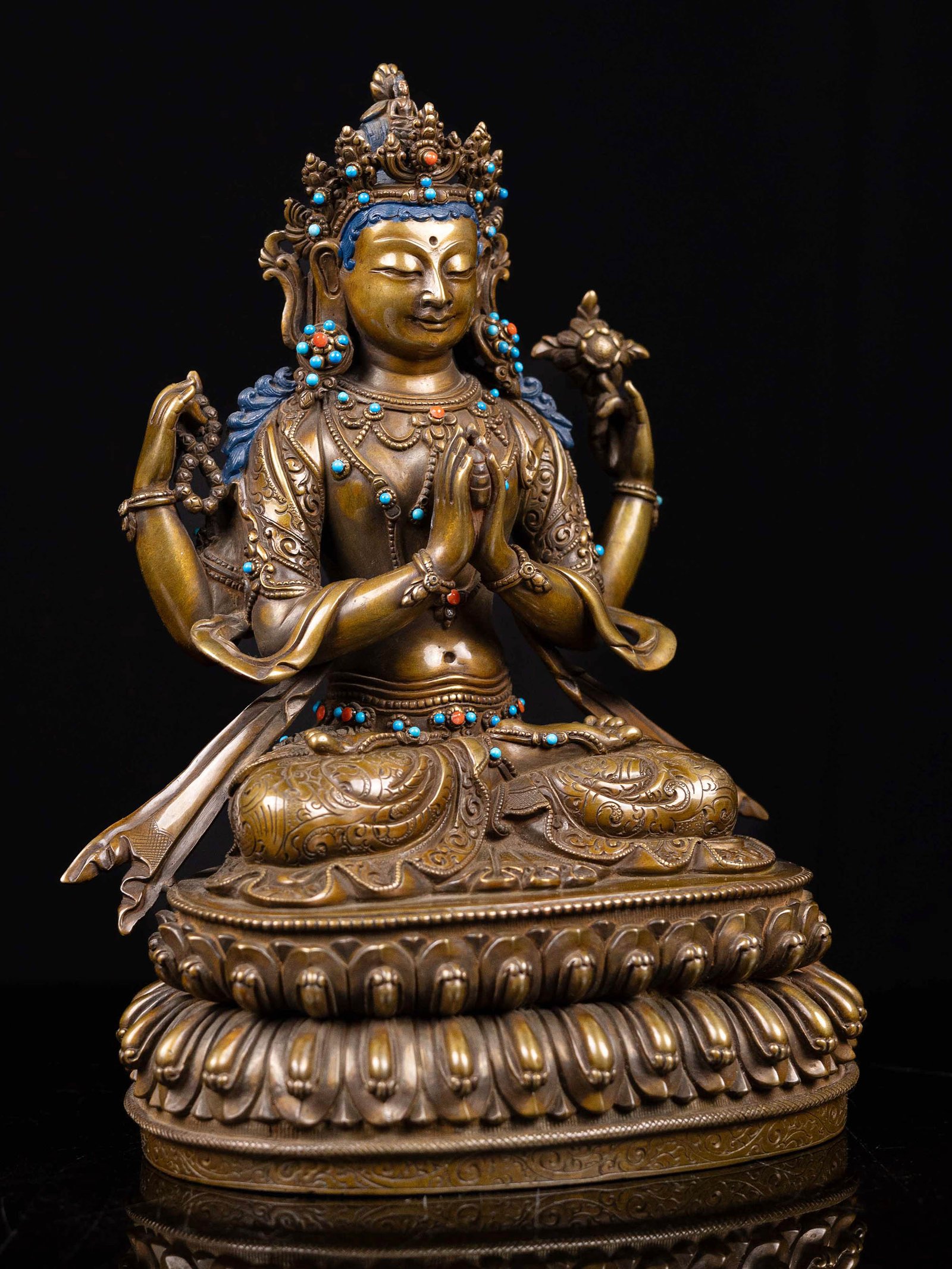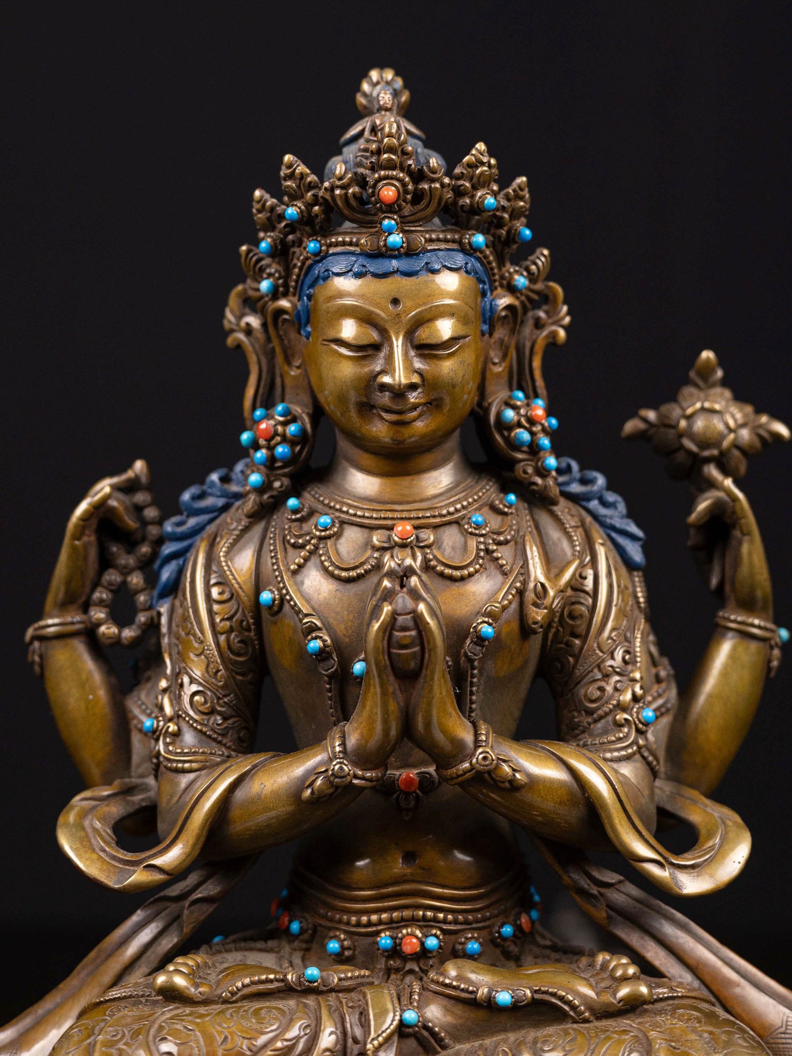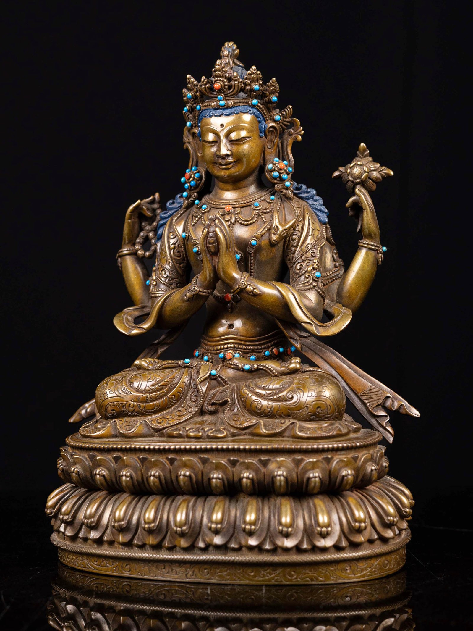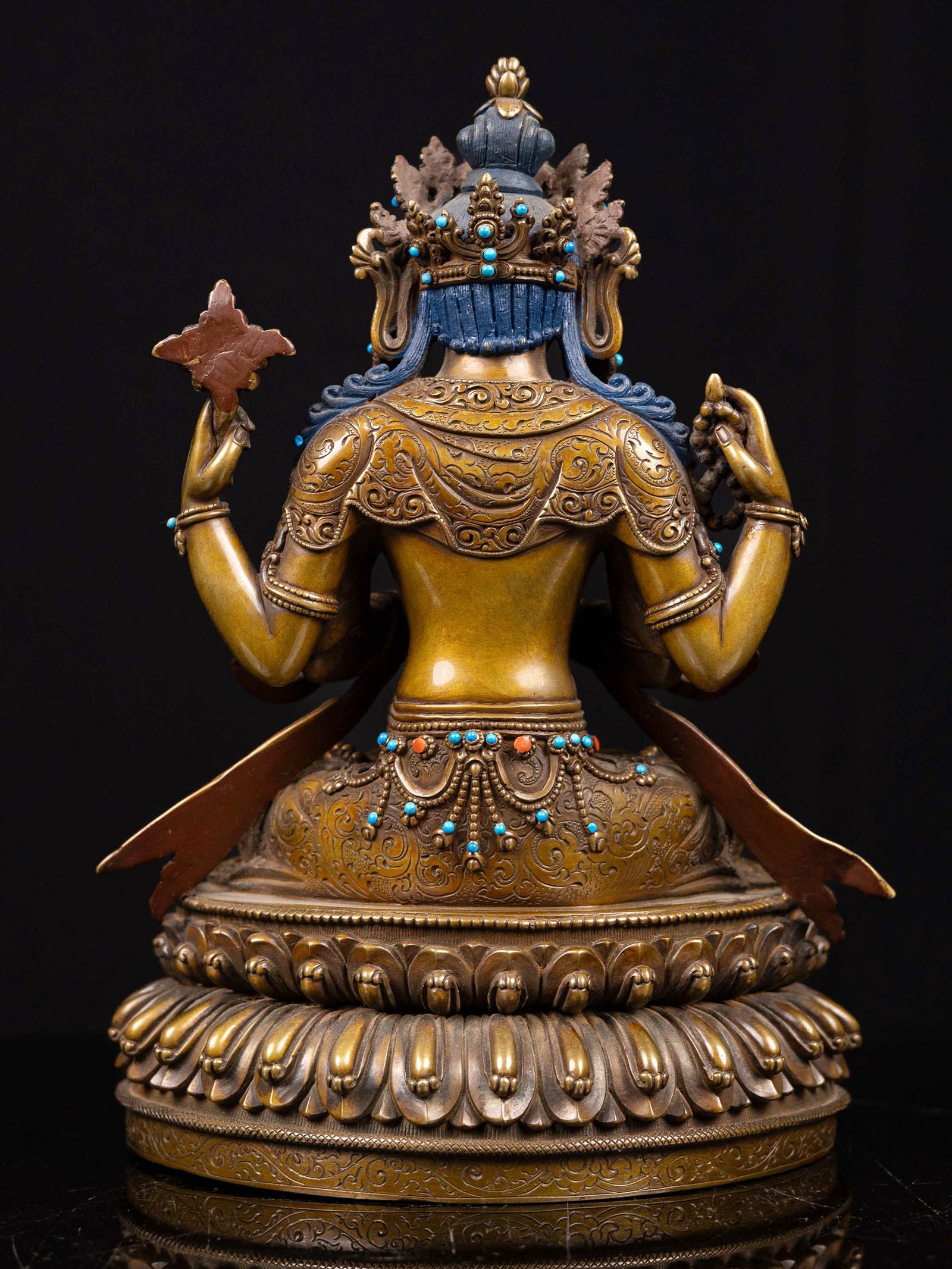 This Chenrezig has been meticulously treated with a chocolate color antique patina. The intention behind this patina is to replicate the appearance of a copper statue that has gracefully aged over a century. Unlike a simple coat of paint, this patina is not applied superficially and is designed to endure. It undergoes an artificial oxidation process that adds depth and character, while also serving as a protective layer against natural oxidation.