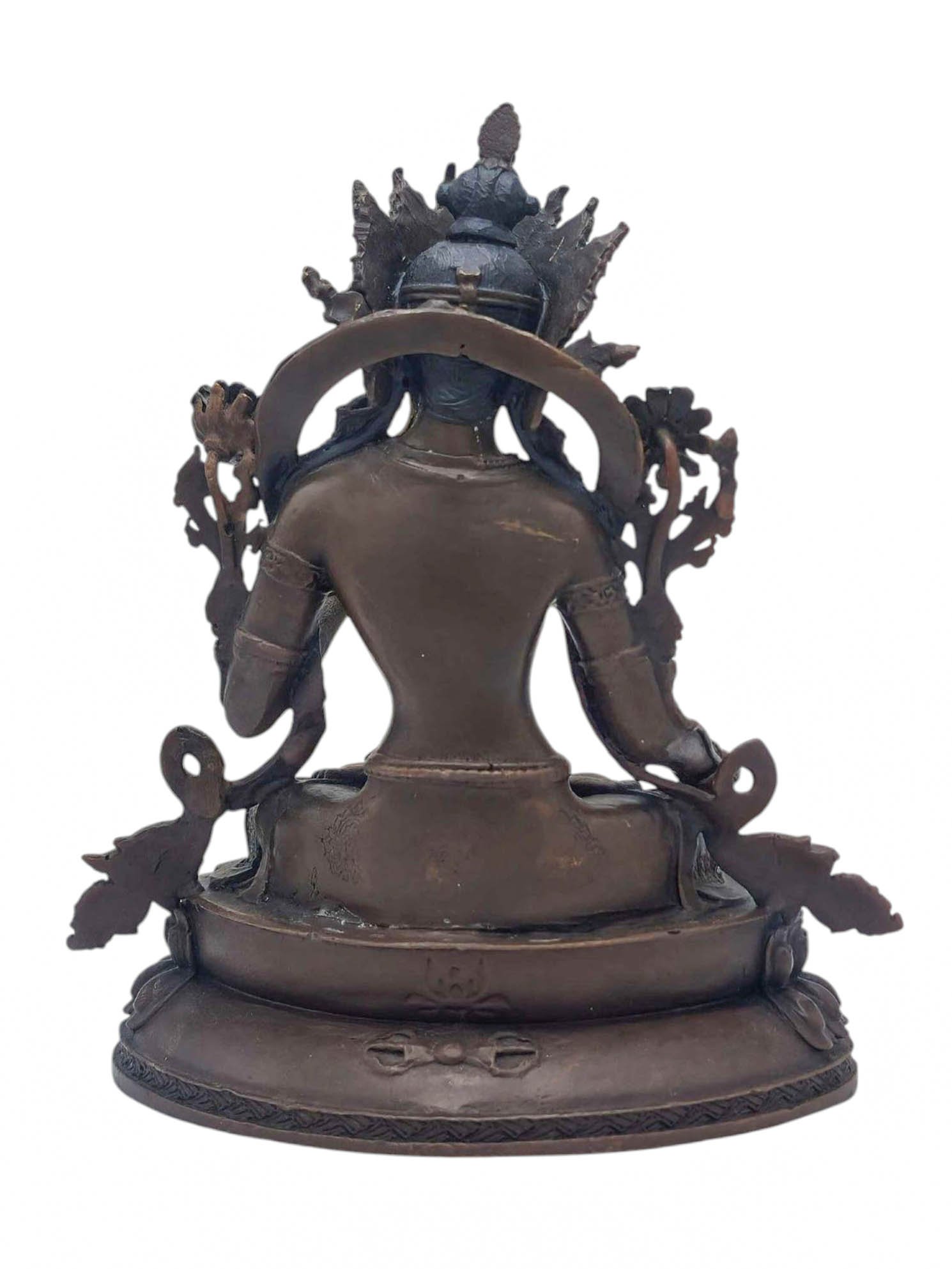 This White Tara has been meticulously treated with a chocolate color antique patina. The intention behind this patina is to replicate the appearance of a copper statue that has gracefully aged over a century. Unlike a simple coat of paint, this patina is not applied superficially and is designed to endure. It undergoes an artificial oxidation process that adds depth and character, while also serving as a protective layer against natural oxidation.