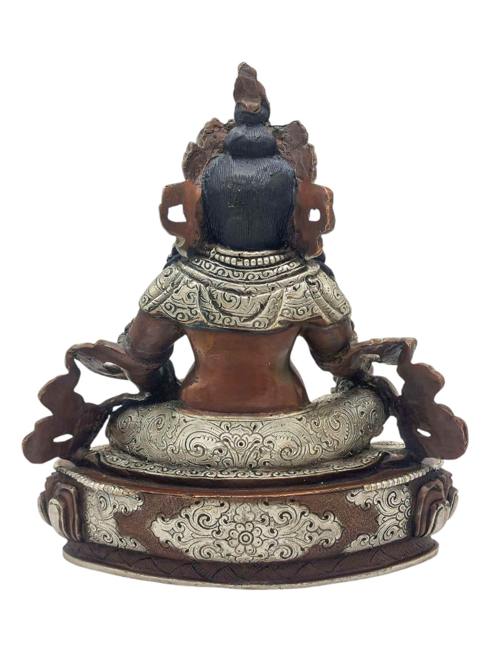 The face of Yellow Jambhala is painted with gold to enhance its significant features, particularly the eyes, and lips. This detailed painting is essential as it brings forth the crucial attributes of the expression of eyes and lips that metal carving alone cannot capture.