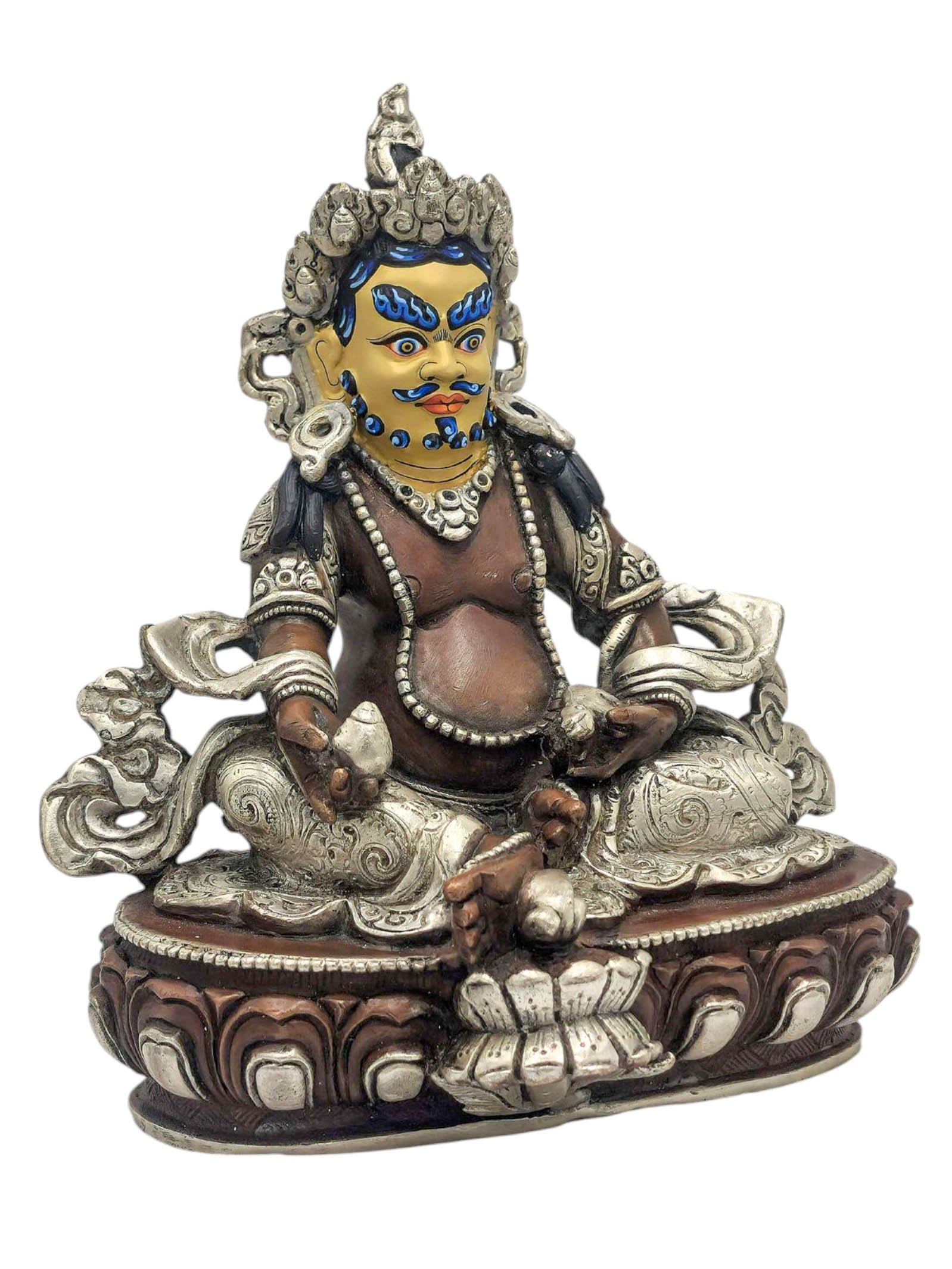 Yellow Jambhala, Buddhist Miniature Statue, Silver and Chocolate Oxidized, Face Painted , fostering generosity and abundance