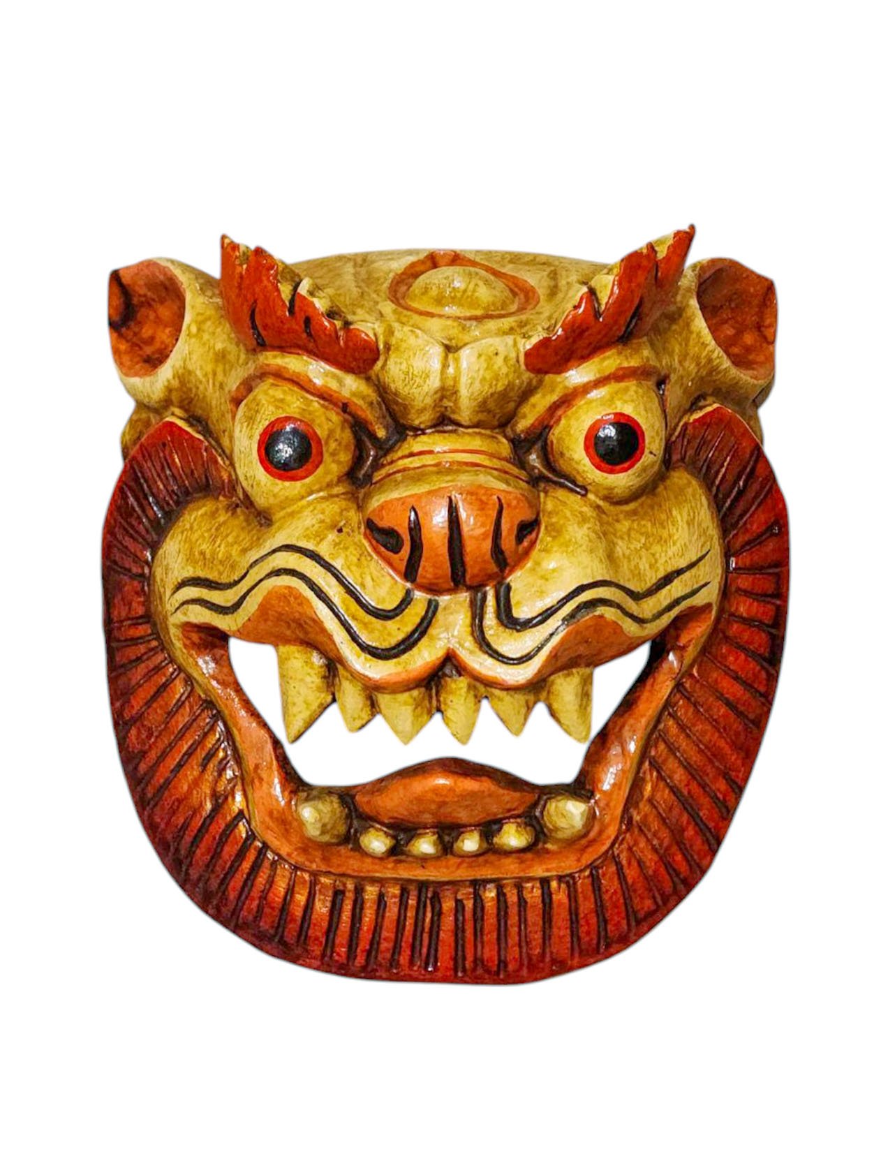 Buddhist Wooden Mask of Snow Lion, Tibetan Style Wtih Traditional Colors, Poplar Wood , Symbol of purity and fearlessness