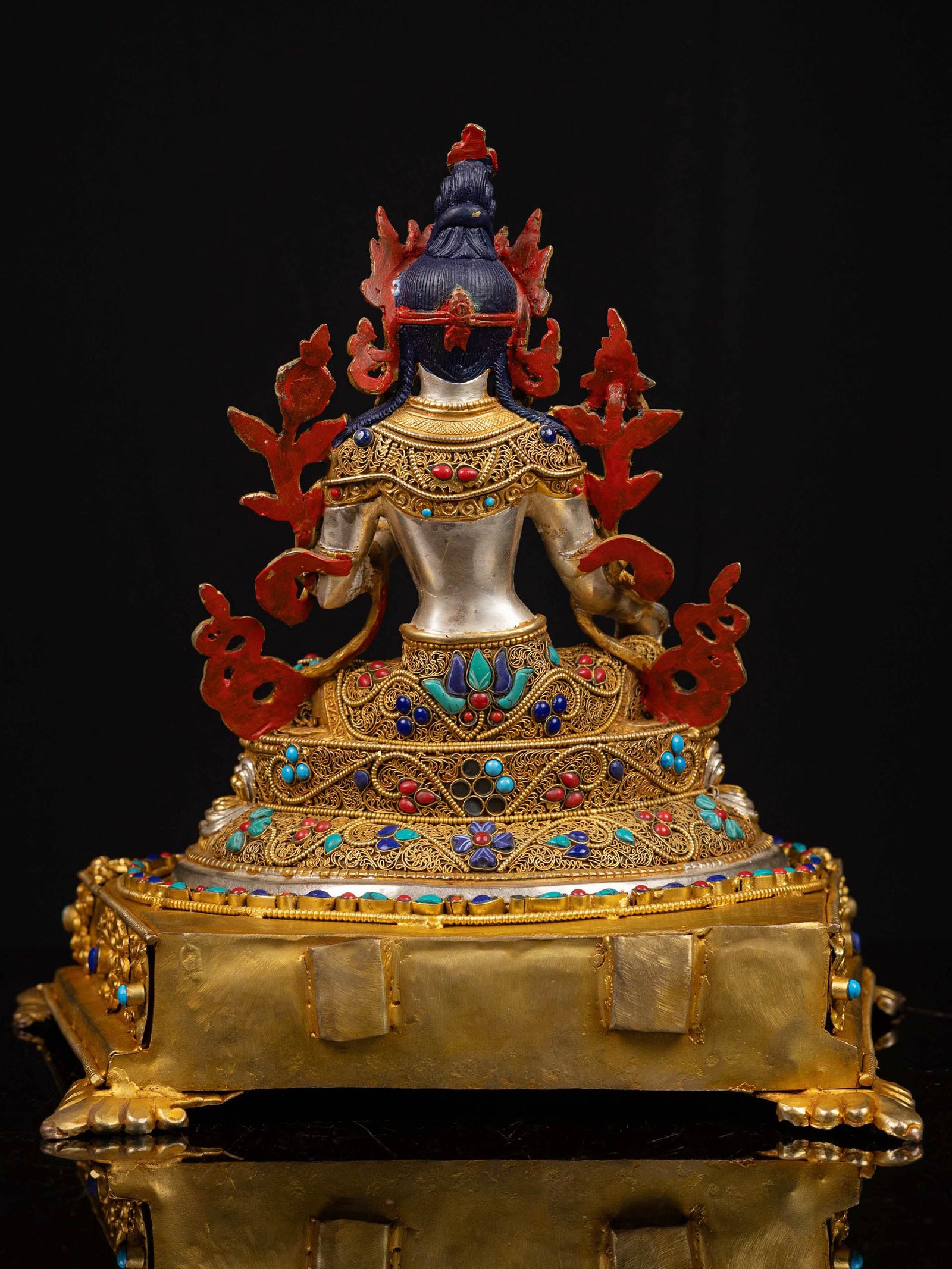 The Green Tara is adorned with an exquisite array of semi-precious stones, including turquoise, coral, and lapis lazuli. These stones are carefully selected and meticulously placed on the Green Tara's surface, adding a touch of opulence and enhancing its overall beauty. Each stone is thoughtfully positioned using a high-quality adhesive, ensuring secure and long-lasting attachment. The vibrant colors and unique patterns of the stones create a captivating contrast against the backdrop of the Green Tara, elevating its visual appeal and making it truly eye-catching. Read More