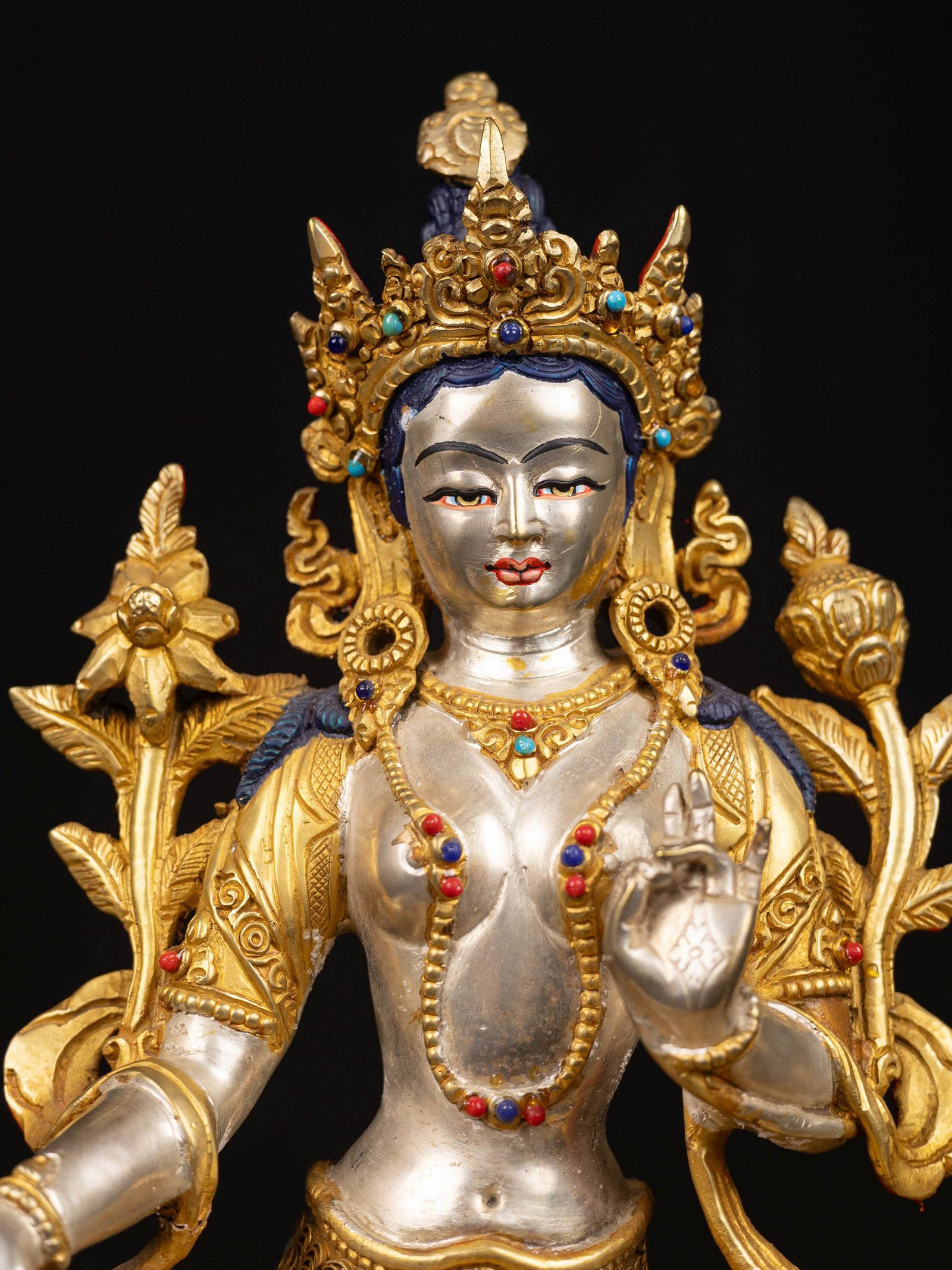 The face of Green Tara is painted with gold to enhance its significant features, particularly the eyes, and lips. This detailed painting is essential as it brings forth the crucial attributes of the expression of eyes and lips that metal carving alone cannot capture.