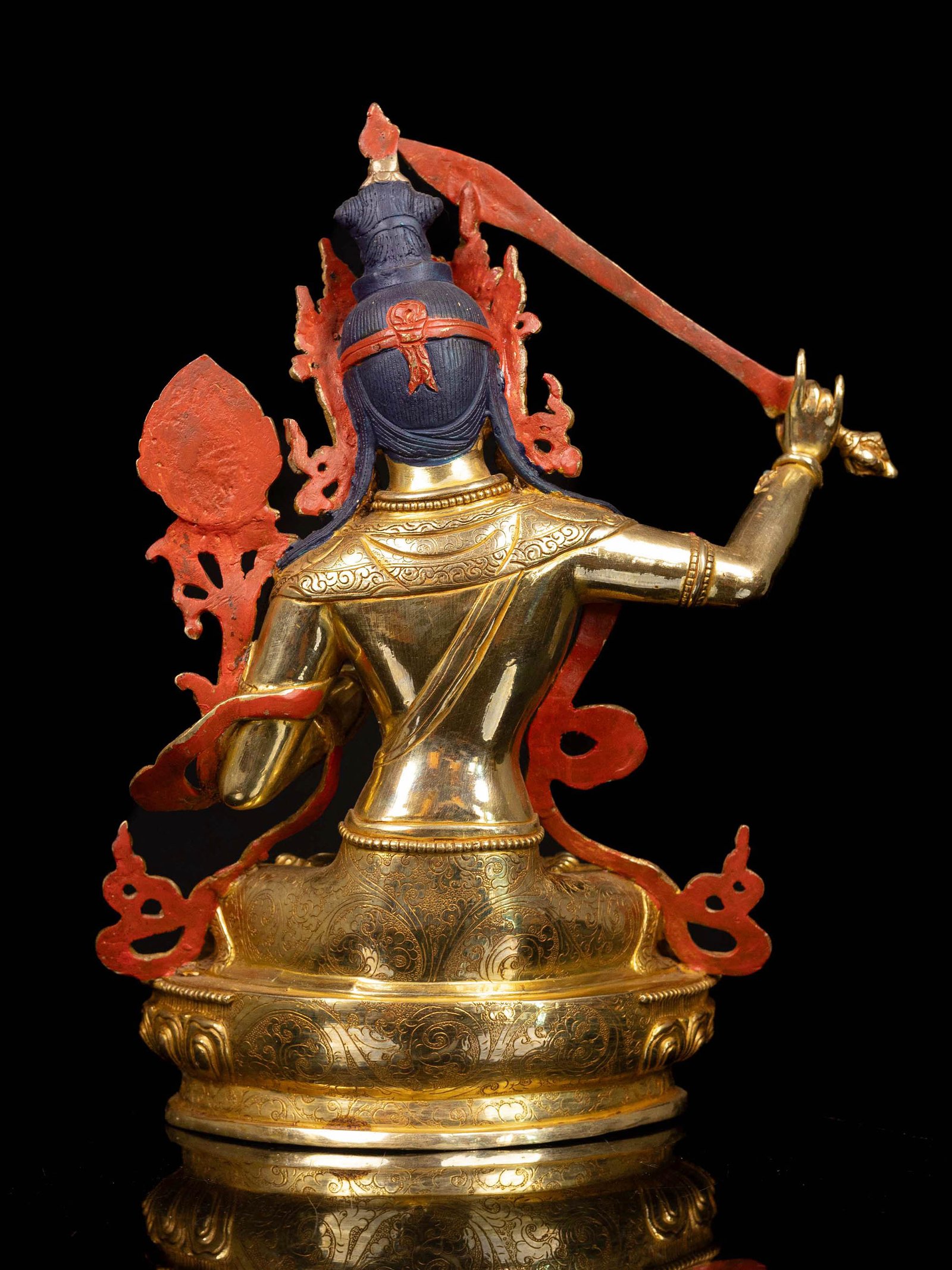 This Manjushri is finished with full gold plating. also known as mercury gold plating or fire gold plating. This traditional technique involves the application of a genuine layer of gold onto the Manjushri. Referred to as mercury gold plating, it is considered the correct and authentic form of gold plating in Nepal. Despite being more expensive than electroplating, this traditional mercury gold plating is gaining popularity again in Nepal. People are drawn to its authenticity, longevity, and the unmatched beauty it brings to the Manjushri. The resurgence of interest in this traditional form of gold plating reflects a growing appreciation for the craftsmanship and cultural heritage of Nepal Read More