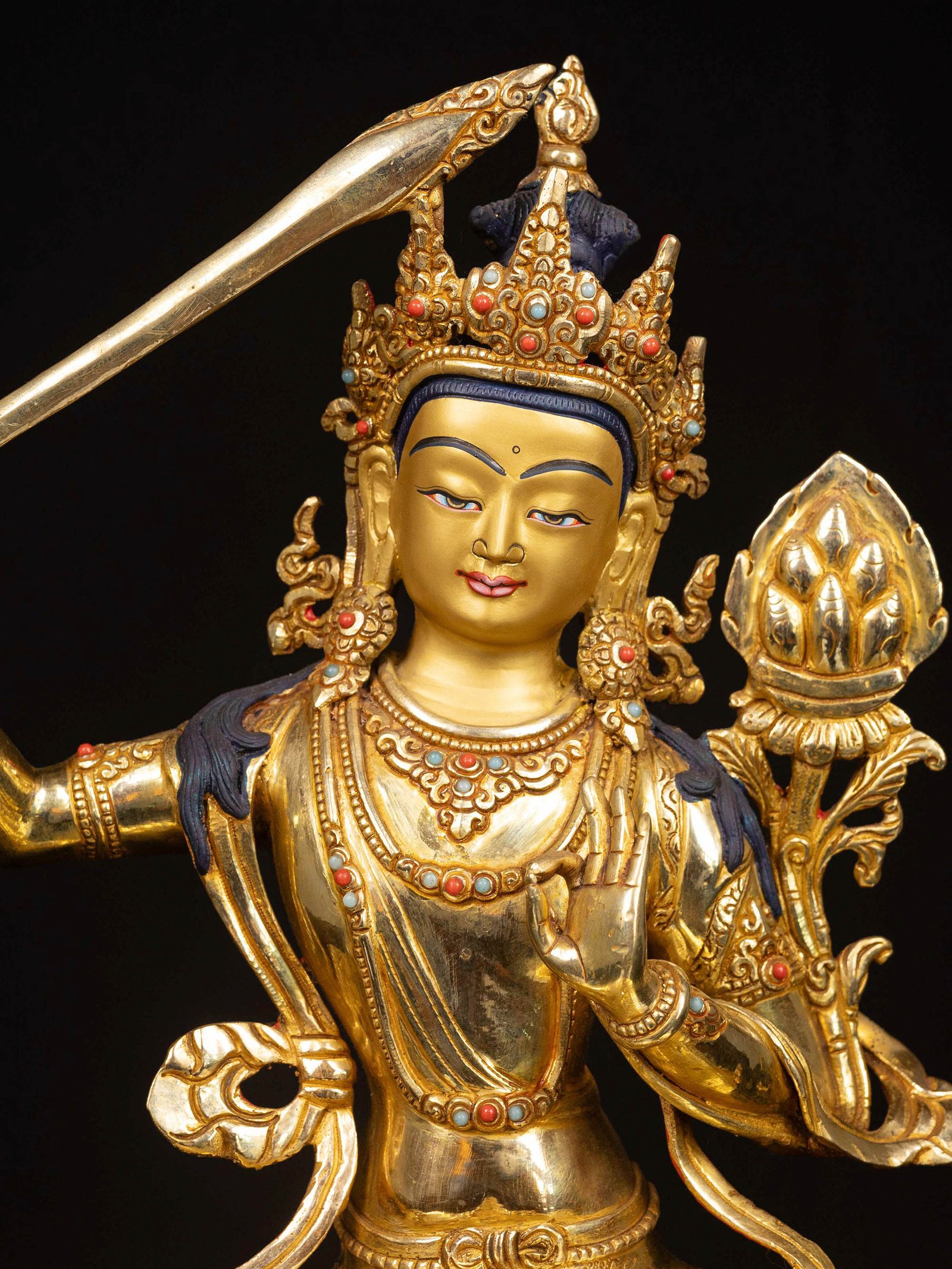 Manjushri, Buddhist Handmade Statue, Full Gold Plated, Face Painted , Wisdom Buddha, cutting through ignorance with the sword of insight