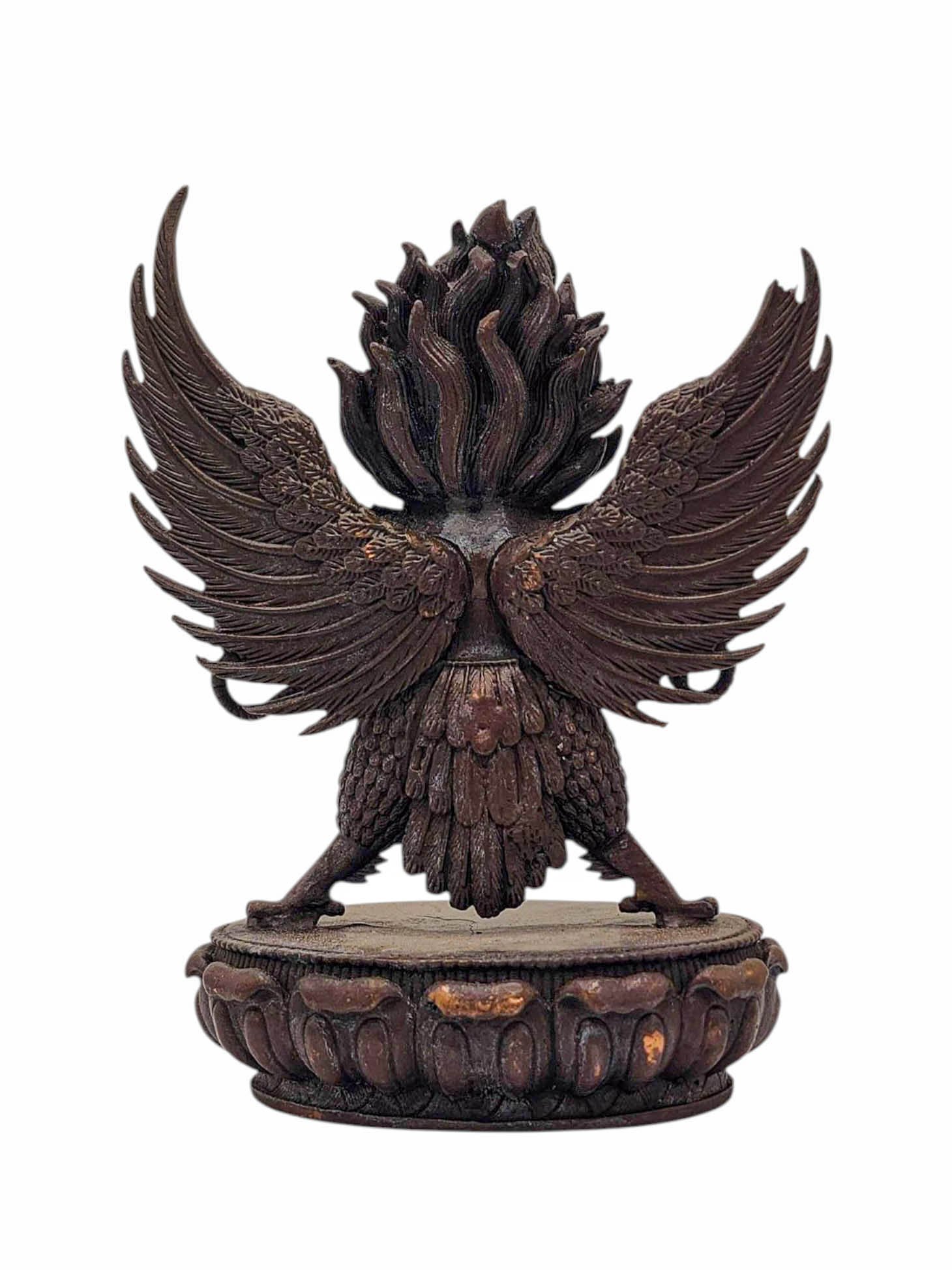 This Garuda has been meticulously treated with a chocolate color antique patina. The intention behind this patina is to replicate the appearance of a copper statue that has gracefully aged over a century. Unlike a simple coat of paint, this patina is not applied superficially and is designed to endure. It undergoes an artificial oxidation process that adds depth and character, while also serving as a protective layer against natural oxidation.