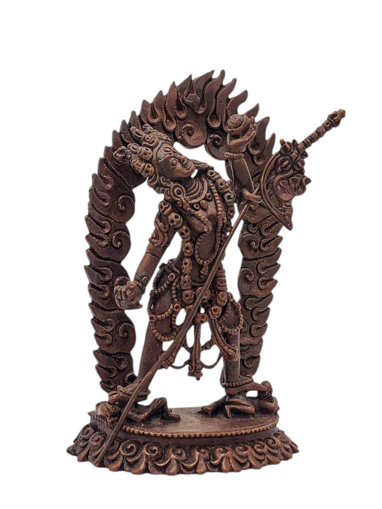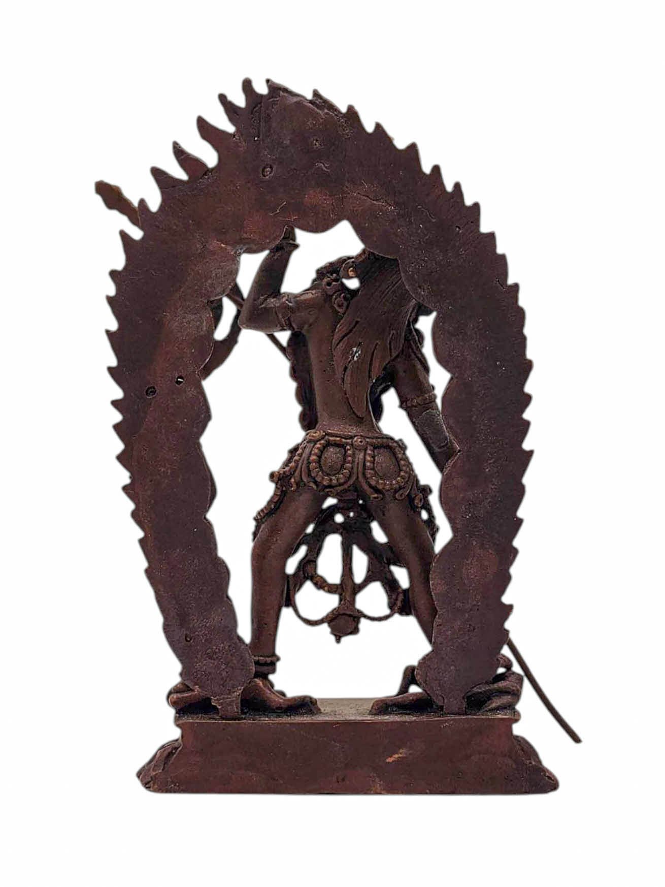 This Vajrayogini has been meticulously treated with a chocolate color antique patina. The intention behind this patina is to replicate the appearance of a copper statue that has gracefully aged over a century. Unlike a simple coat of paint, this patina is not applied superficially and is designed to endure. It undergoes an artificial oxidation process that adds depth and character, while also serving as a protective layer against natural oxidation.