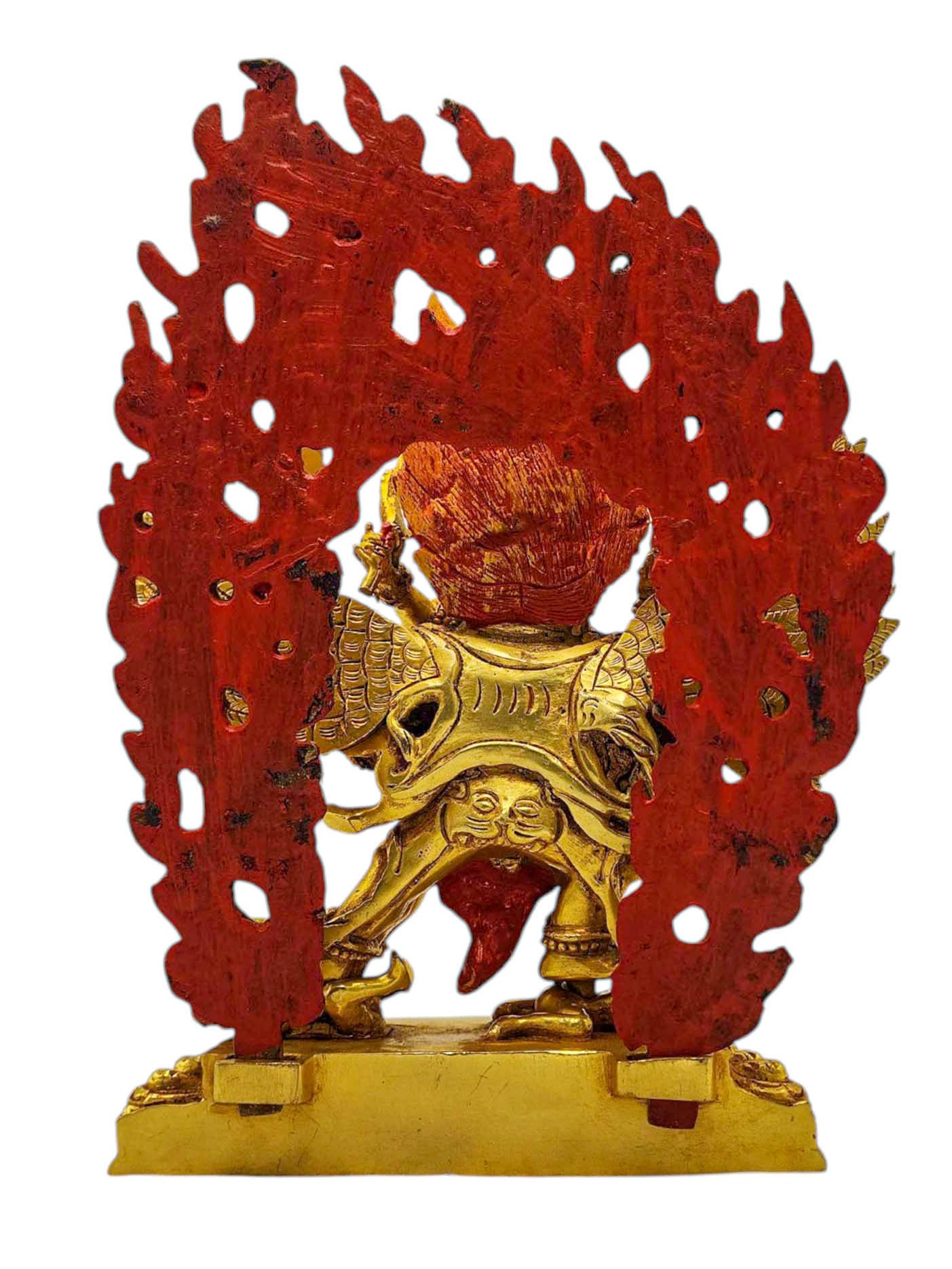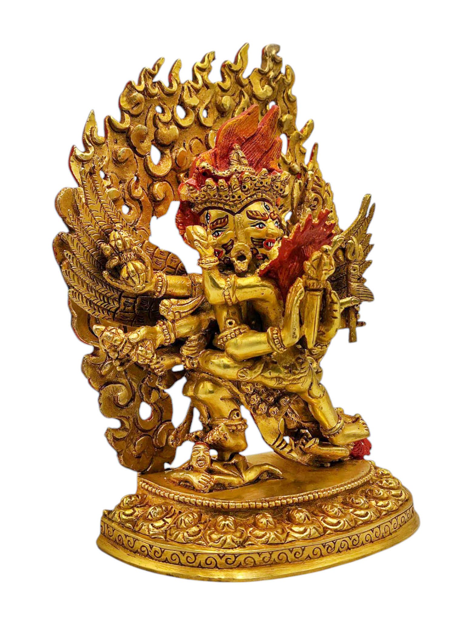 The face of Vajrakilaya is painted with gold to enhance its significant features, particularly the eyes, and lips. This detailed painting is essential as it brings forth the crucial attributes of the expression of eyes and lips that metal carving alone cannot capture.