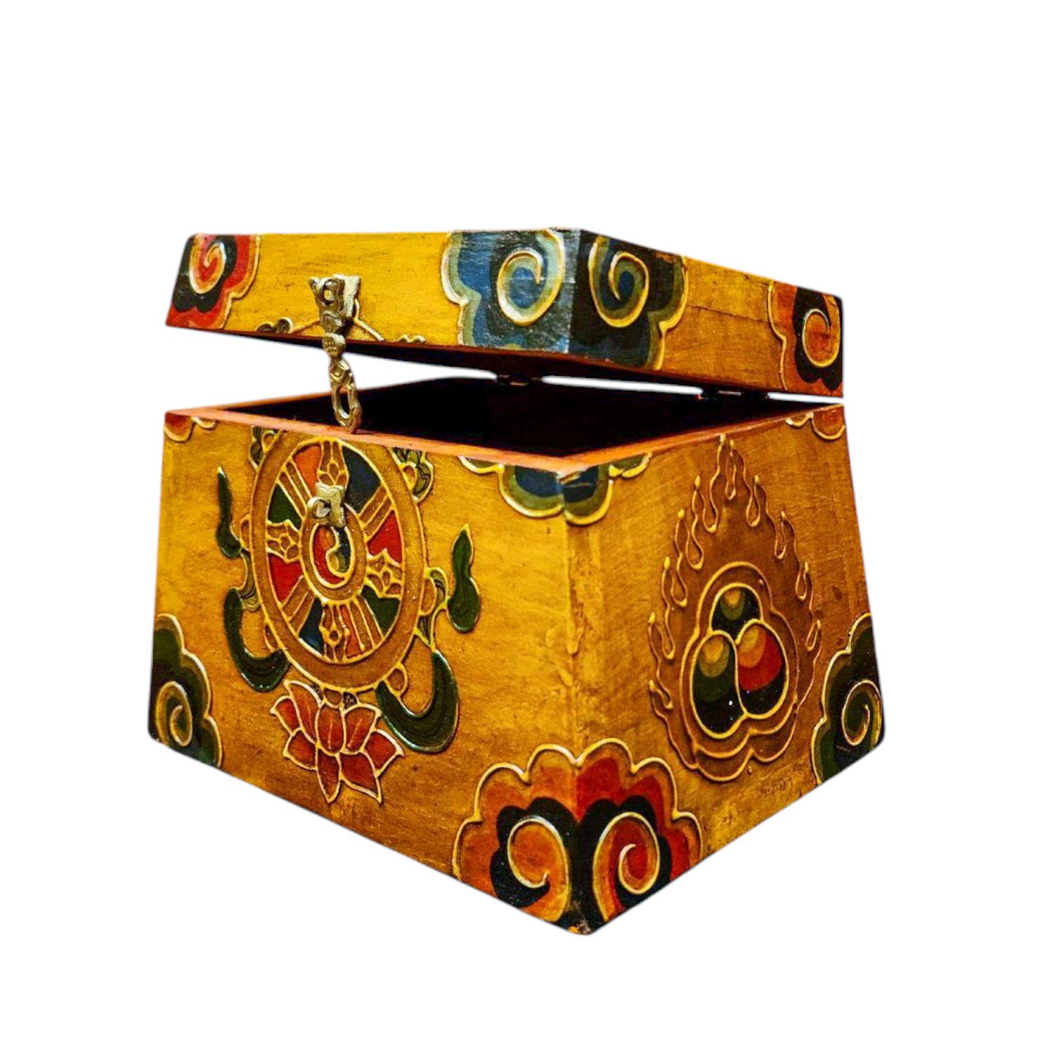 Buddhist Wooden Box with Ashtamangala Design, Tibetan Style with Traditional Colors |