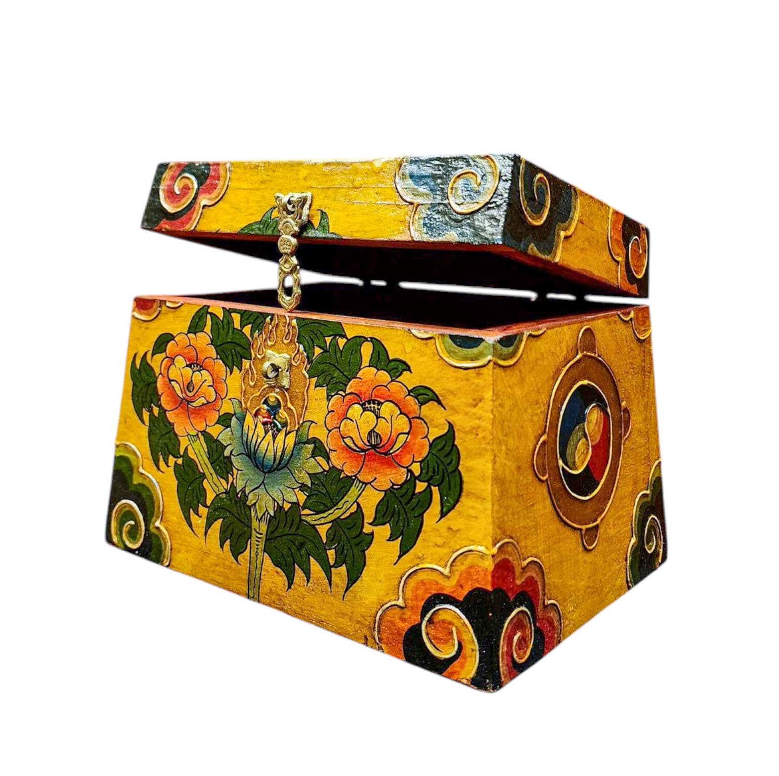 A Tibetan wooden box is a handcrafted storage container made from wood and often adorned with intricate Tibetan motifs and vibrant colors. These boxes are typically crafted by skilled artisans using traditional techniques passed down through generations. The decorations on the box usually include symbols of good fortune, such as lotus flowers, endless knots, dragons, or mythical creatures, and are painted in vivid hues like red, blue, green, and gold. These motifs not only add to the aesthetic appeal but also carry significant cultural and spiritual meanings in Tibetan Buddhism. Read More