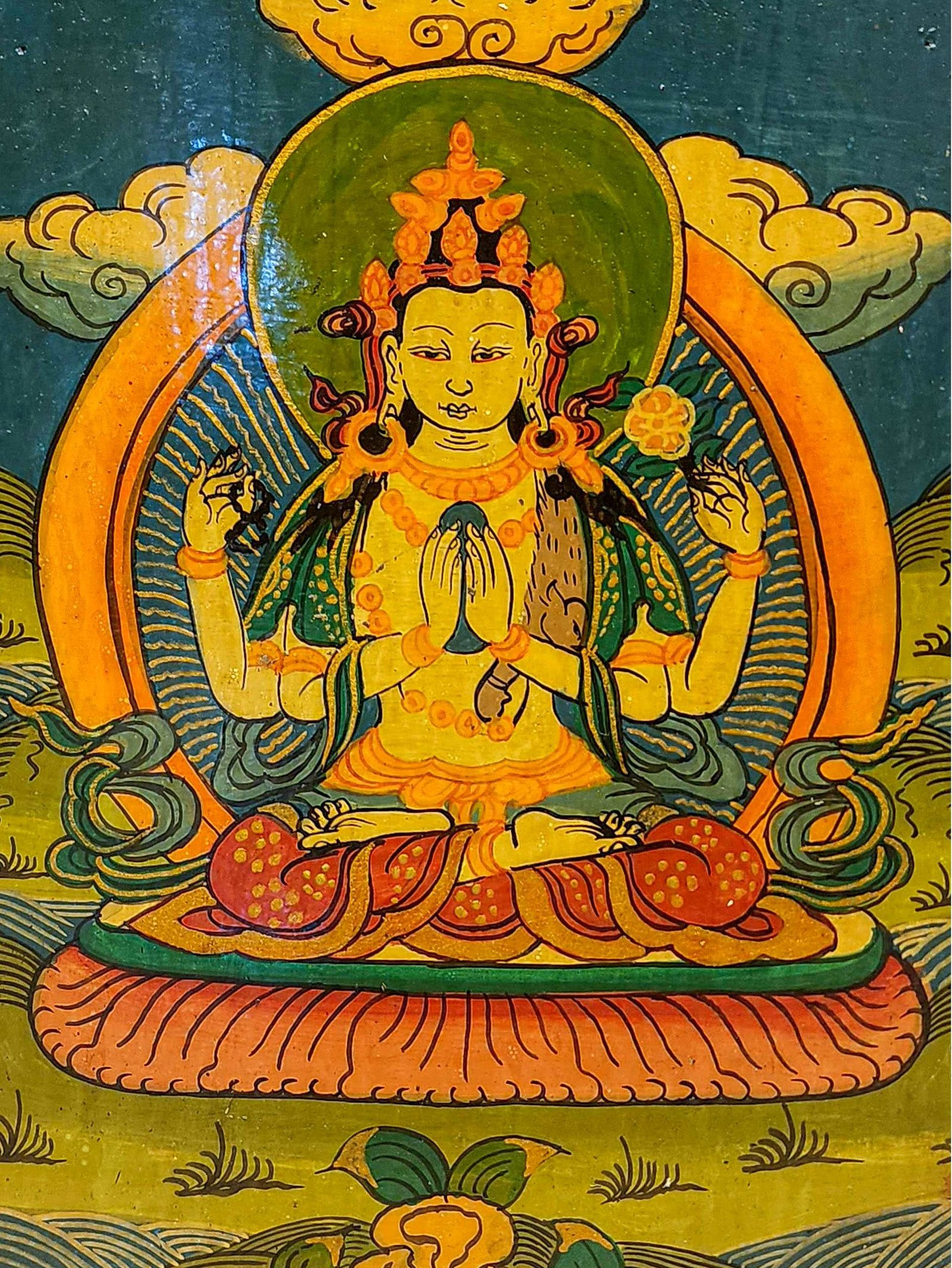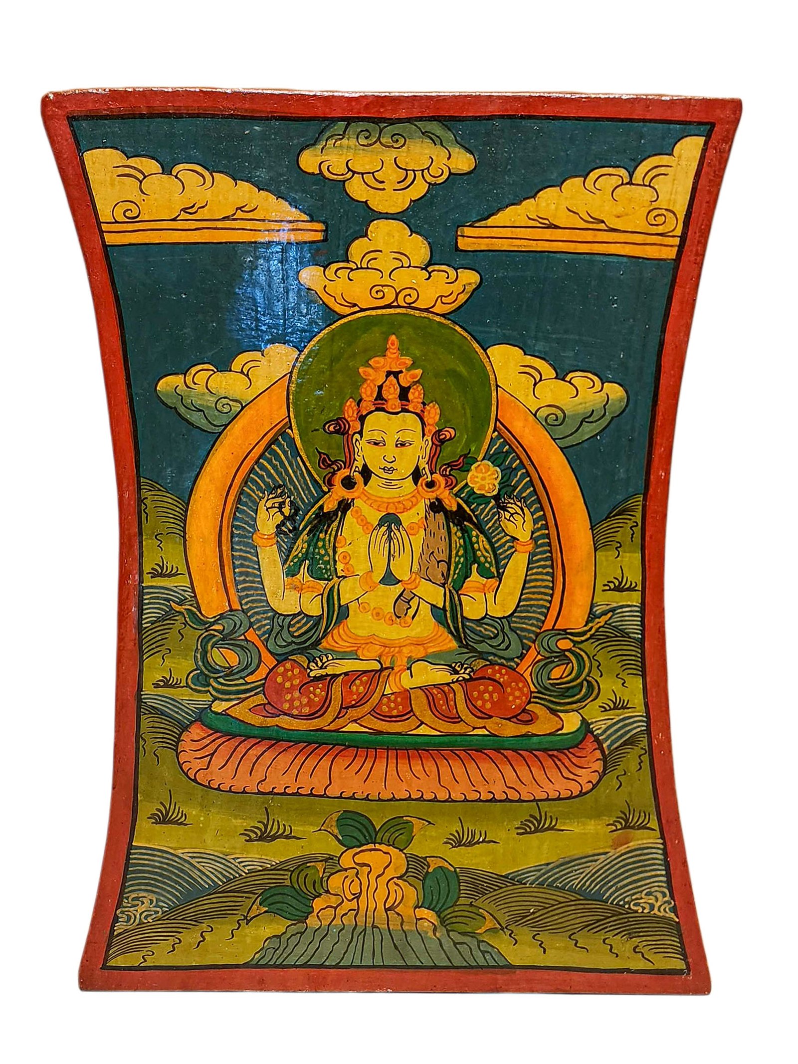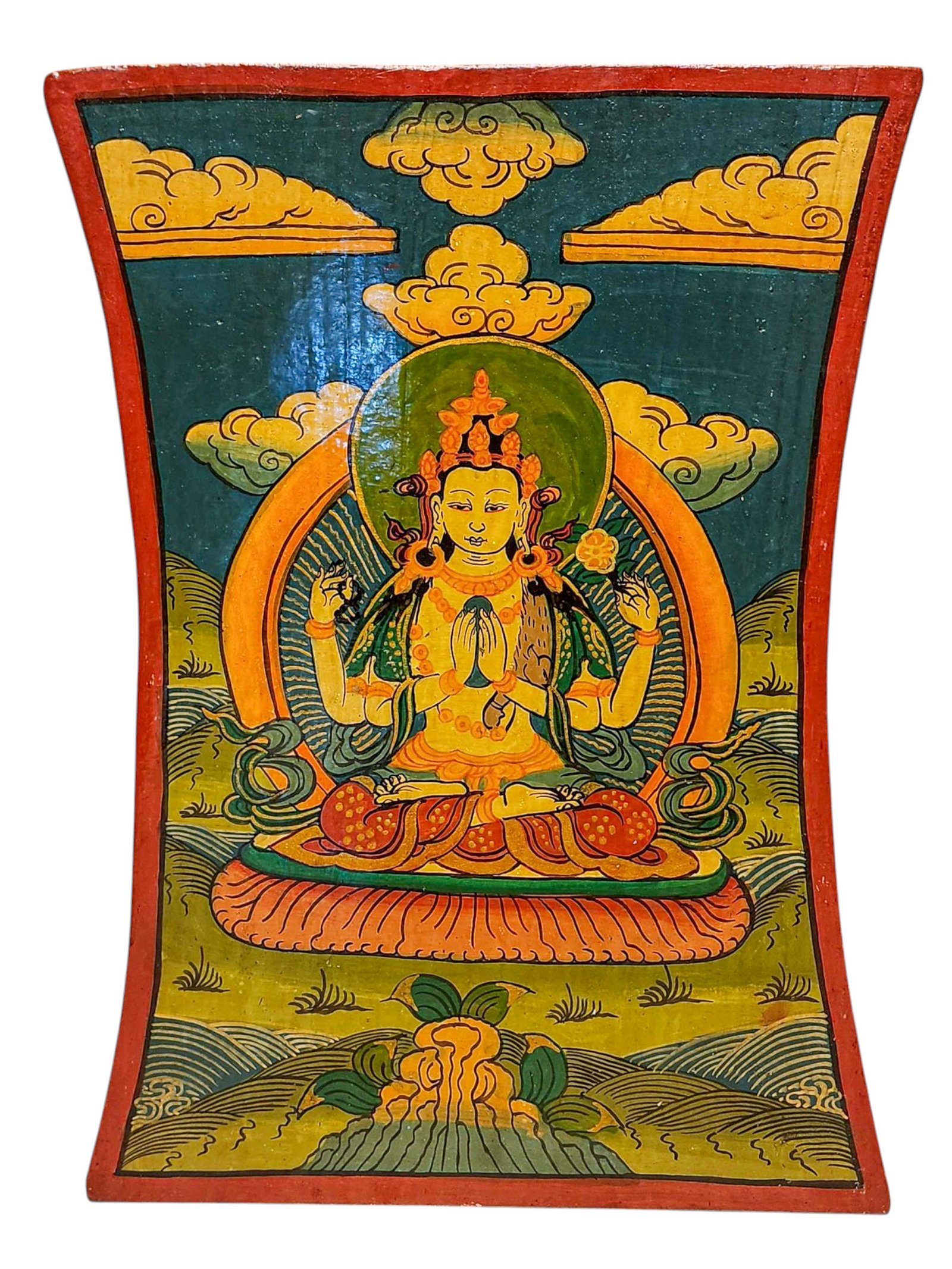 Wooden Thangka Or Wall Hanging of Chenrezig, Natural Colour Finishing, Hand Painted |