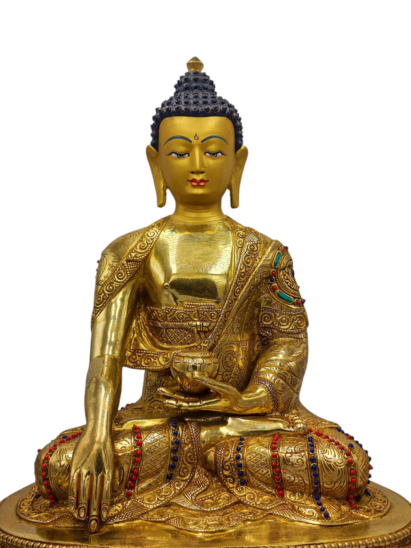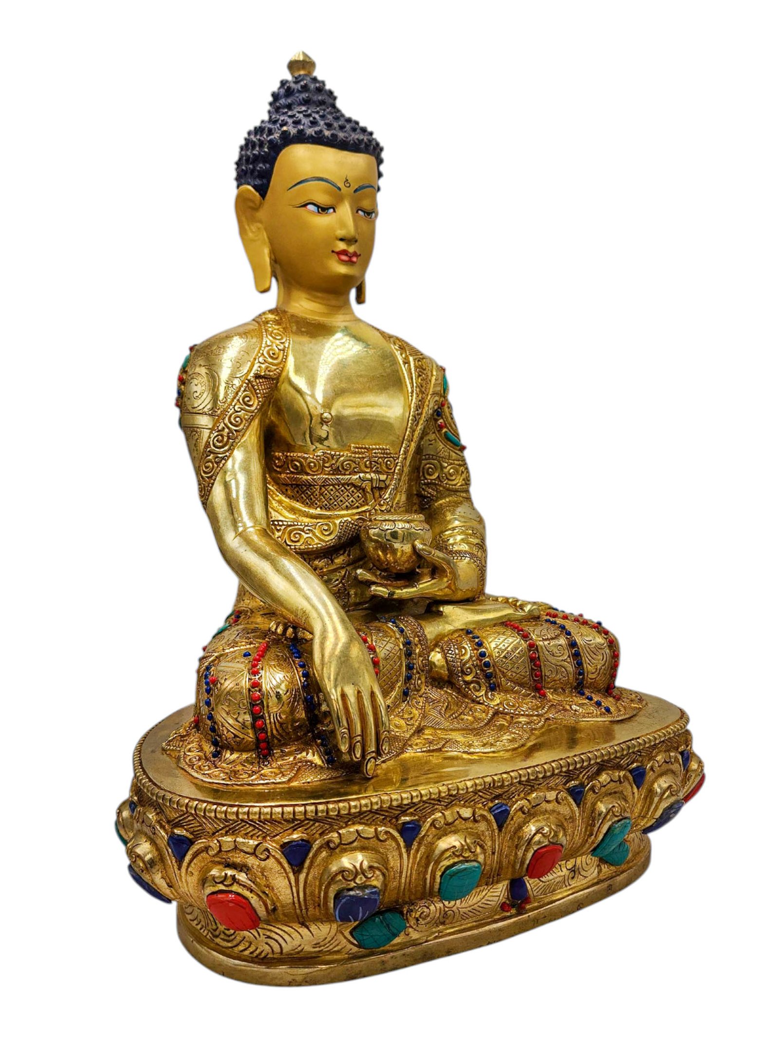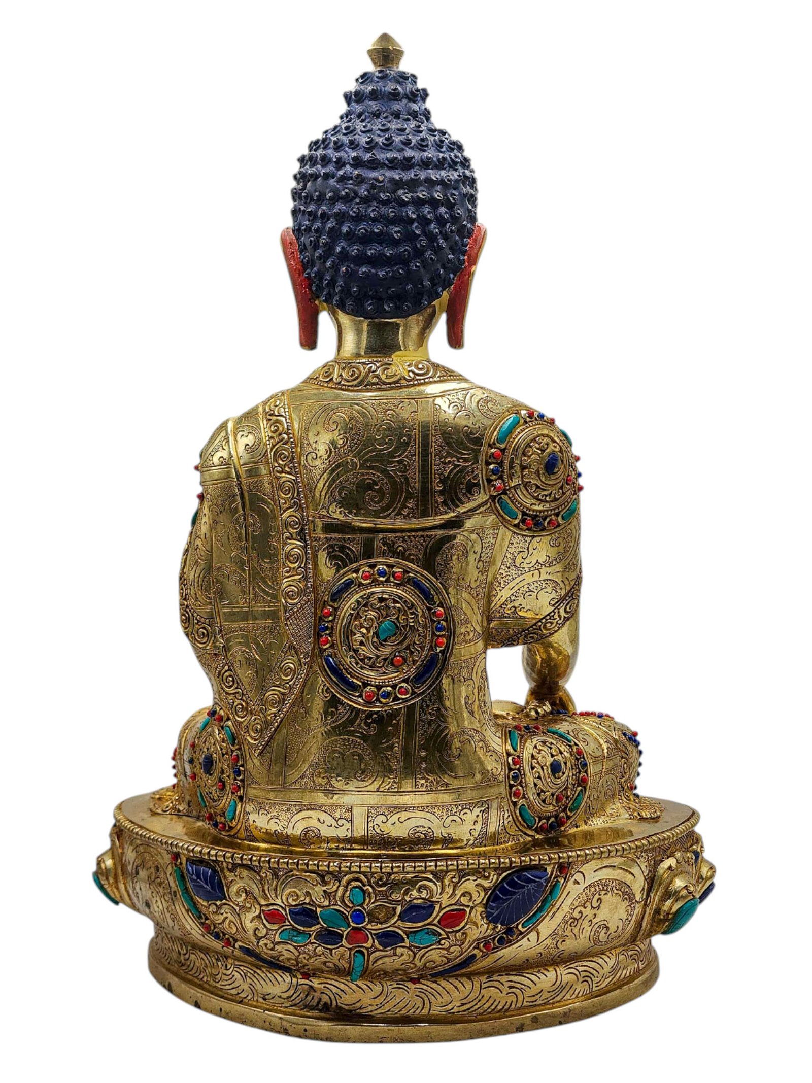 The Shakyamuni Buddha is adorned with an exquisite array of semi-precious stones, including turquoise, coral, and lapis lazuli. These stones are carefully selected and meticulously placed on the Shakyamuni Buddha's surface, adding a touch of opulence and enhancing its overall beauty. Each stone is thoughtfully positioned using a high-quality adhesive, ensuring secure and long-lasting attachment. The vibrant colors and unique patterns of the stones create a captivating contrast against the backdrop of the Shakyamuni Buddha, elevating its visual appeal and making it truly eye-catching. Read More