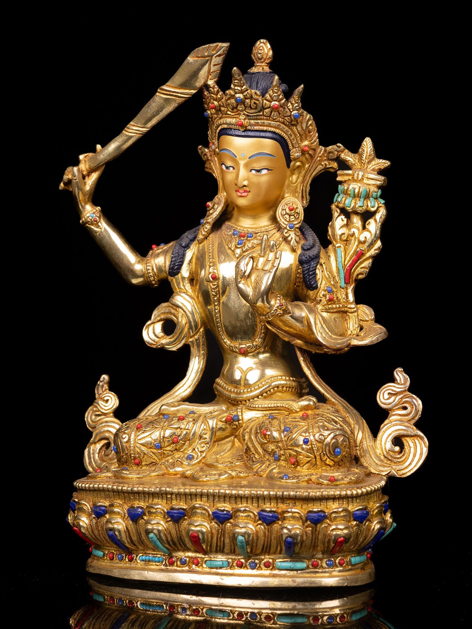 The Manjushri is adorned with an exquisite array of semi-precious stones, including turquoise, coral, and lapis lazuli. These stones are carefully selected and meticulously placed on the Manjushri's surface, adding a touch of opulence and enhancing its overall beauty. Each stone is thoughtfully positioned using a high-quality adhesive, ensuring secure and long-lasting attachment. The vibrant colors and unique patterns of the stones create a captivating contrast against the backdrop of the Manjushri, elevating its visual appeal and making it truly eye-catching. Read More