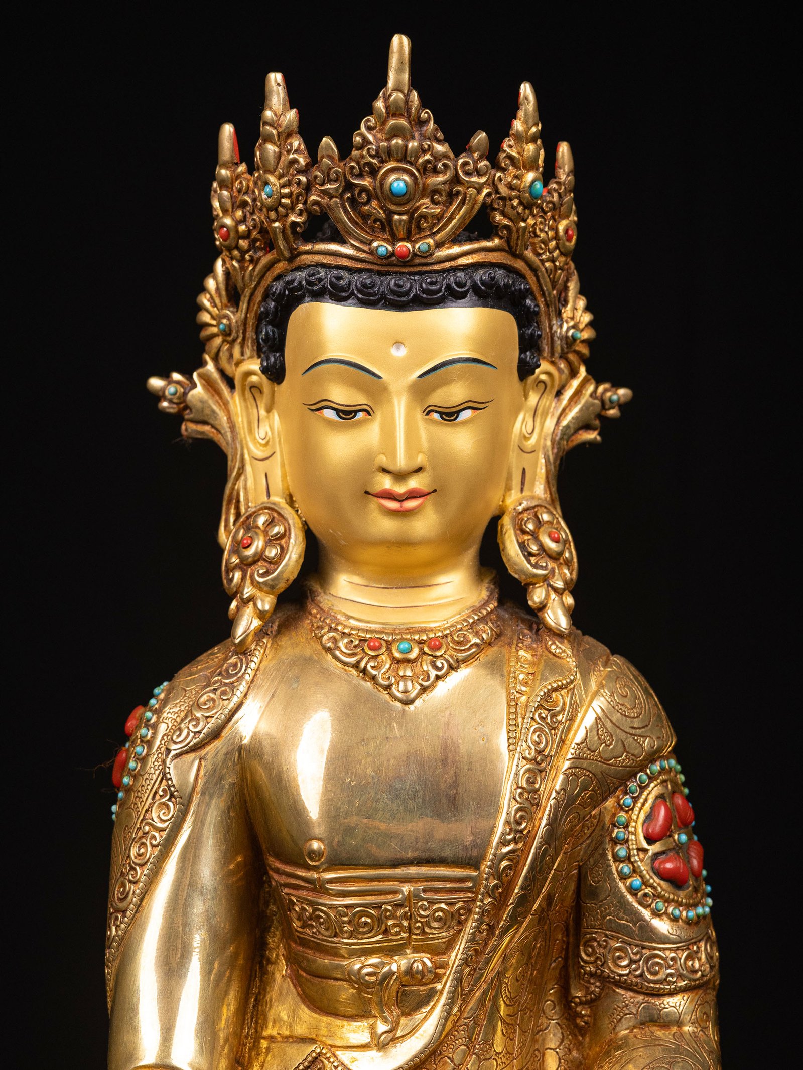 The face of Shakyamuni Buddha is painted with gold to enhance its significant features, particularly the eyes, and lips. This detailed painting is essential as it brings forth the crucial attributes of the expression of eyes and lips that metal carving alone cannot capture.