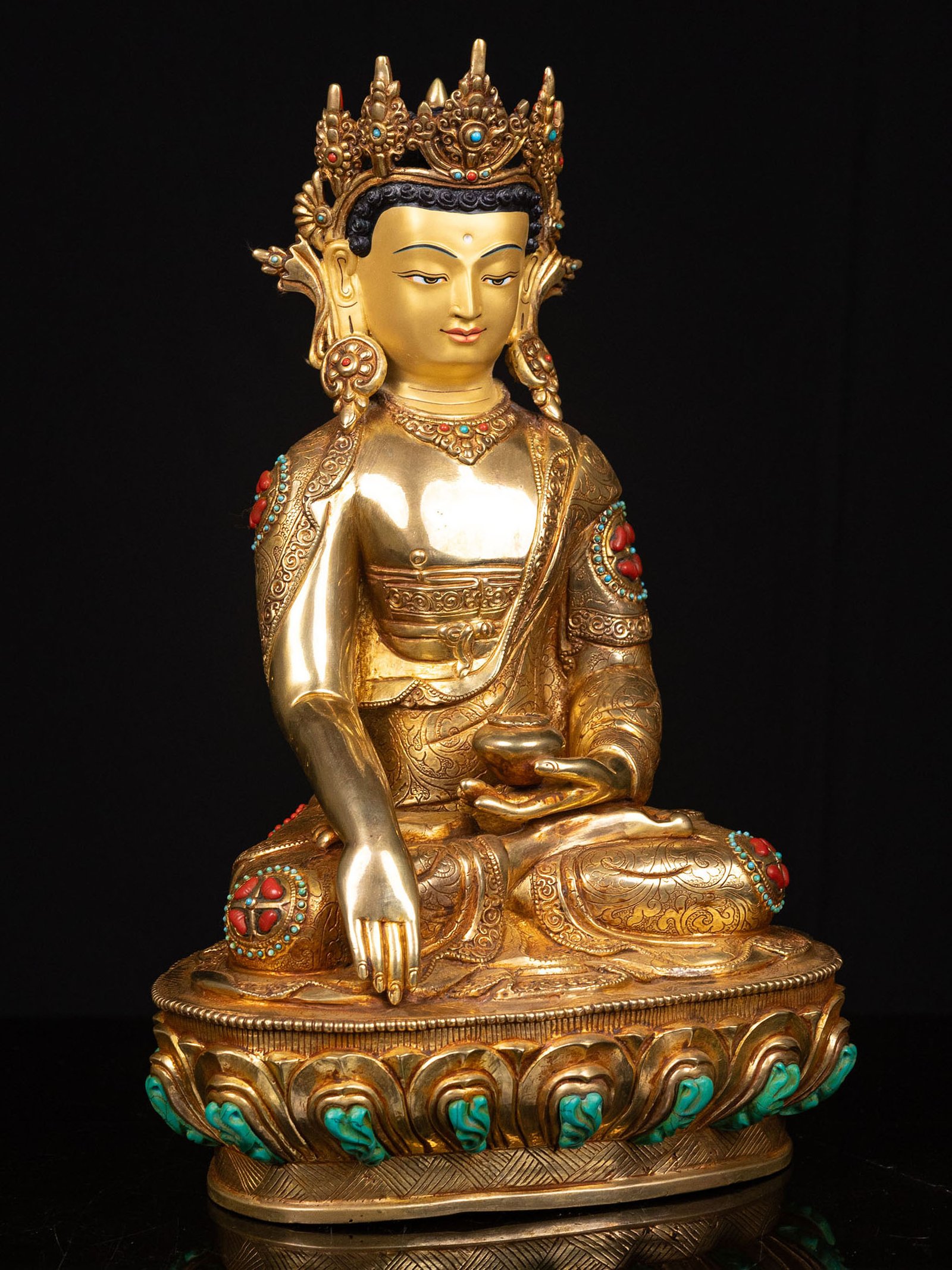 The Shakyamuni Buddha is adorned with an exquisite array of semi-precious stones, including turquoise, coral, and lapis lazuli. These stones are carefully selected and meticulously placed on the Shakyamuni Buddha's surface, adding a touch of opulence and enhancing its overall beauty. Each stone is thoughtfully positioned using a high-quality adhesive, ensuring secure and long-lasting attachment. The vibrant colors and unique patterns of the stones create a captivating contrast against the backdrop of the Shakyamuni Buddha, elevating its visual appeal and making it truly eye-catching. Read More