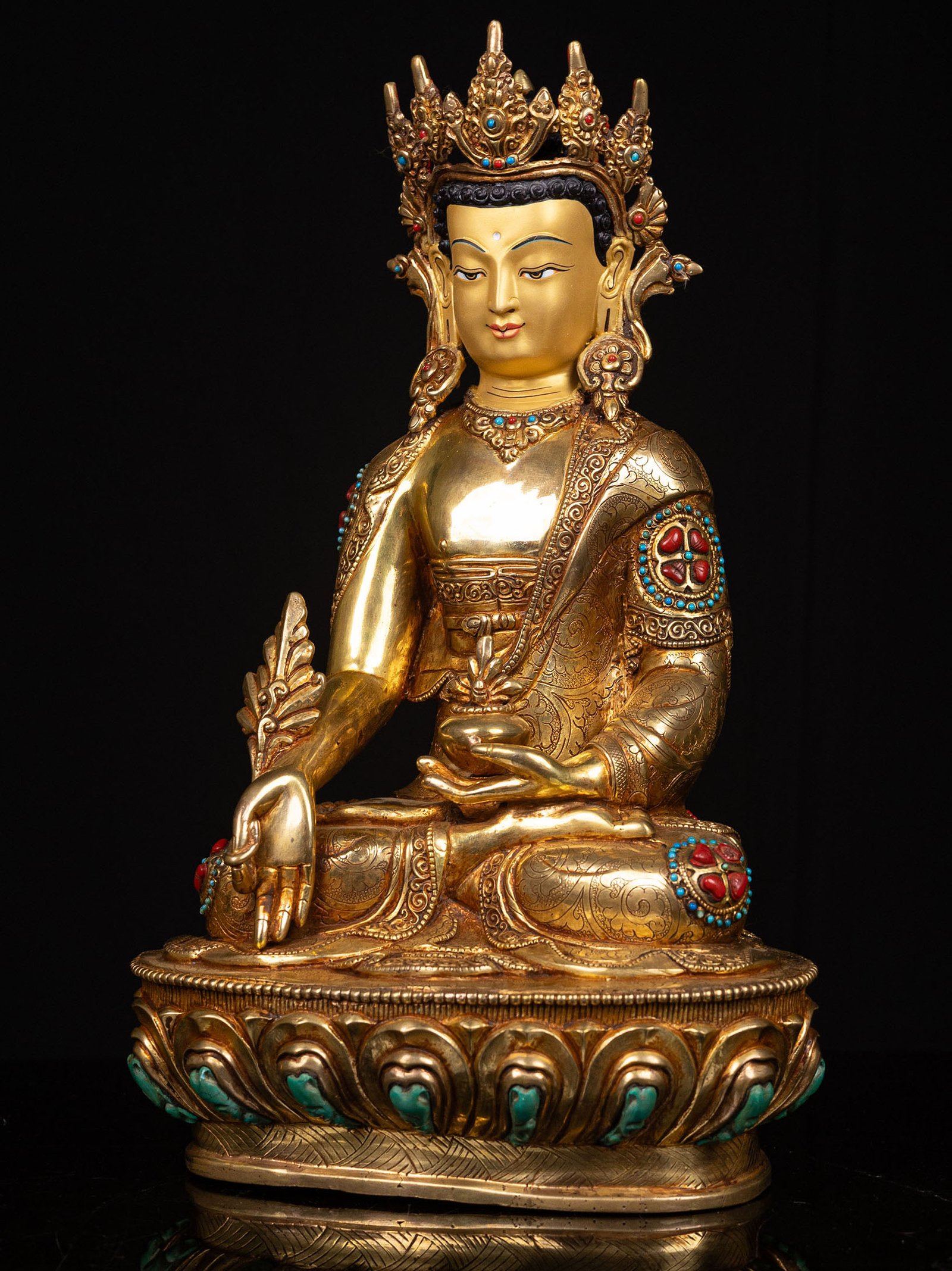 Medicine Buddha with Crown, Buddhist Handmade Statue, Full Gold Plated, Stone Setting, Face Painted , Healer of physical and spiritual ailments, bringer of health and peace