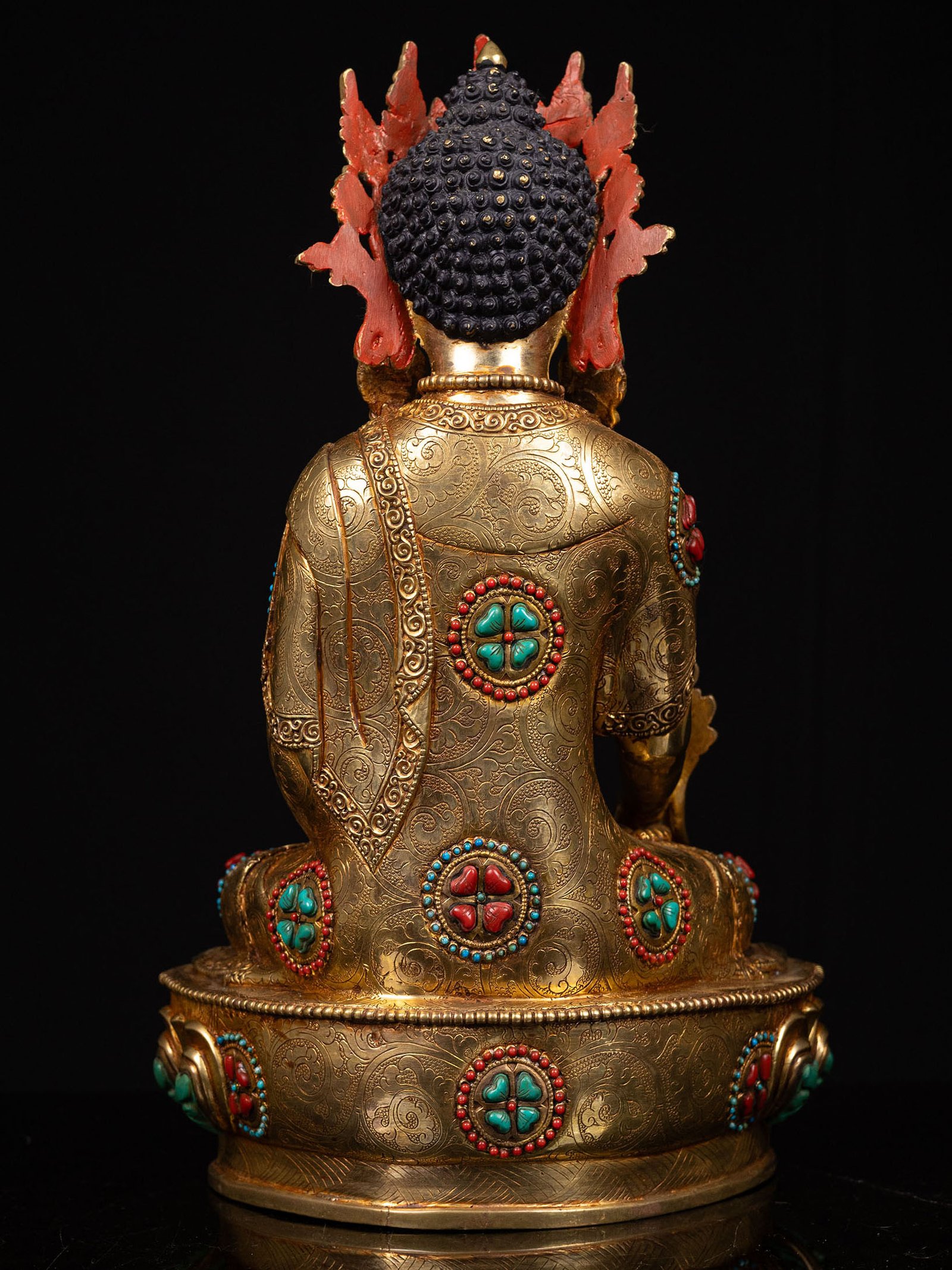 The Medicine Buddha is adorned with an exquisite array of semi-precious stones, including turquoise, coral, and lapis lazuli. These stones are carefully selected and meticulously placed on the Medicine Buddha's surface, adding a touch of opulence and enhancing its overall beauty. Each stone is thoughtfully positioned using a high-quality adhesive, ensuring secure and long-lasting attachment. The vibrant colors and unique patterns of the stones create a captivating contrast against the backdrop of the Medicine Buddha, elevating its visual appeal and making it truly eye-catching. Read More