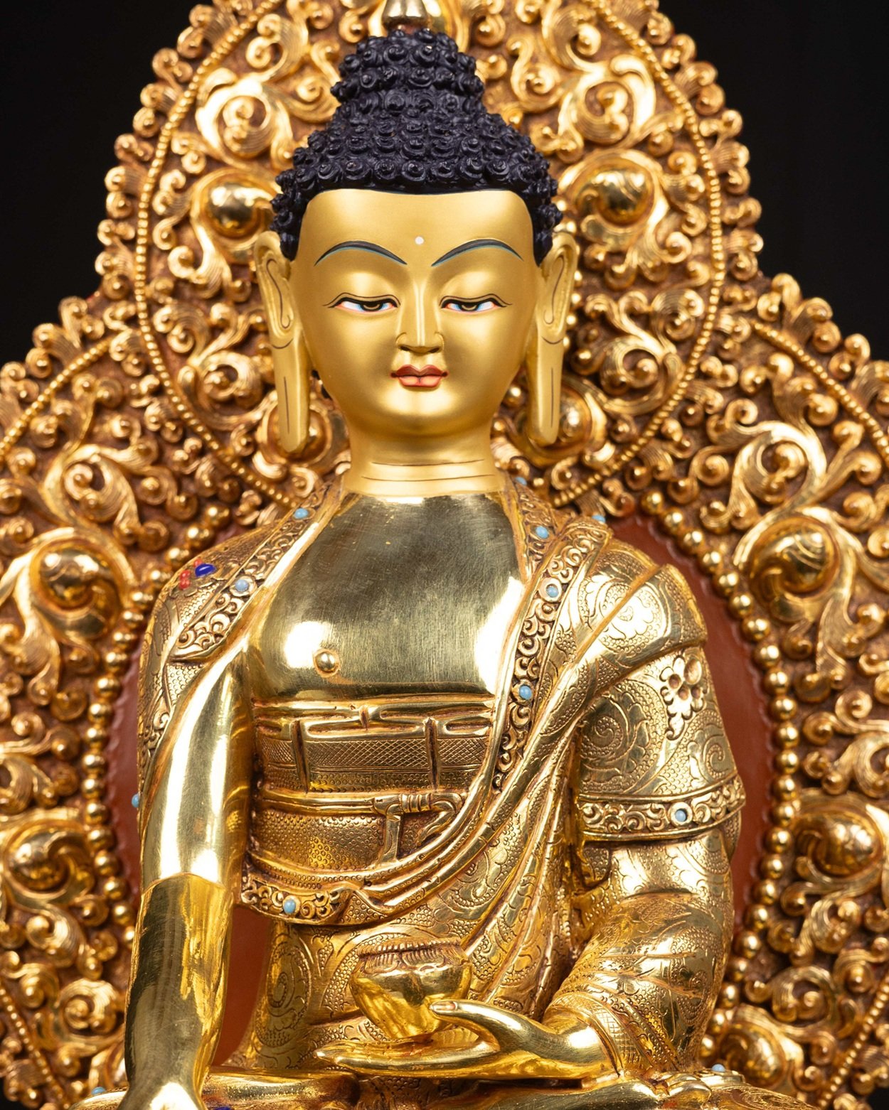 The face of Shakyamuni Buddha is painted with gold to enhance its significant features, particularly the eyes, and lips. This detailed painting is essential as it brings forth the crucial attributes of the expression of eyes and lips that metal carving alone cannot capture.