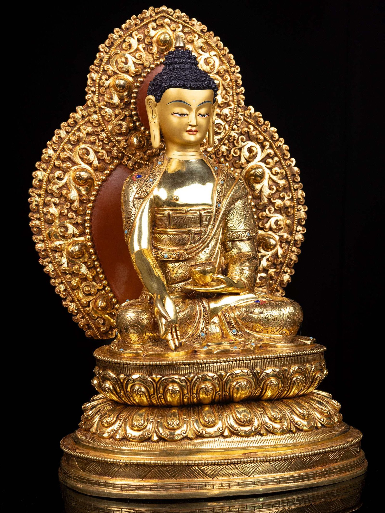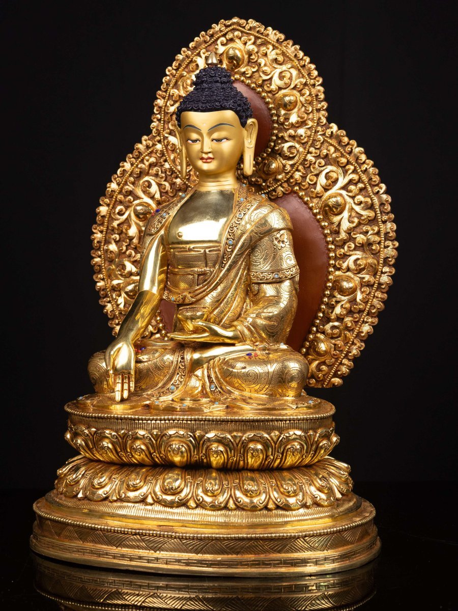 This Shakyamuni Buddha is finished with full gold plating. also known as mercury gold plating or fire gold plating. This traditional technique involves the application of a genuine layer of gold onto the Shakyamuni Buddha. Referred to as mercury gold plating, it is considered the correct and authentic form of gold plating in Nepal. Despite being more expensive than electroplating, this traditional mercury gold plating is gaining popularity again in Nepal. People are drawn to its authenticity, longevity, and the unmatched beauty it brings to the Shakyamuni Buddha. The resurgence of interest in this traditional form of gold plating reflects a growing appreciation for the craftsmanship and cultural heritage of Nepal Read More