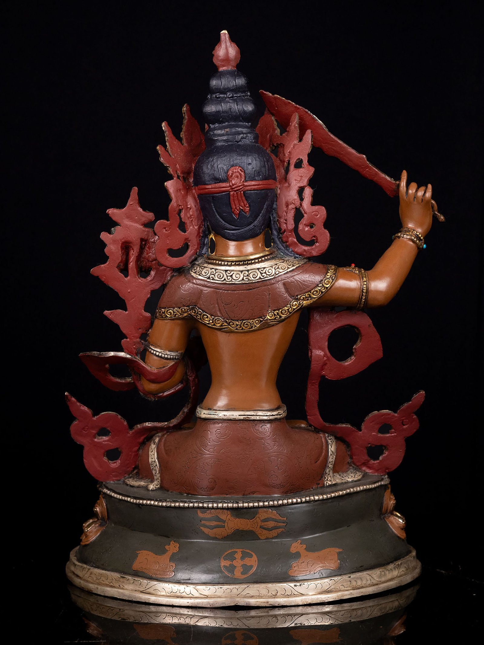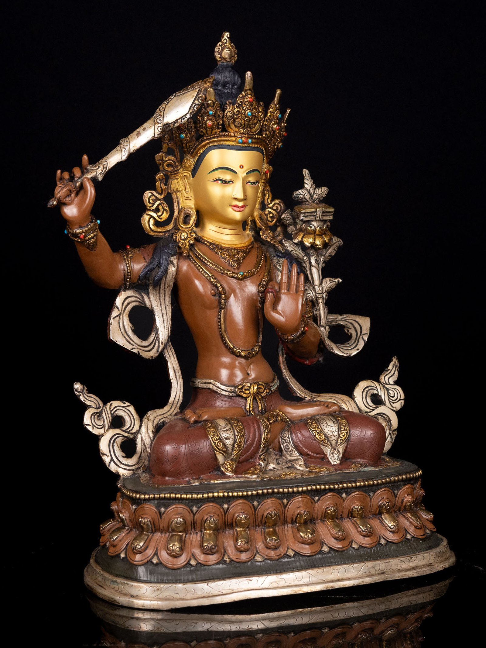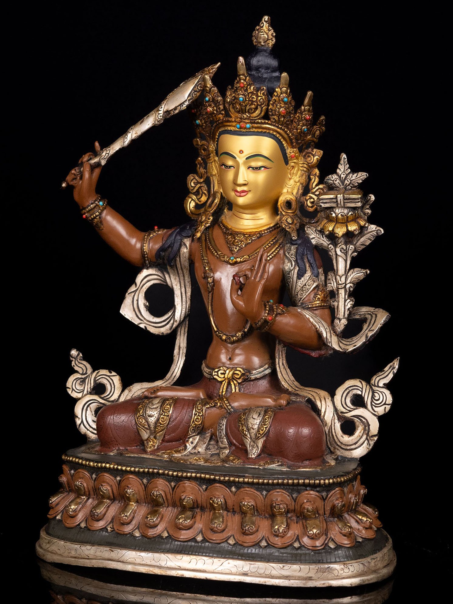 Master Quality, Manjushri, Buddhist Handmade Statue, Partly Gold Plated, Thangka Color Finishing, Stone Setting, Face Painted |