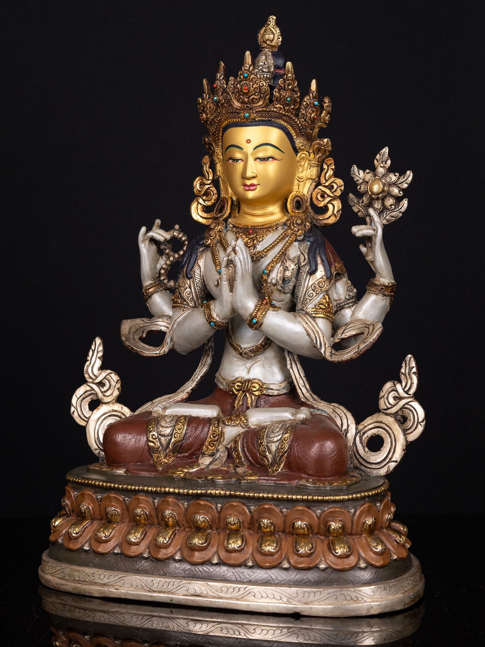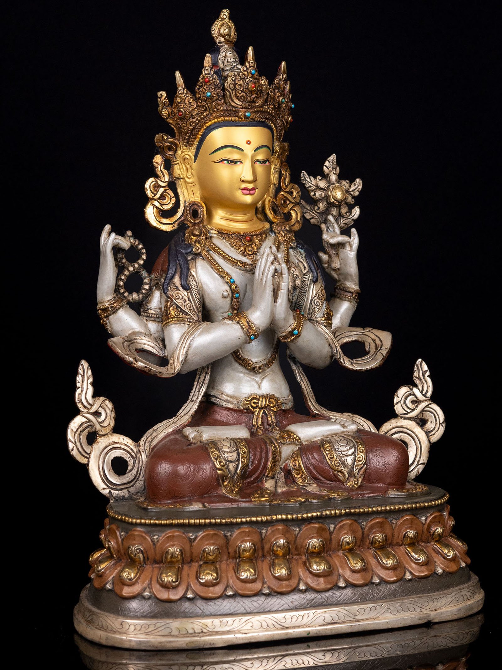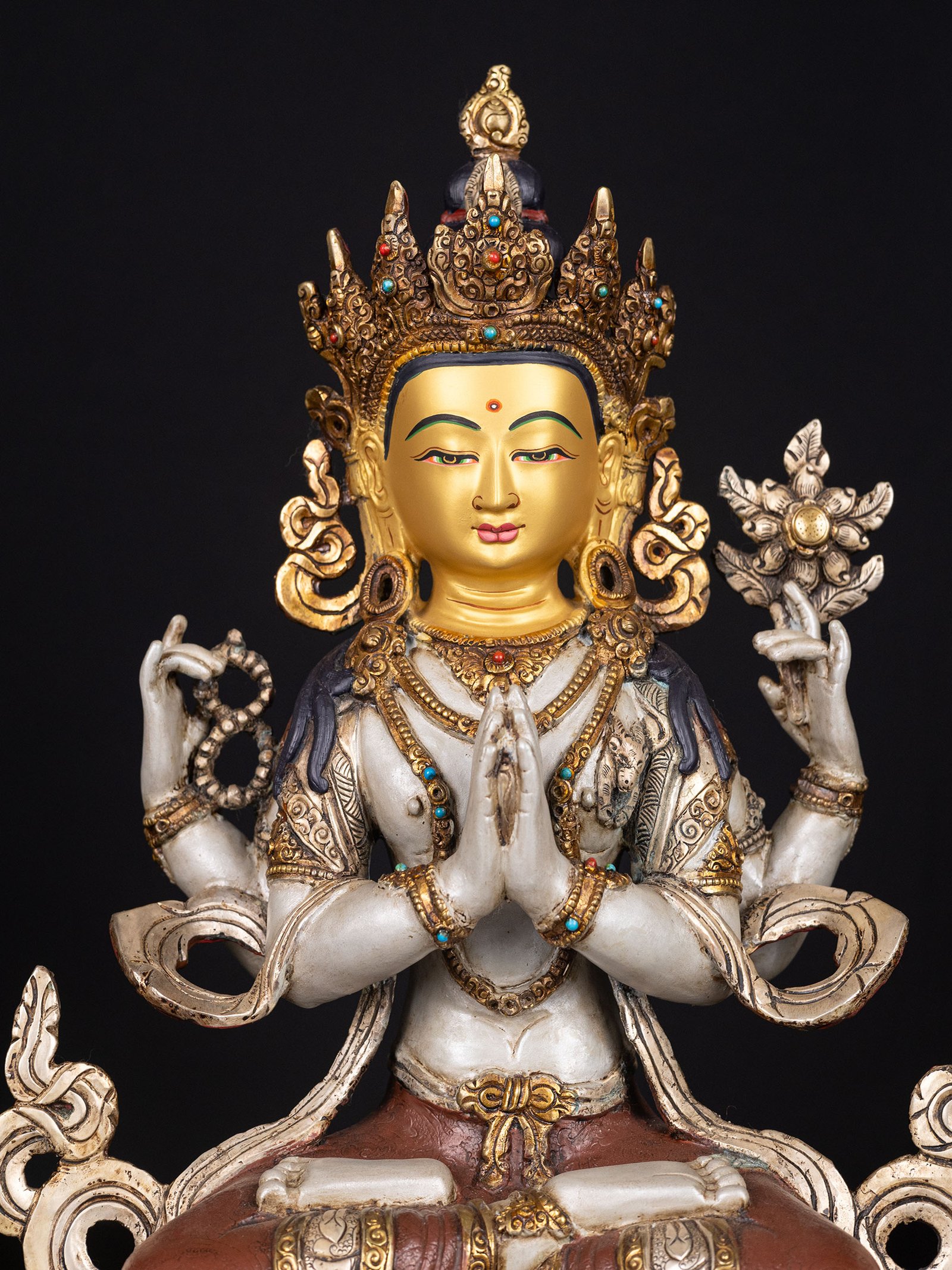 Master Quality, Chenrezig, Buddhist Handmade Statue, Partly Gold Plated, Thangka Color Finishing, Stone Setting, Face Painted |