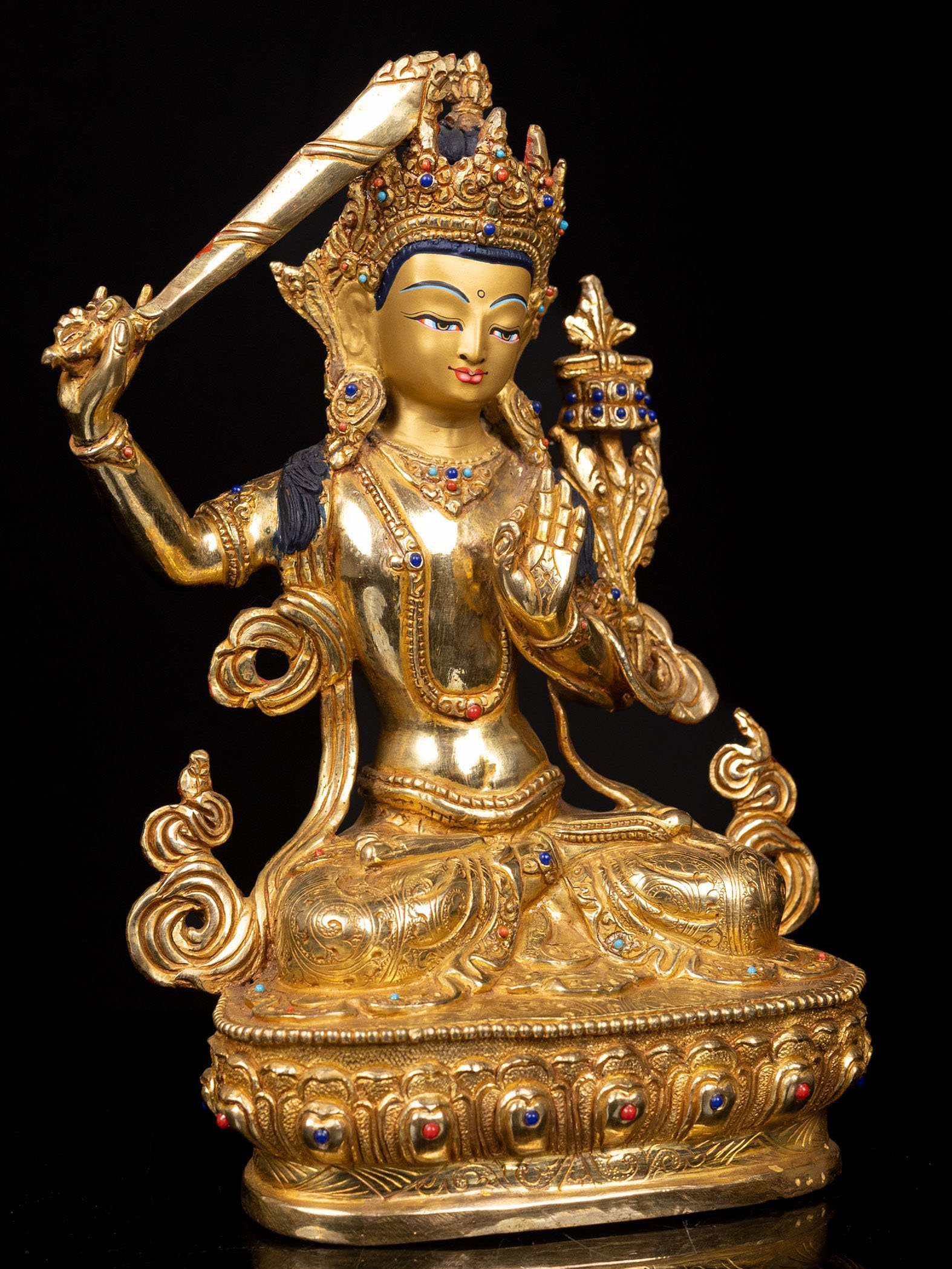 Manjushri, Buddhist Handmade Statue, Full Gold Plated, Face Painted , Wisdom Buddha, cutting through ignorance with the sword of insight