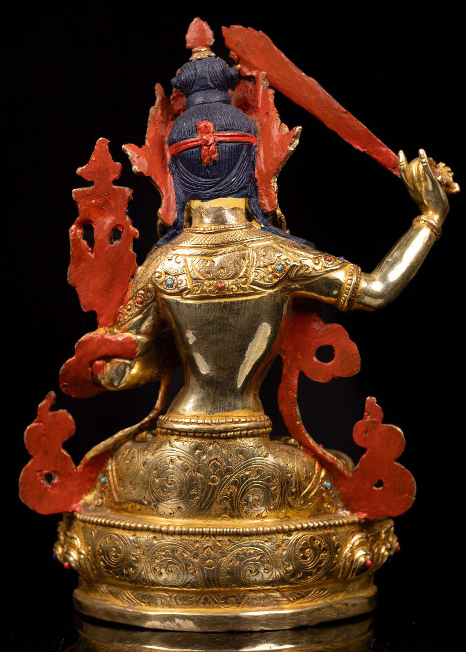This Manjushri is finished with full gold plating. also known as mercury gold plating or fire gold plating. This traditional technique involves the application of a genuine layer of gold onto the Manjushri. Referred to as mercury gold plating, it is considered the correct and authentic form of gold plating in Nepal. Despite being more expensive than electroplating, this traditional mercury gold plating is gaining popularity again in Nepal. People are drawn to its authenticity, longevity, and the unmatched beauty it brings to the Manjushri. The resurgence of interest in this traditional form of gold plating reflects a growing appreciation for the craftsmanship and cultural heritage of Nepal Read More