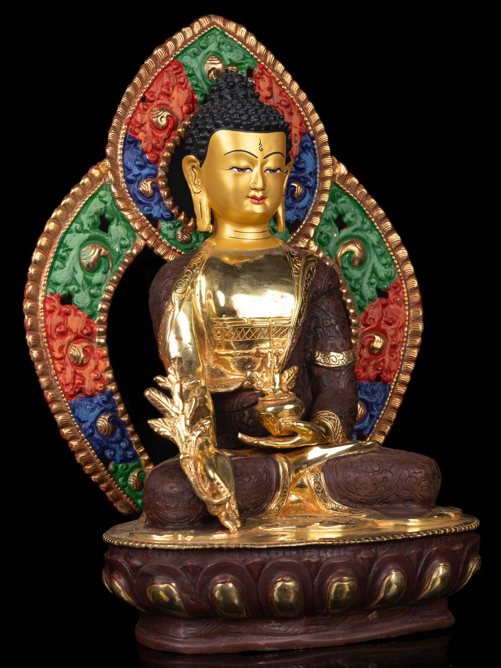 Medicine Buddha with Parwa, Buddhist Handmade Statue, Partly Gold Plated, Thangka Color Finishing, Face Painted , Healer of physical and spiritual ailments, bringer of health and peace